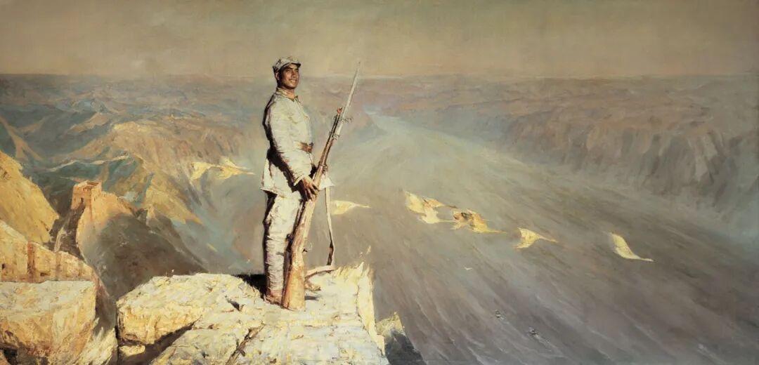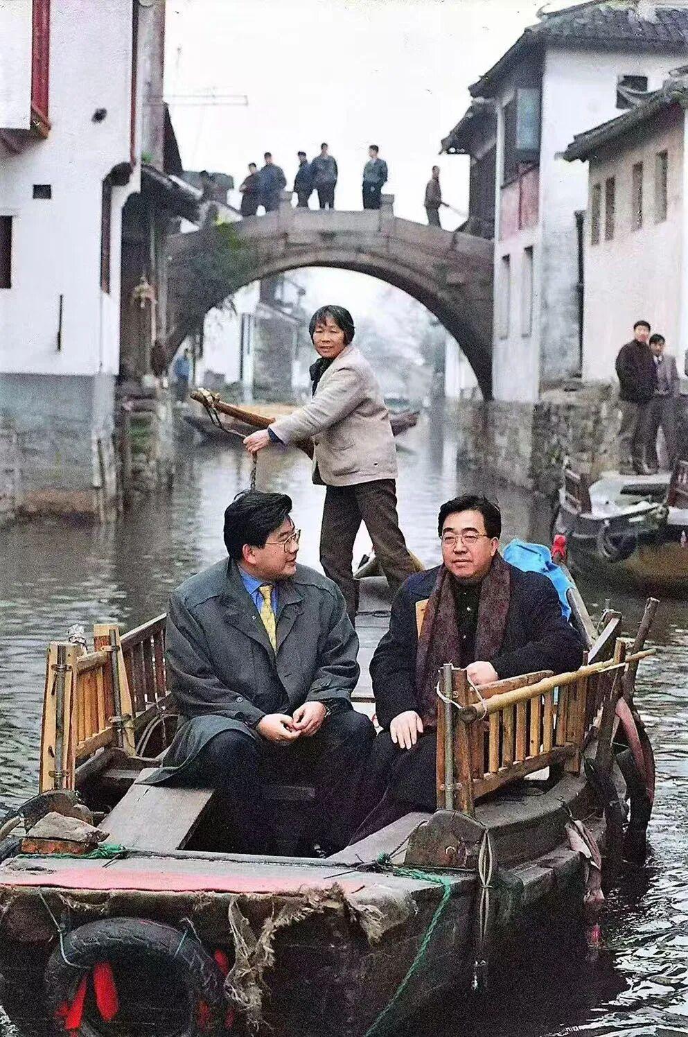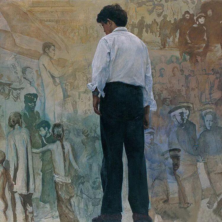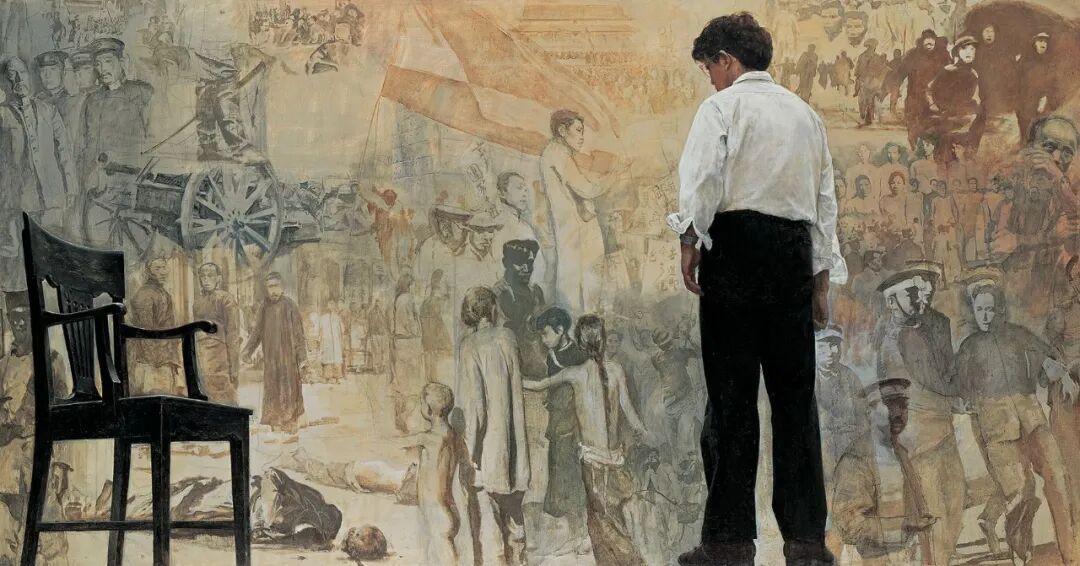 油画《踱步》是陈逸飞的精神自传,也被称为70年代末知识分子集体精神肖像,反映知识分子的时代焦虑与人文觉醒。《踱步》也是陈逸飞唯一正式的自画像,1980年赴美留学前的告别之作,以电影化构图、史诗级历史浓缩与克制的批判,成为当代油画转型里程碑之作,也是中国油画走向世界的标志性作品。 《踱步》画面左侧为一把老旧黑色木椅,右侧是艺术家陈逸飞低头沉思的背影,背景叠印着鸦片战争、五四运动等中国近代历史图像。用蒙太奇艺术手法,把个人与历史交织,标志着陈逸飞从革命题材转向人文反思的转型,被誉为新时期中国美术国际化的起点。美国《艺术新闻》评价其"写实而意境深远"。 2009年北京保利秋拍《踱步》以4043.2 万元成交,据说现收藏在龙美术馆。 附图3是1995年陈逸飞和曹可凡在江苏昆山周庄古镇