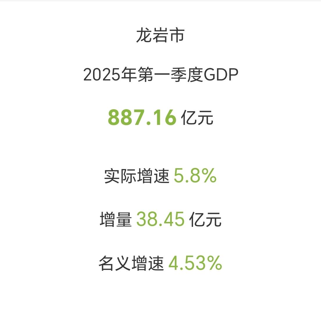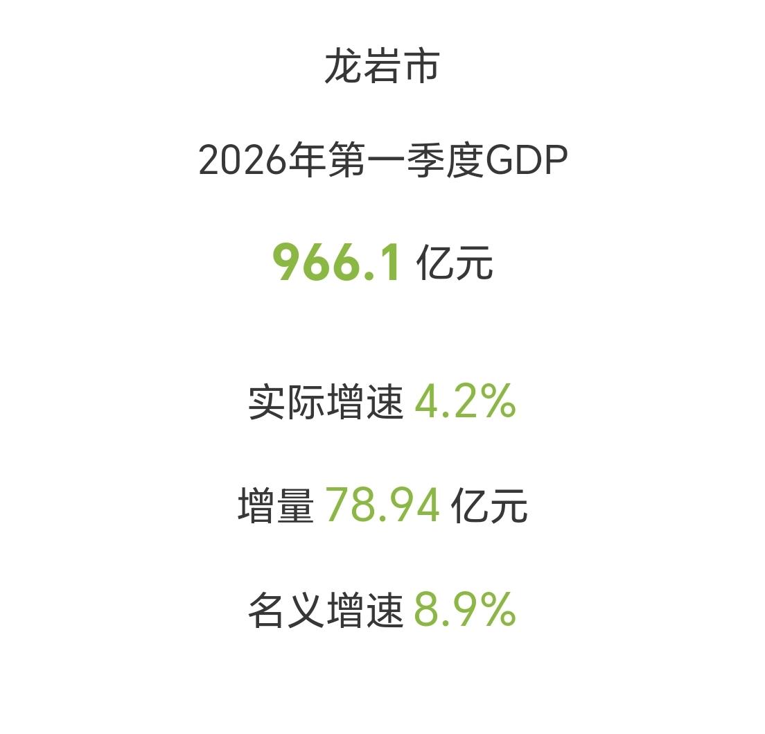 【2026年一季度,龙岩市GDP超960亿元,增量接近80亿元】 福建省第四座公布今年一季度GDP数据的城市出现了,那就是龙岩市。 一季度龙岩市GDP完成966.1亿元,超过了960亿元,其中增量实现78.94亿元,接近80亿元。 相比于2025年数据,去年前三个季度累计增量也才54.61亿元,可见今年一季度增量,那是强势反弹。 从增速来看,实际增速4.2%,名义增速8.9%。 @厦门所见所闻 对于龙岩市今年一季度GDP增长表现,您如何评价呢?