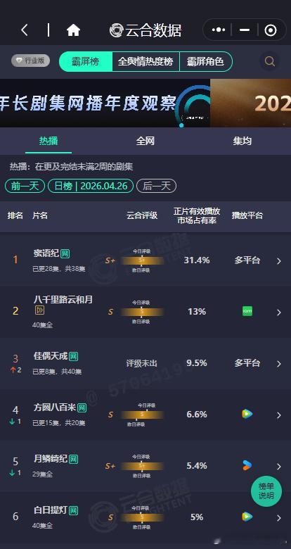 佳偶天成第三佳偶天成云合9.5% 佳偶天成第三,佳偶天成云合9.5%,咱就说我们的佳偶天成稳步上升,期待住接下来的战鬼大人的改命的故事继续见面啦~