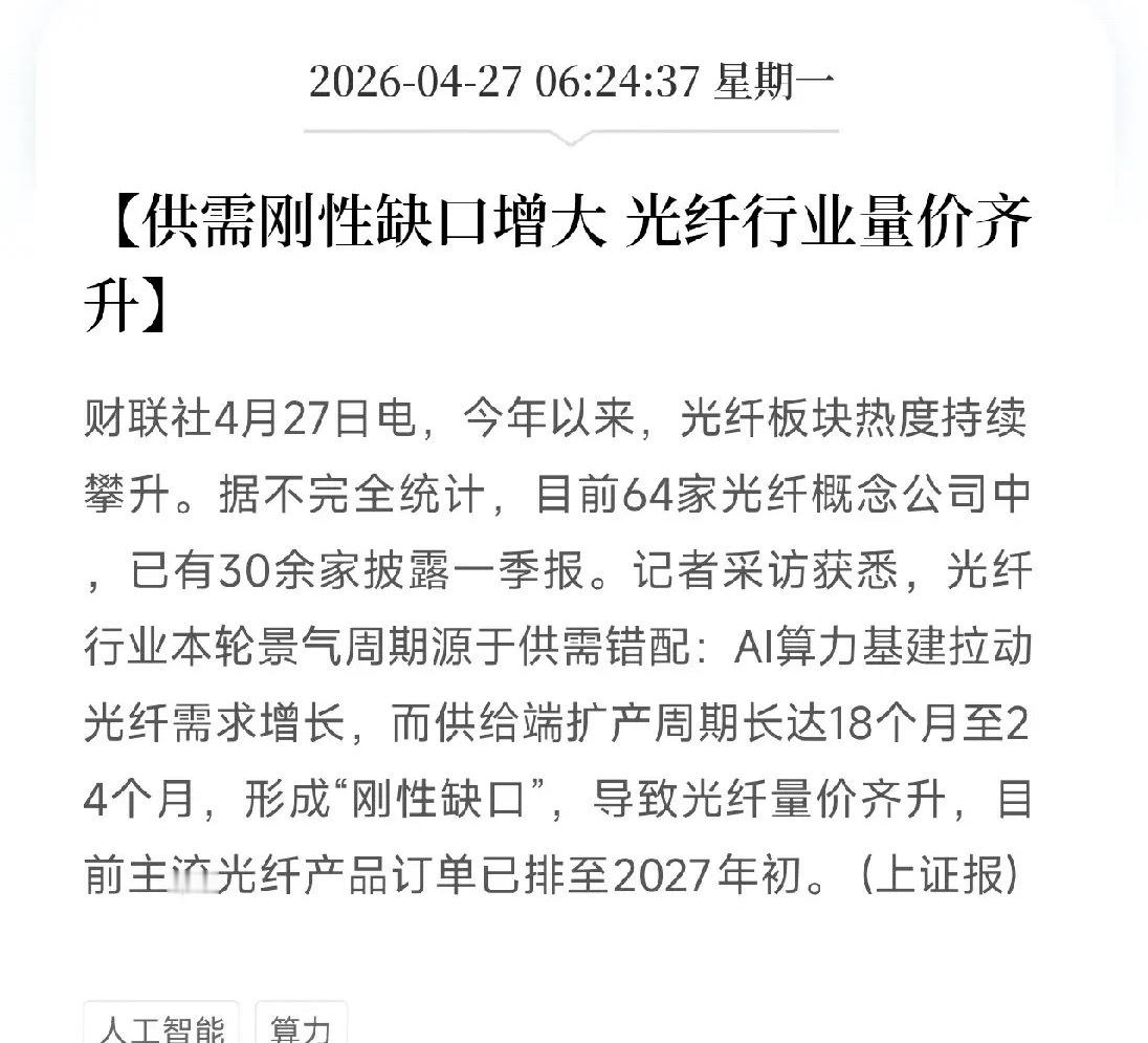 AI算力基建正在大量吞噬光纤产能。而光纤供给端的扩产周期,长达18到24个月。需求爆了,供给跟不上,直接形成一个刚性缺口。