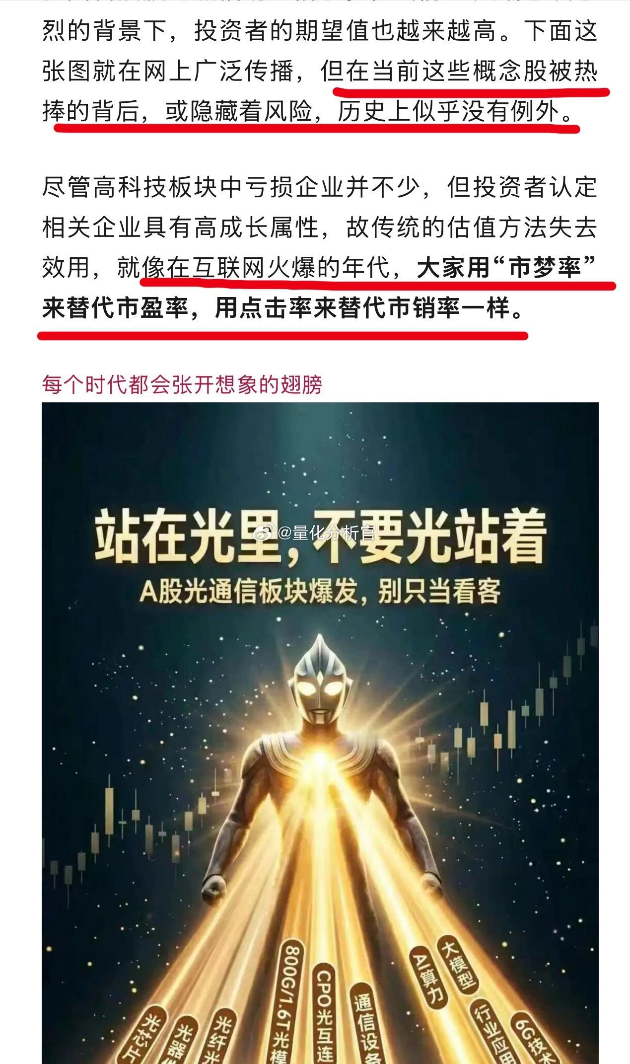 迅雷总这个提醒挺隐晦的了:每个时代都会张开想象的翅膀,当前概念股被热捧的背后,或隐藏着风险,历史上似乎没有例外。就像在互联网火爆的年代,大家用“市梦率”来替代市盈率,用点击率来替代市销率一样。A股港股美股