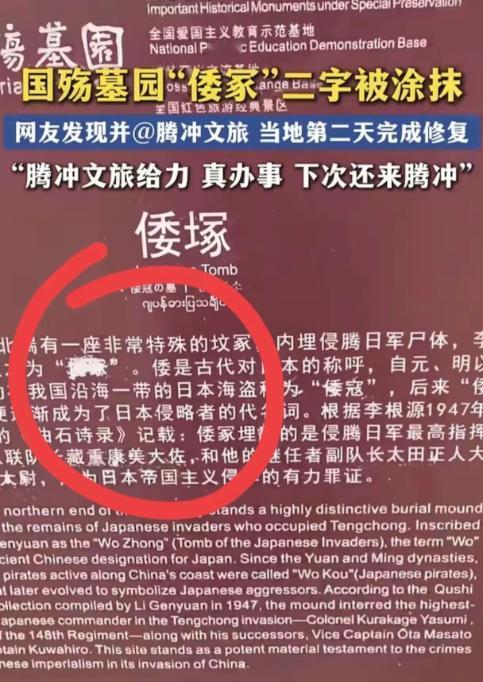 4月23日,云南腾冲国殇墓园出事了!一名游客发现"倭塚"石碑上,"倭"字被人用涂料恶意涂抹!字迹模糊不清。游客当场拍照,发到网上,照片迅速传开,登上热搜。 腾冲国殇墓园是纪念抗战英烈的重要场所,承载着那段刻骨铭心的抗战历史,园内每一处石碑、每一块墓碑,都镌刻着民族的伤痛与记忆,是无数国人缅怀英烈、铭记历史的重要载体,平日里前来参观祭拜的游客络绎不绝。 4月23日当天,天气晴好,不少游客趁着闲暇时间,前往国殇墓园参观祭拜,缅怀逝去的抗战英烈,感受那段浴血奋战的峥嵘岁月。一名游客按照园内指引,慢慢参观,当走到“倭塚”石碑前时,眼前的一幕让他瞬间愣住。 只见“倭塚”石碑上,关键的“倭”字被人用深色涂料肆意涂抹,涂料覆盖面积较大,原本工整清晰的字迹被完全遮盖,变得模糊难辨,原本庄严肃穆的石碑,被弄得面目全非,显得格外刺眼,与周围的肃穆氛围格格不入。 这名游客内心满是愤慨,他深知国殇墓园的特殊意义,也清楚“倭塚”石碑承载的历史重量,这样恶意涂抹的行为,不仅是对石碑的破坏,更是对历史的不尊重,对无数抗战英烈的亵渎,他当即拿出手机,拍下眼前的画面。 拍照结束后,游客没有丝毫犹豫,将照片发布到了网络平台,配文简单描述了自己在国殇墓园的所见所闻,诉说自己的愤慨。没想到,这组照片一经发布,就迅速引发网友关注,短短几个小时内,转发量和评论量大幅攀升。 随着照片在网络上持续传播,越来越多的网友看到了这令人气愤的一幕,相关话题很快冲上热搜榜单,成为全网热议的焦点。网友们纷纷表达自己的不满,谴责这种恶意涂抹石碑的恶劣行为,呼吁尽快找出肇事者,严肃处理。 事发后,国殇墓园的工作人员很快得知消息,第一时间赶到现场查看情况,对被涂抹的石碑进行初步检查,发现涂料已经渗透到石碑表面,很难彻底清理,只能联系专业人员前来处理,尽量恢复石碑的原貌。 工作人员同时表示,园内各处都安装了监控设备,会立即调取事发前后的监控录像,全面排查,全力寻找恶意涂抹石碑的肇事者,一旦找到,会依法追究其相关责任,绝不姑息迁就,给公众一个交代,也守护好墓园的庄严肃穆。 相关部门也迅速介入此事,组织专业人员对被涂抹的石碑进行清理修复,同时加大对国殇墓园的巡查力度,增派工作人员值守,严防此类破坏行为再次发生,守护好这份珍贵的历史记忆,维护好墓园的肃穆氛围。 截至目前,肇事者还未被找到,监控排查工作仍在紧张有序地进行中,全网网友都在关注此事的进展,纷纷留言呼吁肇事者主动投案自首,承担自己的责任,不要心存侥幸,否则终将受到法律的制裁和道德的谴责。 国殇墓园作为纪念抗战英烈、传承历史记忆的重要场所,是民族精神的载体,每一处设施都值得被尊重和保护。恶意涂抹“倭塚”石碑,不仅违反了相关规定,更是对历史的漠视,对英烈的亵渎,这种行为理应受到严厉谴责和严肃处理。 很多前往国殇墓园参观的游客,得知此事后,都表示十分气愤,他们认为,铭记历史、缅怀英烈是每个国人的责任,任何人都不能以任何理由,破坏承载历史记忆的设施,否则就是对民族历史的背叛。 此次事件也给所有人提了个醒,历史不容篡改,英烈不容亵渎,承载历史记忆的场所和设施,需要我们每个人共同守护。无论是国殇墓园,还是其他纪念场所,都应得到充分的尊重和保护,这是我们每个国人的责任和义务。 目前,石碑清理修复工作正在稳步推进,监控排查也在持续进行中,相信用不了多久,肇事者就会被找到,受到应有的惩罚。而我们每个人,都应铭记历史、敬畏历史,共同守护好我们民族的精神家园。 对此,你们有什么看法,欢迎评论留言~