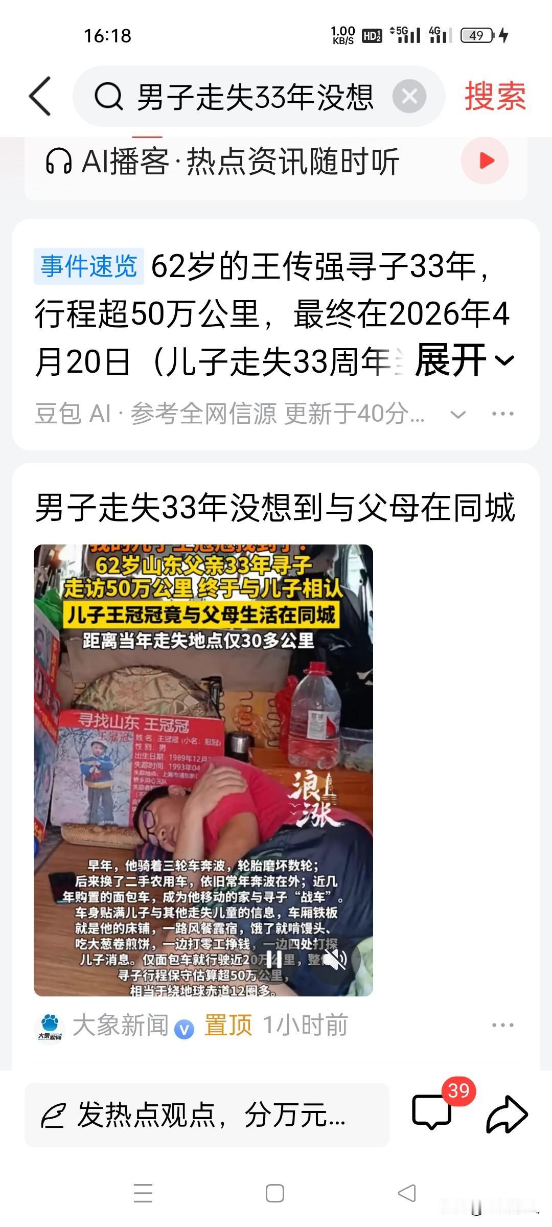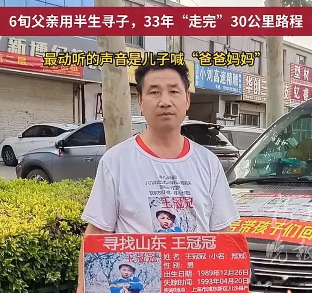 寻子33年,行程50万公里!父亲才知:他一直在同城,仅隔30公里。 故事的开端,是1993年那个普通的春天。为了讨生活,这位朴实的山东汉子,带着妻子和年仅3岁的儿子,背井离乡来到繁华的上海。 一家人没有落脚的地方,租住在狭小简陋的出租屋里,靠着街头摆摊做点小生意,勉强维持生计。日子虽然清贫拮据,但一家三口相守在一起,粗茶淡饭里也满是对未来的期盼。 可命运的残酷,总是毫无征兆地降临。1993年4月20日,是这个家庭一生都无法忘却的噩梦之日。那天清晨,天刚蒙蒙亮,父亲像往常一样早早出门摆摊谋生。 妻子在家收拾家务、洗碗忙碌,一时没留意,独自在屋外玩耍的3岁儿子,竟悄无声息地不见了踪影。等母亲发现孩子不见时,屋外早已没了小小的身影,慌乱瞬间席卷了这个家庭。 她发疯似的跑遍周边的大街小巷、菜市场、公交站,喊着儿子的名字,可回应她的,只有空荡荡的风声。丈夫得知消息后,立刻扔下摊位赶回来,夫妻二人绝望地搜寻每一个角落。 哭哑了嗓子,跑断了腿脚,可年幼的儿子,就像人间蒸发一般,彻底没了踪迹。从儿子走失的那一刻起,这个家庭的天,彻底塌了。 愧疚、自责、绝望,死死缠绕着这位父亲,他无数次责怪自己没有看好孩子,无数次在深夜被噩梦惊醒,梦里全是儿子稚嫩的脸庞。他暗暗发誓,哪怕穷尽一生,也要把儿子找回来。 从此,他踏上了一场没有尽头、布满艰辛的寻子路。他把儿子的模样牢牢刻在心底:圆圆的脸蛋,高高的鼻梁,右眼下方有一颗小小的黑痣,手腕上还有一块清晰的疤痕。 这几个特征,他记了33年,念叨了33年。寻子之路,远比想象中更艰难。最初,他骑着一辆破旧的三轮车,一路奔波一路寻找,他听人说孩子口音像山东老家,便一遍遍往返于上海与山东各地,不放过任何一个村镇、一条小巷。 风吹日晒,雨淋霜打,饿了就啃几口随身携带的干馒头,渴了就喝路边的凉水,累了就蜷缩在三轮车里眯一会儿。日复一日,三轮车骑坏了一辆又一辆,身上的衣服磨破了又补,可他始终没有停下脚步。 后来,为了能去更远的地方,他咬牙攒钱,换了一辆二手小货车。他把车厢简单改造,贴上满墙的儿子照片和寻人启事,这辆小小的货车,既是他赶路的交通工具,也是他漂泊在外唯一的“家”。 此后的岁月里,他开着货车走遍大江南北,从南方的湿热都市到北方的寒冷城镇,足迹遍布大半个中国。他一边打零工、卖苦力,挣取微薄的路费和生活费,一边四处打听儿子的消息。 但凡听到一点点线索,哪怕远在千里之外,他都会立刻驱车前往,可一次次满怀希望奔赴,换来的却是一次次失望而归。33年光阴,他从意气风发的壮年,变成了满头白发、满脸沧桑的老人。 车轮滚滚,累计行驶了整整50万公里,每一公里,都藏着一位父亲对儿子最深切的思念。而他日夜思念、苦苦寻觅的儿子,这些年一直生活在上海,从未走远。 当年被人带走后,儿子便在新的家庭里生活,随着年纪慢慢增长,他心底始终有一个模糊的念头:自己并不是现在父母的亲生孩子。他也时常想念亲生父母,却不知该如何寻找,只能将这份执念藏在心底。 时光匆匆,转眼来到2026年,这场跨越33年的寻亲,终于迎来了转机。4月10日,老人突然接到上海警方打来的电话,通知他前往采血进行DNA比对。原来,警方通过大数据技术与DNA信息比对,筛查到一位青年,与他走失的儿子高度吻合。 接到电话的那一刻,老人双手颤抖,半生的等待仿佛就在这一刻有了希望,他激动得彻夜难眠,一遍遍祈祷这次能是真的。巧合的是,4月20日,正是儿子走失整整33周年的纪念日,警方传来了让他魂牵梦绕半辈子的好消息:DNA比对成功,找到他的儿子了! 老人带着家人,一刻也不敢耽误,立刻赶往上海派出所。推开门的瞬间,他一眼就认出了眼前的青年,尽管33年未见,当年的小不点已长成挺拔的小伙子,可右眼的黑痣、手腕的疤痕,依旧是记忆里的模样。 没有丝毫犹豫,父子二人紧紧相拥在一起,失声痛哭,33年的思念、33年的艰辛、33年的委屈,在这一刻全部化作泪水,肆意流淌。懂事的儿子,紧紧抱着亲生父母,哽咽着喊出“爸爸、妈妈”,这一声呼唤,让老人觉得半生所有的苦难,都值了。 而更让所有人唏嘘的是,儿子这些年生活的地方,距离当年走失的地点,仅仅只有30多公里。30公里,不过半小时的车程,却是一位父亲跨越33年、奔波50万公里都没能跨越的距离,这份咫尺天涯的心酸,让无数人为之泪目。 如今,失散33年的一家人,终于迎来了团圆。面对失而复得的儿子,老人没有丝毫埋怨,他坦言,会完全尊重儿子的所有选择,不会强求儿子留在身边,只希望儿子往后能平安幸福。半生漂泊寻子,如今心愿已了,他只想好好陪伴在家人身边,弥补这33年来对妻儿的亏欠。 消息来源@大河报