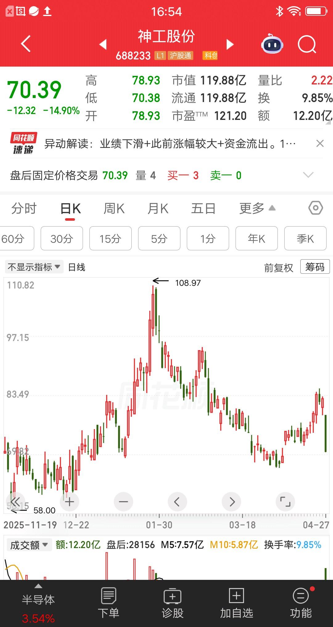 一位天津的股民,102元买了神工股份37万块,后来股价开始下跌了,他又在84元补仓30万。最后在70元割肉出局,大亏了16万块。 他最初看好神工股份,是因为公司属于半导体板块,是牛股频出的行业。公司主营半导体单晶硅材料及硅零部件,是国内极少数具备“从晶体生长到硅电极成品”一体化生产能力的厂商,而且掌握22英寸及以下大直径硅材料全套工艺,且全球细分市场份额领先。 于是就买入了,只是没想到买在了山顶。刚建仓完毕就下跌了,起初亏得少不在意,又加了一次仓位,之后就持股待涨了。 万万没想到,一季报不理想。净利润2539万,同比减少10.96%,股价应声大跌。他是中长线资金,对业绩比较敏感,心里有点担忧,就一键清仓了。 最近的市场,充分说明了信心不足。业绩下滑的个股,都杀估值了。其实这些票没有太大的问题,只是情绪低迷放大了恐慌。 耐心等待信心修复吧。