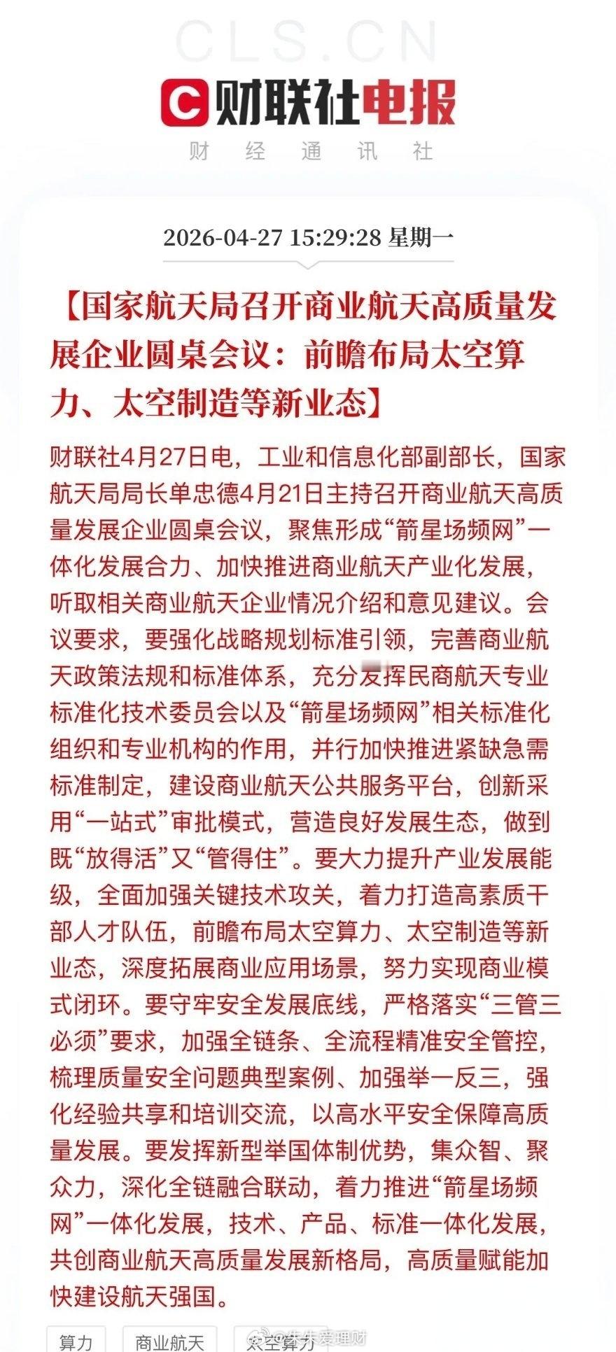 盘后重磅利好!国家航天局定调,太空算力+太空制造,全新风口来袭!盘后传来顶级政策利好!国家航天局召开企业圆桌会议,明确表态:前瞻布局太空算力、太空制造两大新兴赛道,加速推进箭星场频网一体化发展。标志着商业航天正式告别粗放发展,全面迈入标准化、产业化高质量新阶段,赛道价值重估。三大核心关键信号1. 行业定标,龙头集中完善商业航天行业标准,推行一站式审批,告别各自为战格局。行业门槛提升,合规头部企业优势持续放大,强者恒强。