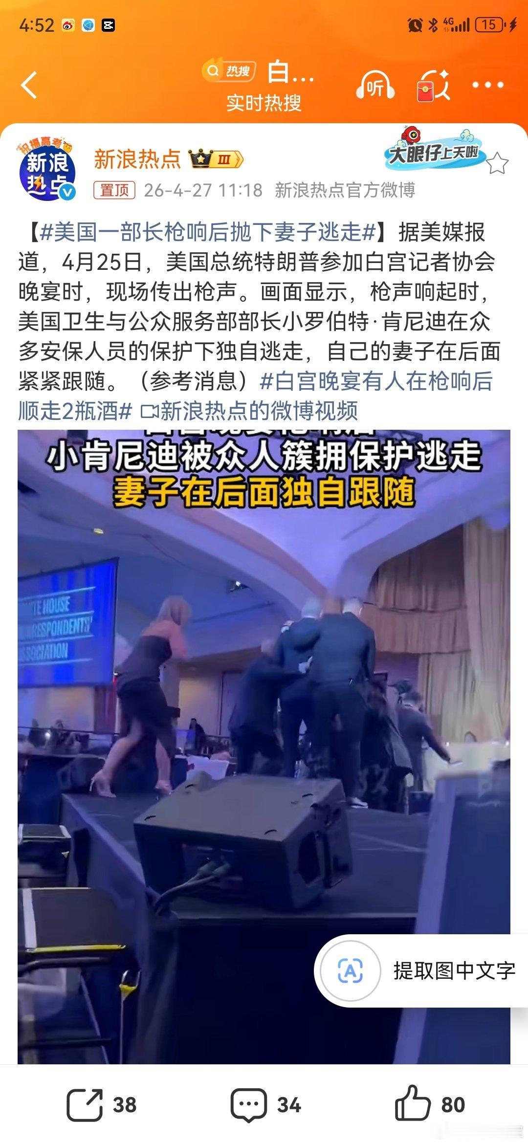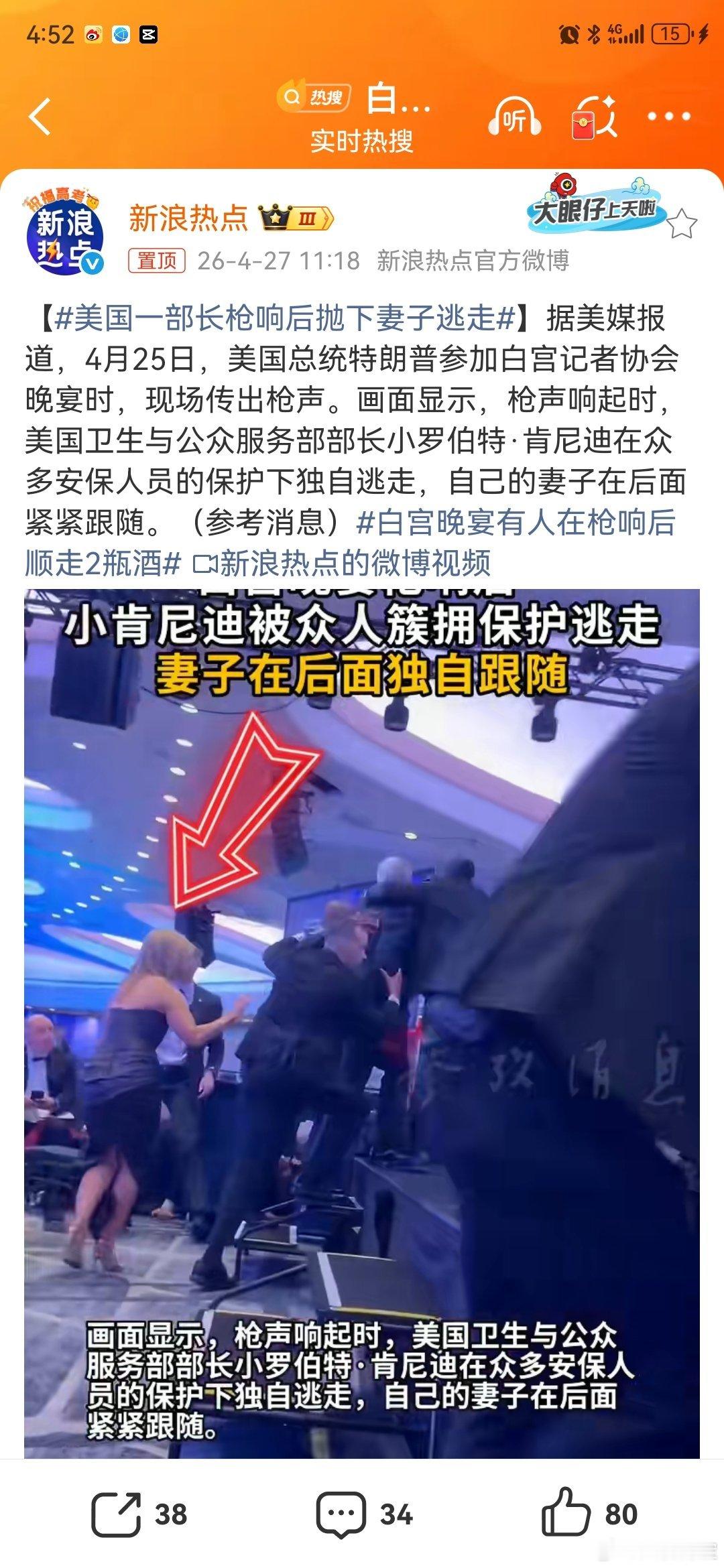 据美媒报道,4月25日,美国白宫晚宴枪击事件画面显示,枪声响起时,美国卫生与公众服务部部长小罗伯特·肯尼迪在众多安保人员的保护下抛下妻子独自逃走。