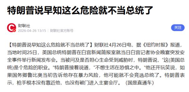 特朗普这辈子,从没说过这么 “认怂” 的话。 特朗普这辈子,那可是出了名的嘴硬,啥时候见过他“认怂”啊,可就在4月26号,刚从一场生死危机里缓过劲儿来的特朗普,在白宫新闻发布会上,当着全美媒体的面,冷不丁冒出一句让所有人都惊掉下巴的话:早知道当总统这么危险,我当初就不选了。 这可不是他随口瞎抱怨,这话里全是后怕,为啥这么说呢?就在十几个小时前,特朗普差点就在华盛顿希尔顿酒店交代了。 那天晚上,是白宫记者协会的晚宴,这活动可有年头了,上百年历史呢,说白了就是美国政界和媒体圈的大聚会。平时这些人都装得特别体面,一个个端着架子。 那天晚宴可热闹了,来了两千多个有头有脸的人物,特朗普带着老婆梅拉尼娅,还有副总统万斯,几乎所有内阁成员都来了,特朗普本来还打算上台演讲,好好露一手呢。 可谁能想到,还没等他登台,枪声就“砰砰砰”地响起来了,这好好的一场名流盛会,瞬间就乱成了一锅粥。 那些平时端着的大佬们,一下子全慌了神,吓得抱头鼠窜,四处找地方躲,现场那叫一个混乱,尖叫声、呼喊声此起彼伏。 这事儿可不是我瞎编,当时网上全是这事儿的消息,大家都在议论纷纷,说特朗普这次可真是从鬼门关前走了一遭,你想啊,要是那枪子儿稍微偏一点,打中了特朗普,那美国政坛不得翻天了啊。 这事儿之后,美国各界都炸锅了,有人觉得特朗普这是真害怕了,毕竟谁遇到这种事儿都得后怕,也有人觉得他这是在作秀,想博同情,不过不管怎么说,这事儿给美国政坛带来的影响可不小。 从这事儿能看出来,美国总统这活儿可真不好干,表面上风光无限,可背后指不定有多少危险呢,就说特朗普吧,他当总统这几年,可没少惹事儿,跟各国关系搞得紧张兮兮的,国内也是各种矛盾不断。 这次枪击事件,说不定就是他之前那些行为惹来的麻烦,你想啊,他老是在国际上搞小动作,今天制裁这个,明天威胁那个,能不得罪人吗?那些对他不满的人,说不定就想着找个机会给他点颜色看看。 而且美国国内现在也不太平,贫富差距越来越大,社会矛盾越来越尖锐,那些底层老百姓对政府本来就有很多不满,特朗普的一些政策又没能解决这些问题,反而让情况变得更糟,这次枪击事件,说不定就是国内矛盾激化的一个表现。 再说说特朗普这个人,他一直都很自负,觉得自己能掌控一切,可这次的事儿让他知道,有些事儿是他控制不了的,他以为当总统就是发号施令,享受荣华富贵,可没想到背后还有这么多危险和麻烦。 经过这次的事儿,特朗普说不定会改变自己的行事风格,他可能会收敛一点,不再那么张狂,毕竟生命只有一次,要是再这么冒险下去,说不定哪天就真的没命了。 不过话又说回来,美国政坛的水太深了,就算特朗普想改变,也不一定能成功,他身边那些利益集团,肯定不会轻易让他改变政策,他们只想从特朗普身上捞好处,才不会管他的死活呢。 这次枪击事件也给美国政府提了个醒,他们得好好想想,怎么才能保障总统的安全,怎么才能解决国内的各种矛盾,要是再这么下去,美国迟早会出更大的乱子。 总之,特朗普这次遭遇枪击,是美国政坛的一个大事件,这事儿不仅让特朗普自己受到了惊吓,也让美国各界开始反思。 希望美国能从这次事件中吸取教训,别再让这种危险的事情发生了,毕竟,和平稳定才是大家最想要的。