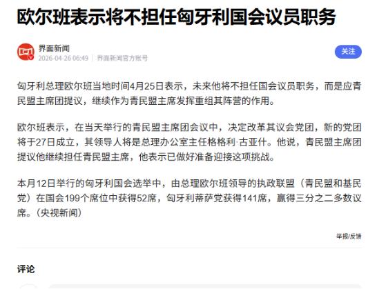 当地时间4月25日,匈牙利总理欧尔班猝不及防地对外公布了一个重磅决定——今后将不再担任国会议员一职。 欧尔班在匈牙利那可是响当当的大人物,打1990年起,他就在国会里占着个座儿,一待就是好些年,跟棵扎根多年的老树似的。 2010年他重新掌权后,一口气当了16年总理,这政治生涯,就跟一部超长电视剧,剧情那叫一个跌宕起伏,精彩得很。 这36年里,欧尔班在国会里那可是经历了不少风风雨雨,匈牙利国内政策调整、国际形势变化,他都在里头搅和着,参与了不少大事儿。 他带着匈牙利在国际舞台上刷了不少存在感,跟欧盟那些国家,有时候合作,有时候还闹点小矛盾,可热闹了。 他这一路走来,有风光的时候,也有被人质疑的时候,有人觉得他政策好,带着匈牙利发展得不错;可也有人觉得他太强势,有些事儿做得不太地道,但不管咋说,他都是匈牙利政坛绕不开的人物。 可谁能想到,就在4月25号这天,他突然说要离开国会,彻底告别这个奋斗了36年的地方,这消息一出来,大家都懵了,各种猜测满天飞。有人说他是不是累了,想歇歇;也有人说他是不是有啥别的打算,准备换个赛道接着干。 欧尔班这一决定,对匈牙利政坛影响可不小,国会里一下子少了这么个老资历、有影响力的人物,以后那些议员们开会讨论事儿,氛围肯定不一样了,新来的议员们,没了这么个“老大哥”压着,说不定能放开手脚干点新花样。 而且,匈牙利国内政策走向说不定也会变。欧尔班之前推行的那些政策,有的还在继续,有的可能得重新琢磨。 新上台的议员们,想法肯定跟他不一样,肯定会提出自己的一套方案,这匈牙利以后的路咋走,还真不好说。 从国际上看,欧尔班这一走,匈牙利在国际上的态度说不定也会变,以前欧尔班在欧盟里,有时候跟其他国家意见不合,现在他不在国会了,匈牙利在欧盟里说话的分量,会不会变轻呢?跟其他国家的关系,会不会也受影响呢? 我觉得欧尔班这一决定,挺大胆的,在政坛混了这么多年,突然说走就走,这得需要多大的勇气啊。 他肯定也是经过深思熟虑的,说不定是觉得匈牙利现在需要新的血液,新的思路,他退下来,能让年轻人有更多机会。 不过,也有人担心,他这一走,匈牙利会不会陷入一段混乱期,毕竟他在政坛这么多年,影响力太大了,突然没了这么个主心骨,那些议员们能不能迅速适应,把国家的事儿处理好,还真不好说。 但换个角度想,这说不定也是匈牙利的一个机会,新议员们带着新想法、新活力,说不定能给匈牙利带来新的发展机遇,就像一棵老树,虽然砍掉了主干,但说不定能发出更多新芽,长得更茂盛呢。 不管咋说,欧尔班这一决定,已经成了匈牙利政坛的一个转折点,以后匈牙利会变成啥样,咱们就等着瞧吧,说不定会有不少惊喜等着咱们呢。