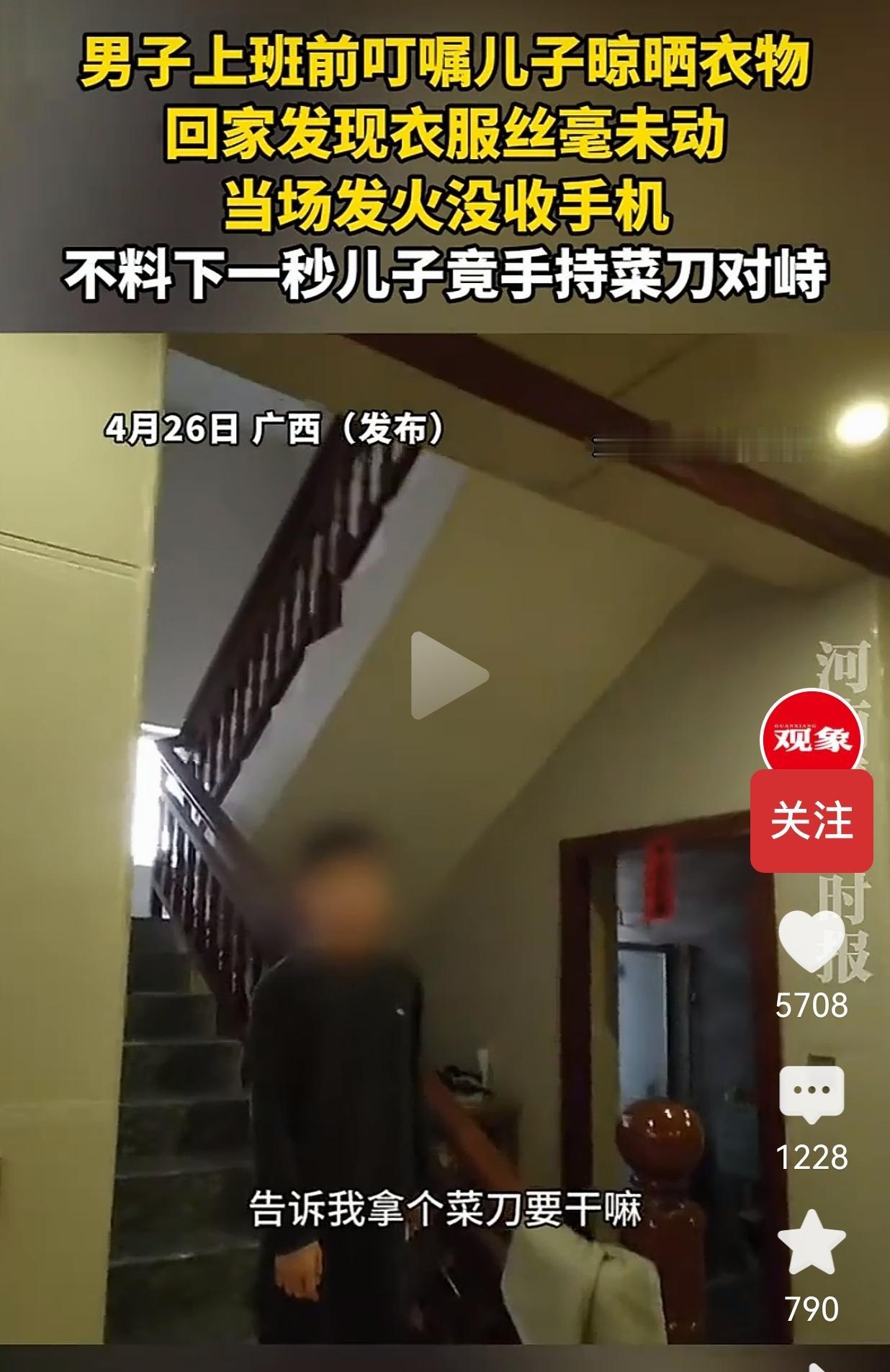 因为没收手机,儿子直接拿刀对峙,这一幕看得人后背发凉 广西这对父子的事,看完我鸡皮疙瘩掉一地,心里堵得慌。 事情说简单也简单,离谱程度却让人难以接受。 父亲上班前特意叮嘱儿子,把洗好的衣服晾晒好。 结果下班回到家,衣服原封不动,孩子一整天抱着手机沉迷玩乐,什么家务都不肯做。 父亲一时气急,便没收了他的手机。 万万没想到的是,就因为这件小事,孩子情绪彻底失控,拿着危险器具下楼,直面和父亲对峙。 父亲又惊又慌,满心失望:“你这是要做什么?有什么事不能好好沟通,非要走极端?” 孩子全程冷漠倔强,态度强硬,丝毫没有认错的意思。 好好沟通不听,耐心劝导没用,简单的管教,换来的却是孩子极端的反抗。 眼前这一幕,看得人浑身发冷,后背直冒冷汗。 网友看到后评论说:“这孩子已经不是叛逆了,是没敬畏心!就因为没收手机,做出极端举动对抗父亲,这样下去真的太危险了。” 也有的网友说:“我家也有半大孩子,现在真不敢管,说两句就翻脸,摔东西甩脸子,跟供了个祖宗似的。” 还有的网友说:“看到这件事心里瞬间揪紧。现在的孩子抗压能力太差,父母正常管教都接受不了,家庭教育真的该好好反思了。” 更有网友表示:“以前我们挨顿骂都不敢顶嘴,现在的孩子,说一句记仇好久,动不动就极端反抗亲人,实在太寒心了。” 我看完整个过程,气得浑身发抖,又特别心寒。 不过是没收一部手机、懒得做家务这点小事,孩子就用极端方式对抗父母。 这早就不是单纯的青春期叛逆,而是缺失了最基本的尊重、包容和做人底线。 父母辛辛苦苦拉扯孩子长大,掏心掏肺付出一切。 就因为一点不顺心,就抵触管教、敌视家人,这到底是家庭教育的疏忽,还是成长三观的缺失? 现在有些孩子,被家人溺爱得没边没际。 衣来伸手饭来张口,受不了一点约束,听不进半句逆耳话。 父母管控手机,不是刻意为难,是怕孩子沉迷网络荒废学业,耽误一生。 可惜很多孩子根本不懂,把父母的苦心管教,当成刻意针对。 我真的想不通,好好的沟通不用,非要用极端方式解决问题。 难道所有人都要顺着自己、惯着自己,才算是对自己好吗? 父母的严厉管教,从来都藏着最深的在乎。 连最亲近的家人都不懂珍惜、不懂体谅,将来踏入社会,又怎么扛得住压力,担得起责任? 老话常说,养不教父之过。但面对脾气暴躁、抵触一切管教的孩子,家长往往也是有心无力。 过度溺爱养出任性,过度严厉引发反抗,分寸一旦拿捏不好,就容易酿成悲剧。 这不仅仅是一个家庭的悲剧,更是当下无数家庭教育的真实缩影。 父母拼尽全力为孩子铺路,孩子却把所有付出当成理所当然,把善意管教当成仇人。 当孩子选择用极端方式对抗家人的那一刻,就已经输掉了感恩之心,丢掉了做人最基本的敬畏与善良。 最后,我想说的是:别让手机吞噬心智,别让无底线的溺爱,养出不懂体谅、不懂感恩的孩子。