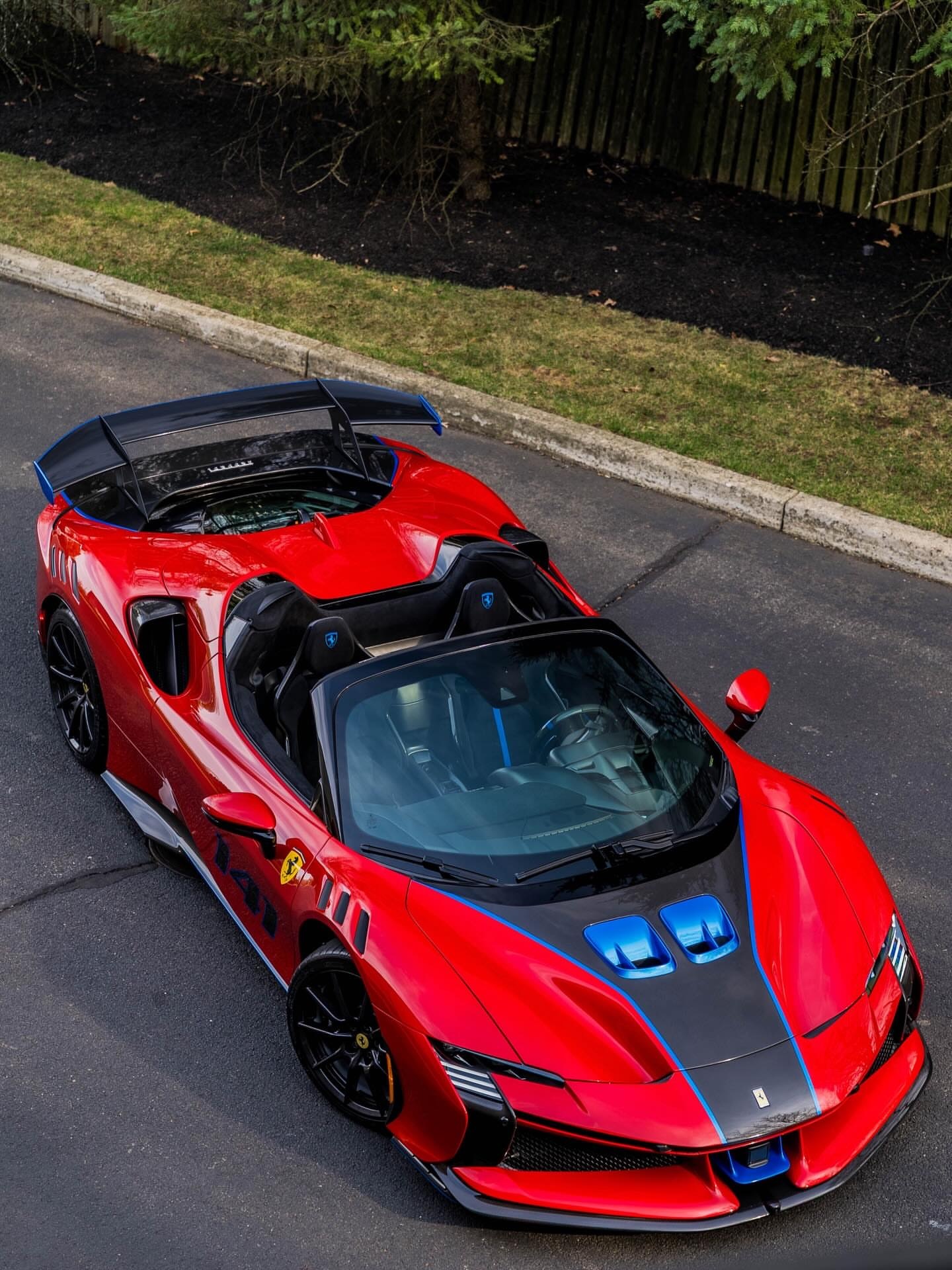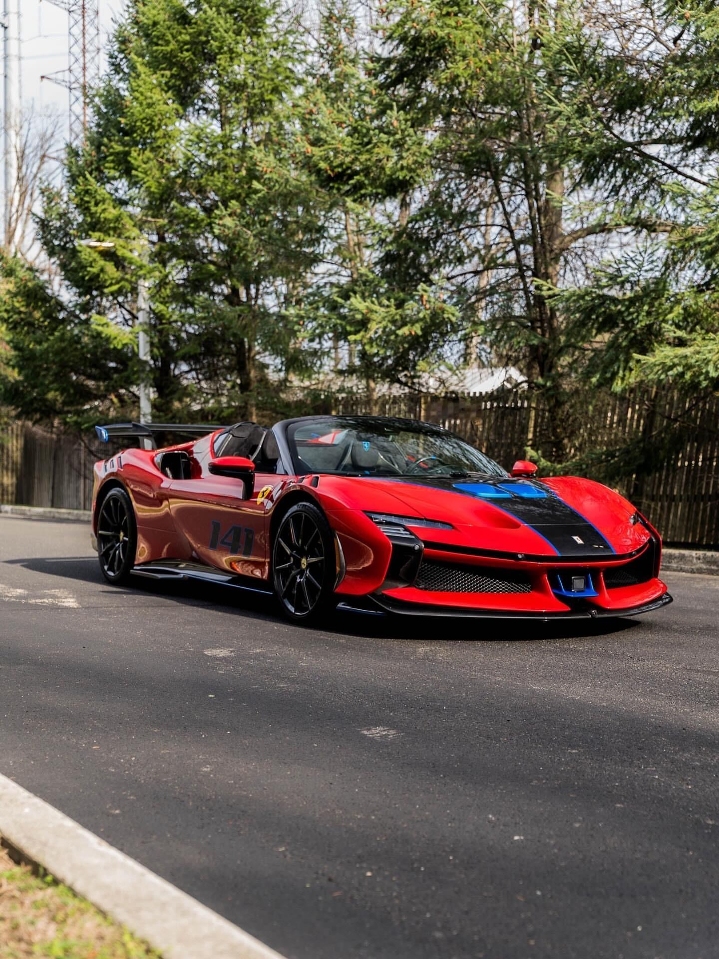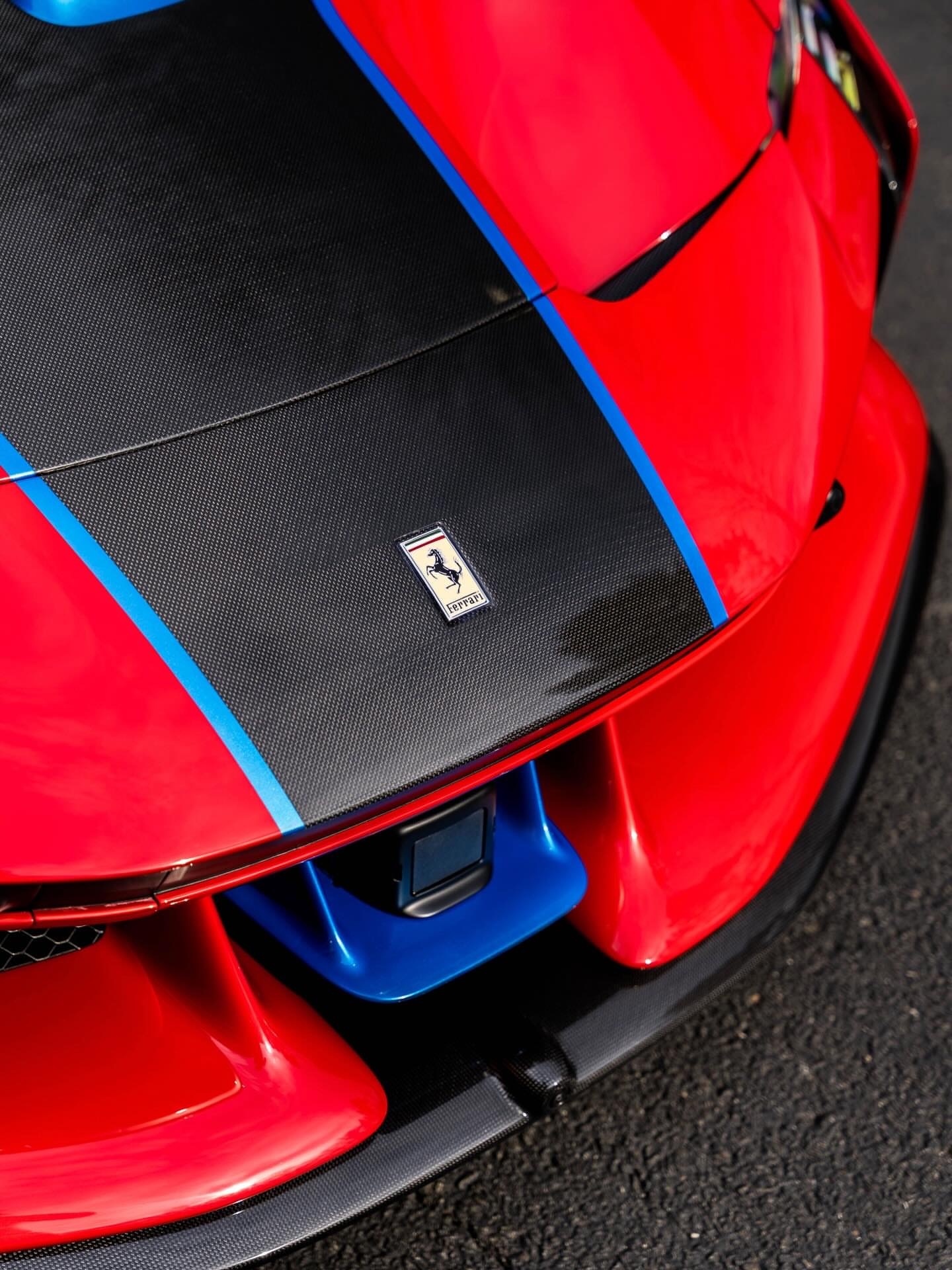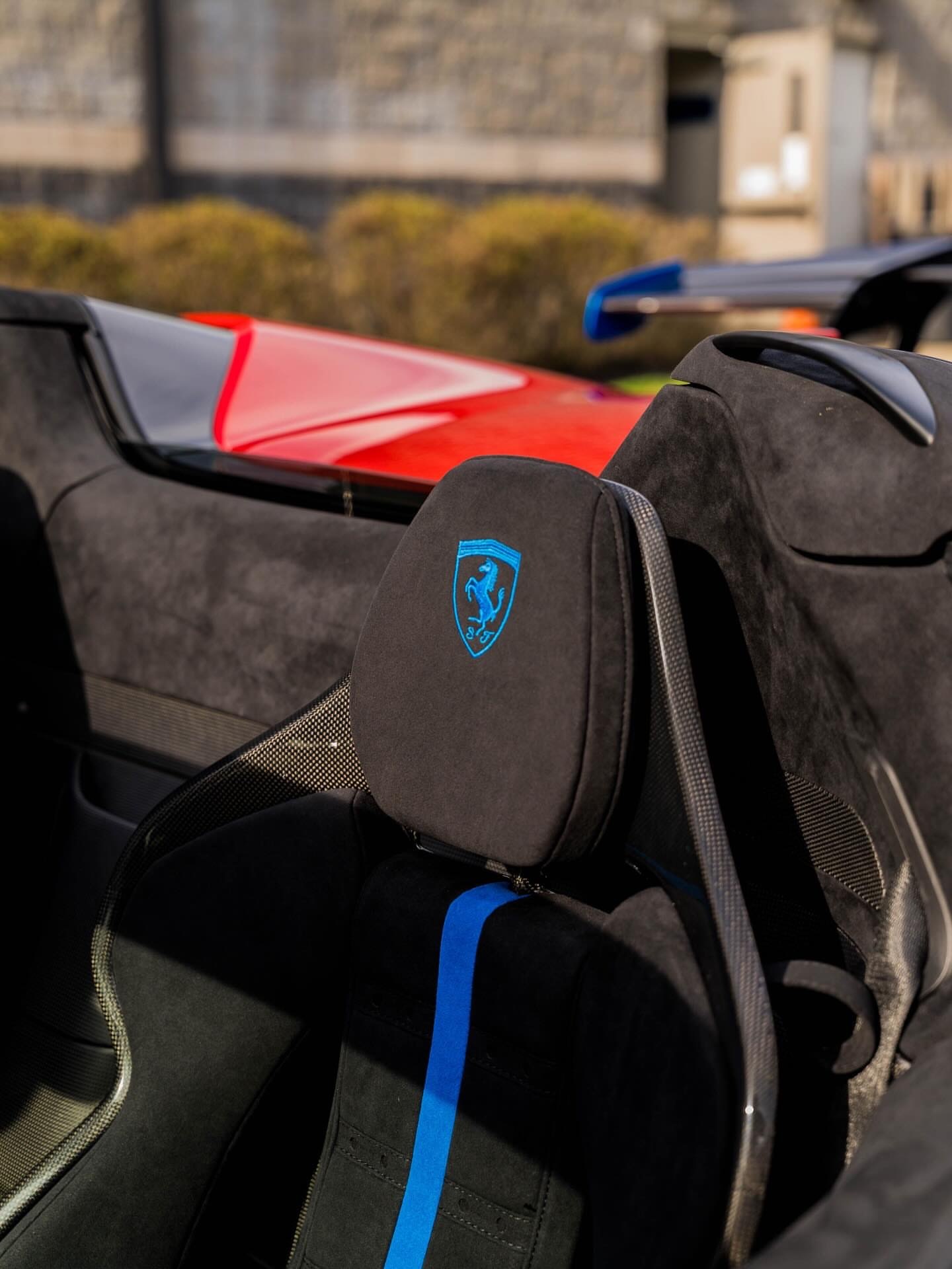 极致SF90 XX Spider,身披Rosso F1 2007红色涂装,搭配裸露碳纤维饰面,以Azzurro Dino Metallic金属蓝点缀。经纽约Atelier工坊精心匠造,每一处细节皆量身定制,呼应这台稀世杰作毫不妥协的性能锋芒。