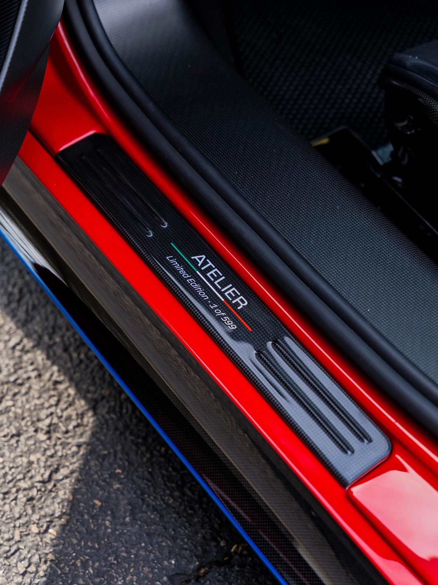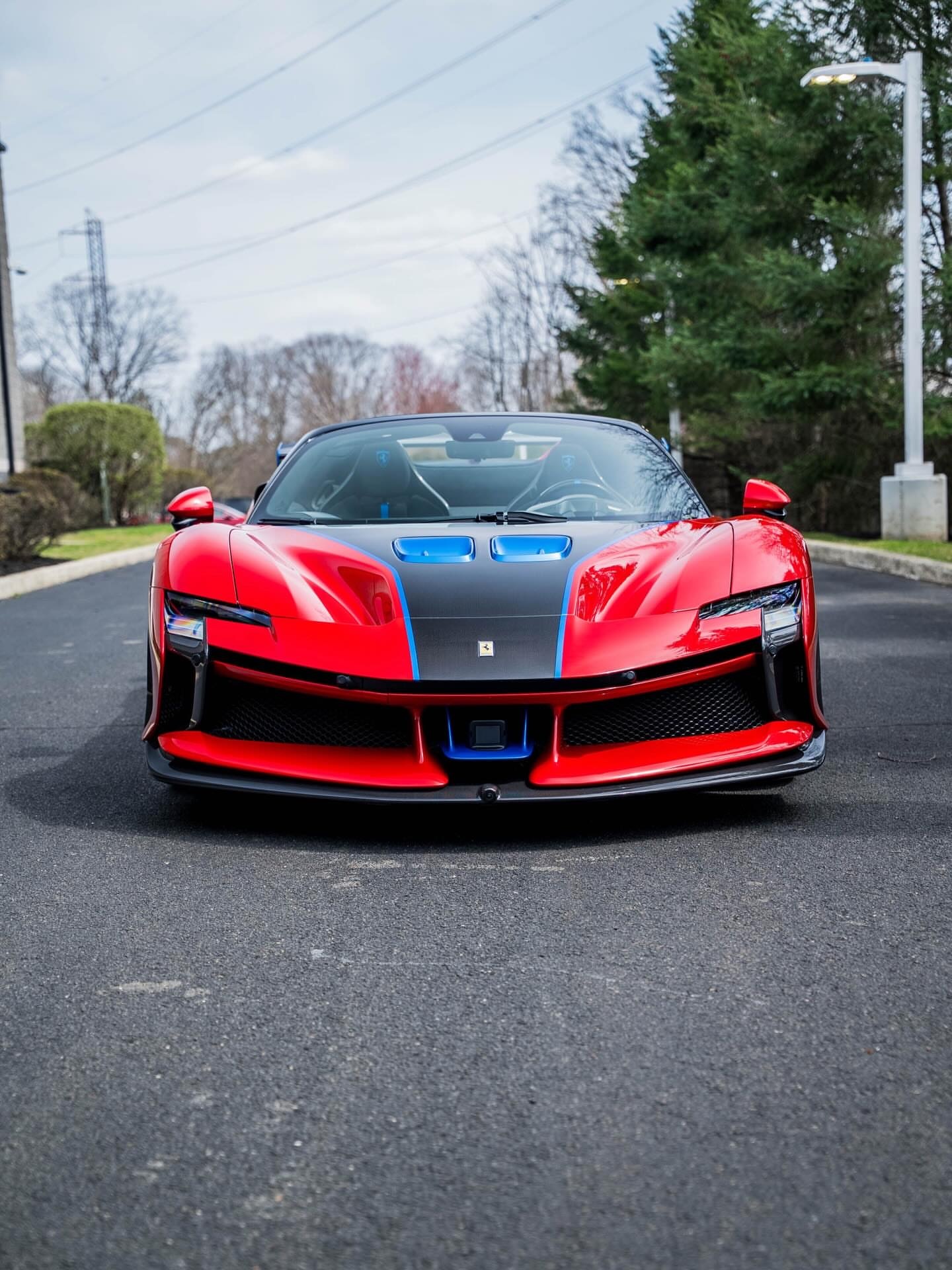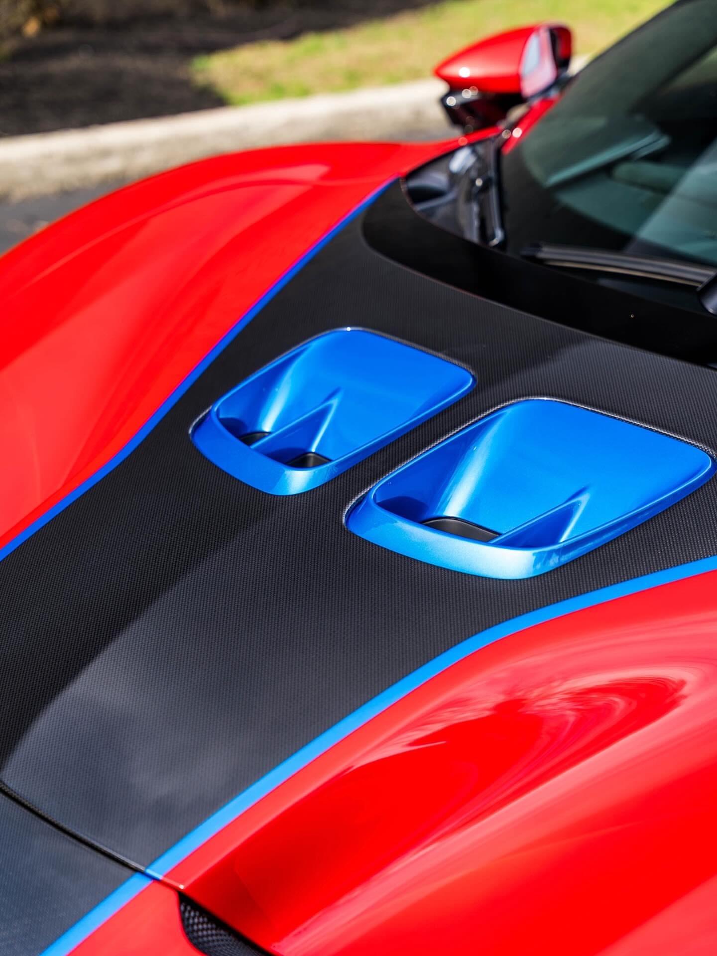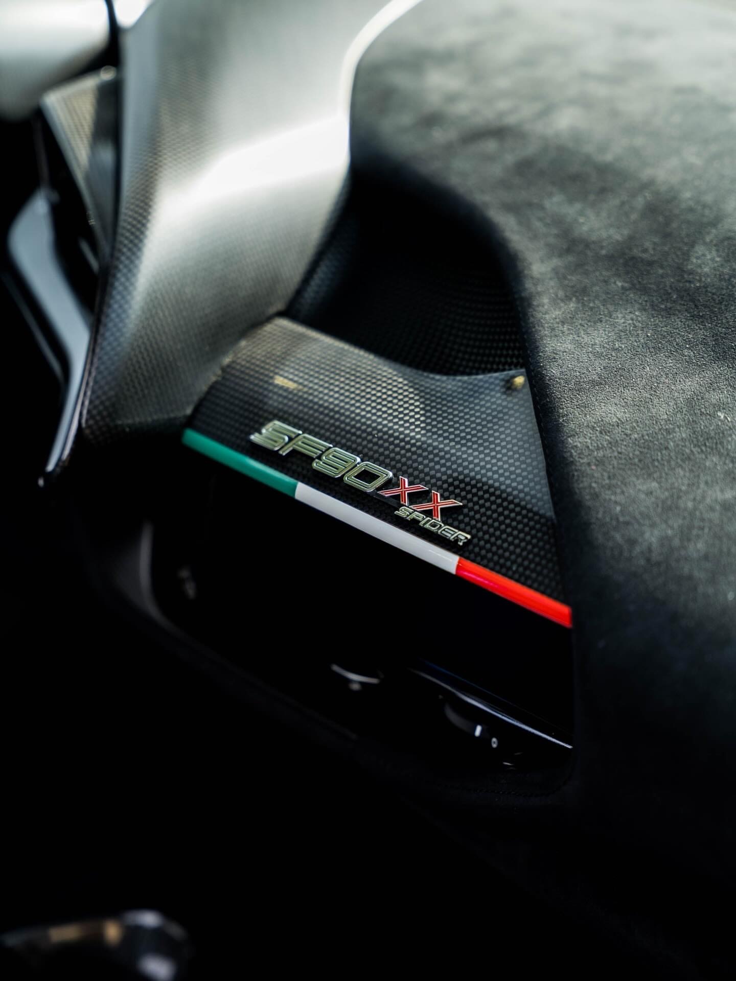 极致SF90 XX Spider,身披Rosso F1 2007红色涂装,搭配裸露碳纤维饰面,以Azzurro Dino Metallic金属蓝点缀。经纽约Atelier工坊精心匠造,每一处细节皆量身定制,呼应这台稀世杰作毫不妥协的性能锋芒。