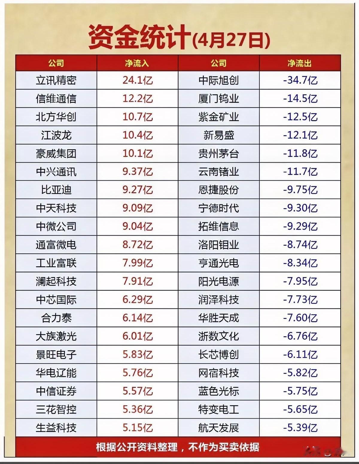 4月27日A股资金风云榜:抢筹与出逃核心标的全梳理! 今日的资金统计展现了当日A股市场的资金流向分化格局。资金净流入个股多集中在半导体、消费电子、新能源设备等科技制造领域,净流出个股则以光模块、资源、白酒及部分新能源龙头为主,反映出市场资金的赛道调仓与风格切换动作。 净流入个股梳理 1. 立讯精密:以24.1亿资金净流入领跑,消费电子与汽车电子龙头,获资金集中追捧。 2. 信维通信:获12.2亿资金净流入,射频天线核心标的,获资金明显关注与买入。 3. 北方华创:获10.7亿资金净流入,半导体设备龙头,获资金大幅流入。 4. 江波龙:获10.4亿资金净流入,存储芯片领域标的,获资金集中青睐。 5. 豪威集团:获10.1亿资金净流入,半导体图像传感器企业,获资金明显追捧。 6. 中兴通讯:获9.37亿资金净流入,通信设备行业龙头,获资金大幅买入。 7. 比亚迪:获9.27亿资金净流入,新能源汽车龙头,获资金明显关注。 8. 中天科技:获9.09亿资金净流入,光通信与新能源企业,获资金持续流入。 9. 中微公司:获9.04亿资金净流入,半导体设备核心厂商,获资金大幅买入。 10. 通富微电:获8.72亿资金净流入,半导体封测领域标的,获资金集中青睐。 11. 工业富联:获7.99亿资金净流入,全球电子制造龙头,获资金明显流入。 12. 澜起科技:获7.91亿资金净流入,内存接口芯片企业,获资金关注与买入。 13. 中芯国际:获6.29亿资金净流入,国内晶圆代工龙头,获资金小幅流入。 14. 合力泰:获6.14亿资金净流入,电子制造与触控显示企业,获资金持续关注。 15. 大族激光:获6.01亿资金净流入,激光加工设备龙头,获资金稳步流入。 16. 景旺电子:获5.83亿资金净流入,PCB领域优质企业,获资金小幅流入。 17. 华电辽能:获5.76亿资金净流入,电力能源领域标的,获资金持续关注。 18. 中信证券:获5.57亿资金净流入,头部券商企业,获资金稳步流入。 19. 三花智控:获5.36亿资金净流入,新能源热管理龙头,获资金小幅流入。 20. 生益科技:获5.15亿资金净流入,覆铜板领域龙头,获资金持续关注。 净流出个股梳理 1. 中际旭创:遭34.7亿资金净流出,光模块领域龙头,遭资金大额抛售。 2. 厦门钨业:遭14.5亿资金净流出,钨与新能源材料企业,遭资金明显出逃。 3. 紫金矿业:遭12.5亿资金净流出,有色金属行业龙头,遭资金大幅流出。 4. 新易盛:遭12.1亿资金净流出,光模块领域标的,遭资金集中抛售。 5. 贵州茅台:遭11.8亿资金净流出,白酒行业龙头,遭资金明显出逃。 6. 云南锗业:遭11.7亿资金净流出,半导体材料企业,遭资金持续流出。 7. 恩捷股份:遭9.75亿资金净流出,锂电池隔膜龙头,遭资金明显抛售。 8. 宁德时代:遭9.30亿资金净流出,动力电池行业龙头,遭资金持续出逃。 9. 拓维信息:遭9.29亿资金净流出,AI与软件服务企业,遭资金持续流出。 10. 洛阳铝业:遭8.74亿资金净流出,铝业领域标的,遭资金明显抛售。 11. 亨通光电:遭8.34亿资金净流出,光通信与海洋电力企业,遭资金持续出逃。 12. 阳光电源:遭7.95亿资金净流出,光伏逆变器龙头,遭资金持续流出。 13. 润泽科技:遭7.73亿资金净流出,数据中心服务企业,遭资金明显抛售。 14. 华胜天成:遭7.60亿资金净流出,云计算与IT服务企业,遭资金持续出逃。 15. 浙数文化:遭6.76亿资金净流出,数字文化与传媒企业,遭资金持续流出。 16. 长芯博创:遭6.11亿资金净流出,光通信器件企业,遭资金明显抛售。 17. 网宿科技:遭5.82亿资金净流出,CDN与云计算服务企业,遭资金持续出逃。 18. 蓝色光标:遭5.75亿资金净流出,营销传播领域企业,遭资金持续流出。 19. 特变电工:遭5.65亿资金净流出,新能源与电力设备企业,遭资金明显抛售。 20. 航天发展:遭5.39亿资金净流出,军工电子领域企业,遭资金持续出逃。 总结 整体来看,今日A股资金呈现显著分化格局,资金主要向半导体、消费电子、新能源制造等科技成长赛道聚集,而光模块、资源、白酒及部分新能源龙头遭资金出逃,体现出市场风格切换与赛道调仓的动向。 本文涉及资讯内容来自网络公共信息,仅供参考不构成投资建议!
