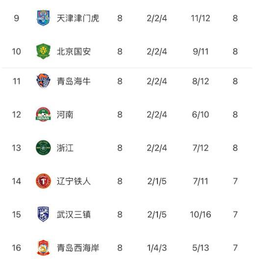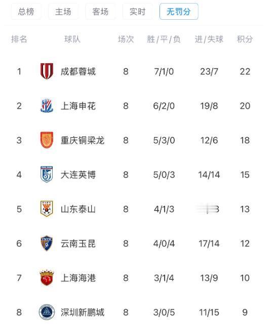 看看无罚分的中超联赛排名榜,第八轮结束后成都蓉城继续领跑,上海申花排名第二,辽宁铁人队和武汉三镇还有青岛西海岸并列倒数第一。 不考虑罚分,成都蓉城也是排名第一,他们7胜1平积22分继续领跑积分榜,上海申花6胜2平紧随其后,但因为被罚10分,他们实际排名还只是第五名。 老牌强队北京国安、山东泰山、上海海港实力下滑明显,目前距离第一集团差距明显。 重庆铜梁龙5胜3平继续不败,积18分排名第三。大连英博、云南玉昆这些中超新贵表现的越来越好,他们紧随成都蓉城和上海申花。 而辽宁铁人队三连败后实际成绩已经滑落到最后一名,和武汉三镇和青岛西海岸都是积7分,只不过依靠没有罚分才没有排名最后。