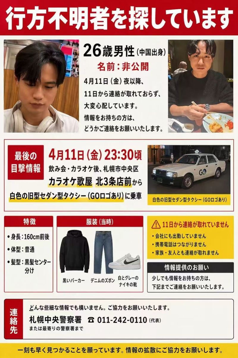 寻人启事显示,王潇于4月11日23时30分左右参加完朋友聚会,独自乘坐出租车离开后失联,“希望见过王潇的朋友提供线索,在日华人、札幌留学生帮忙留意”。