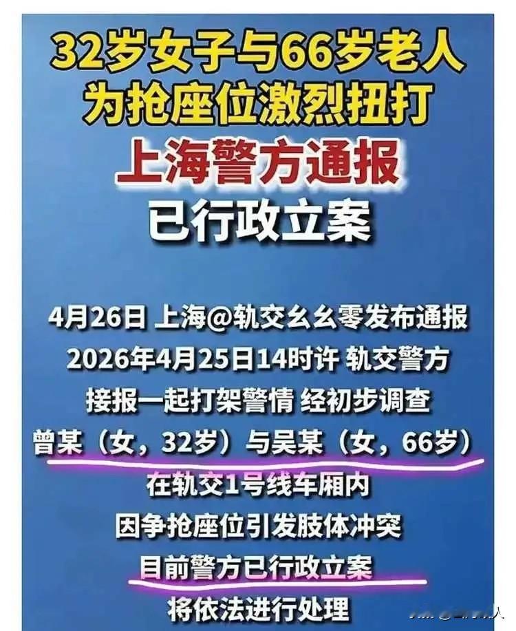 地铁到站了,女子飞快冲上去为自己抢到一个座位,哪知道,一个66岁的大妈早就盯上了这个位置,只是慢了一步,眼睁睁看着女子坐了下去。大妈不愿意了,先是指责女子不该和她抢位置,说着说着竟动起手来,薅住女子的头发就把她拽了起来。 4月25日,上海地铁1号线上上演了一幕让人唏嘘的闹剧。为了一个座位,33岁的年轻女子与66岁的大妈爆发激烈冲突,最终两人因互殴双双被行政拘留。一场本可以避免的小摩擦,演变成肢体暴力与舆论热议,背后折射出的公共秩序与情绪管理问题,值得所有人深思。 当天,上海地铁1号线如同往常一样拥挤,车厢内人潮涌动,座位供不应求。列车到站后,一名年轻女子眼疾手快,迅速冲上前,成功抢到一个座位,刚一坐下,心里刚松了一口气,却没注意到,身后有一位66岁的大妈早已盯上了这个位置,只是慢了半步,眼睁睁看着女子坐了下去。 这一“慢一步”,瞬间点燃了大妈的火气。她当即拉下脸,上前指责年轻女子不该和她抢座位,言语间满是不满与指责。33岁的女子也是正值血气方刚的年纪,面对大妈的无端指责,自然不肯示弱,双方当场发生口角,争执迅速升级。 谁也没想到,争执几句后,大妈情绪突然爆发,直接动起手来,一把薅住女子的头发,用力将她从座位上拽了起来。女子被这突如其来的暴力攻击彻底激怒,也不甘示弱,立刻展开反抗,双方扭打在一起。 车厢里的乘客瞬间被这一幕惊呆了,纷纷停下脚步围观。在这场互殴中,虽然女子年纪更小、身体素质更占优势,但大妈凭借一股蛮劲,死死拽住女子的头发不肯松手,甚至扯开嗓门向周围围观的人喊话,声称自己被欺负,试图博取同情。 现场画面传开后,不少网友调侃:“真是没想到,年轻人的身体素质居然打不过老年人,这力气差距看着也太大了。”也有人感慨:“还好大妈只是动手互殴,没有借机碰瓷讹人,不然这个女子就得后悔一辈子了。” 随着冲突不断升级,车厢秩序被严重扰乱,地铁客服接到乘客报警后,迅速联系警方。警察很快赶到现场,将双方带离地铁车厢进行调查。据亲眼目睹互殴过程的乘客详细讲述,事情的起因确实是大妈先动手薅头发,女子是被迫还手自卫,并非主动挑衅。 然而,最终的处理结果却让不少网友感到不解:明明是大妈先动手施暴,女子只是正当防卫,为什么最后两人都会被行政拘留? 警方对此给出了明确解释:无论是谁先动手,只要发生了互殴行为,且造成了现场秩序混乱、影响了公共交通运行,就已经构成了扰乱公共秩序的违法行为。 这个处理结果,瞬间在网络上引发激烈讨论。大部分网友表示理解:公共场合讲究的是秩序与包容,一个座位本不是什么大事,无论年龄大小,都应该礼让为先,就算抢不到,也不该动怒动手。冲动之下的互殴,已经超出了正常争执的范畴,破坏了公共秩序,付出代价也是必然。 也有网友为女子鸣不平:“大妈先动手施暴,女子只是自卫,这也太冤了!”但更多人指出,即便对方是老年人,也不能成为动手打人的理由,女子选择还手,同样让冲突升级,双方都要为自己的冲动行为负责。 这场地铁抢座闹剧,看似是一个座位引发的小事,却暴露了当下不少人的情绪管理问题。在拥挤的公共空间里,每个人都有自己的压力与不易,一个座位可能关乎一时的舒适,但绝不值得为此大动干戈。 66岁的大妈,本该是懂得礼让、维护公共秩序的长辈,却因为慢一步抢座,就动粗施暴,不仅失了体面,也触犯了法律;33岁的女子,明明可以理性沟通,却非要硬碰硬,被迫还手的同时,也让自己陷入了法律纠纷,实在得不偿失。 如果当时双方都能各退一步,大妈不因为抢不到座就情绪失控动手,女子也能心平气和地解释一句,或者主动提出让座,这场闹剧完全可以避免。冲动是魔鬼,一句口角、一次肢体冲突,看似小事,却可能演变成难以挽回的后果,既影响自身,也扰乱社会。 这件事也给全社会提了个醒:公共场合,多一份礼让,少一份计较;多一份冷静,少一份冲动。无论年龄大小、身份高低,在法律与秩序面前,人人平等。任何试图用暴力解决问题的行为,最终都将付出相应的代价。 愿我们都能在公共生活中,保持理性与包容,少一些情绪冲动,多一些相互理解,让公共空间成为文明与善意的聚集地,而非冲突与矛盾的发酵地。