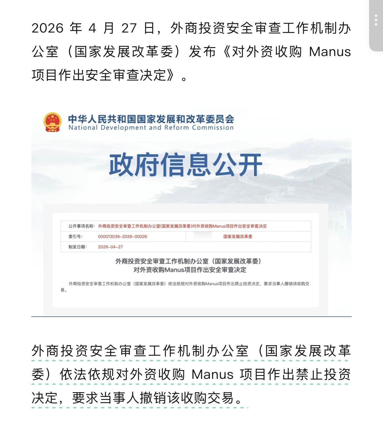 禁止外资收购Manus项目不知道创始人现在国内还国外。如果已经卖掉,那不至于现在