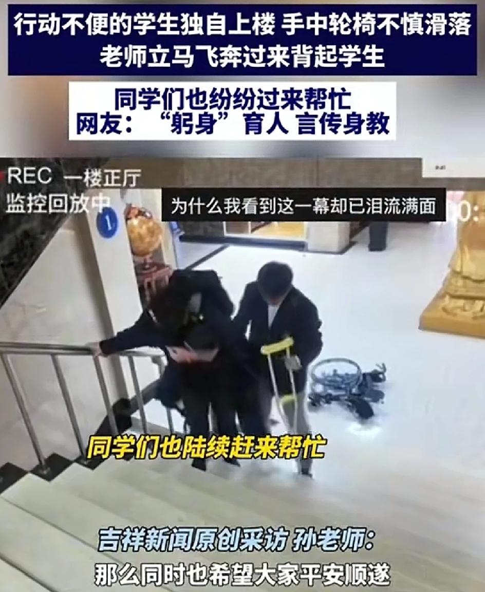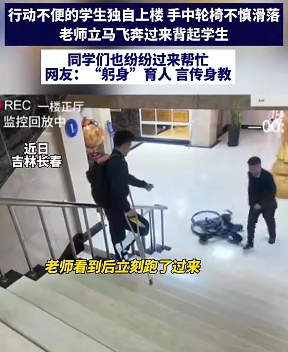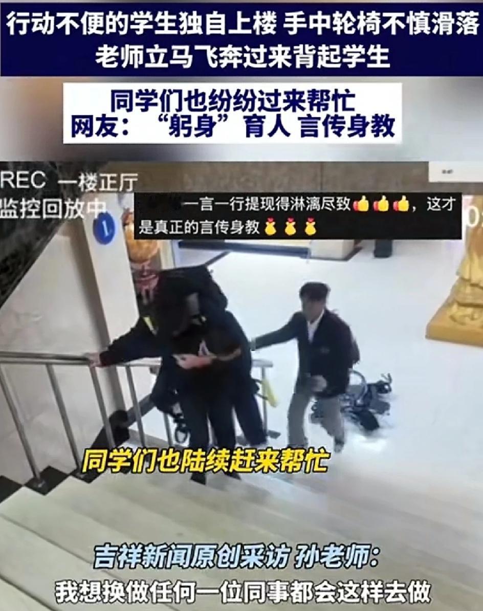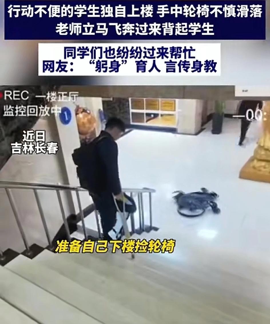 行动不便的学生独自上楼。坐着的轮椅突然滑落。老师立马飞奔过来 这学生上了,同学们也纷纷过来帮忙。这就是真正的躬身育人,言传身教。 莫以恶小而为之,莫以善小而不为。无论在什么时候,遇到了困难的人,能帮一把是一把。中华传统美德不可弃,中华传统美德一直都在。只要人人都奉献一点爱,世界将变成美好的人间。