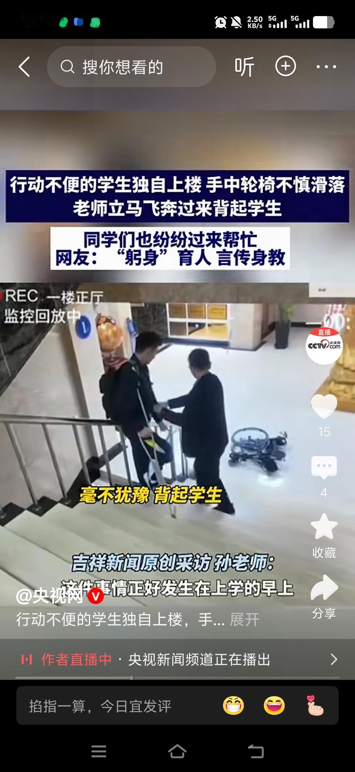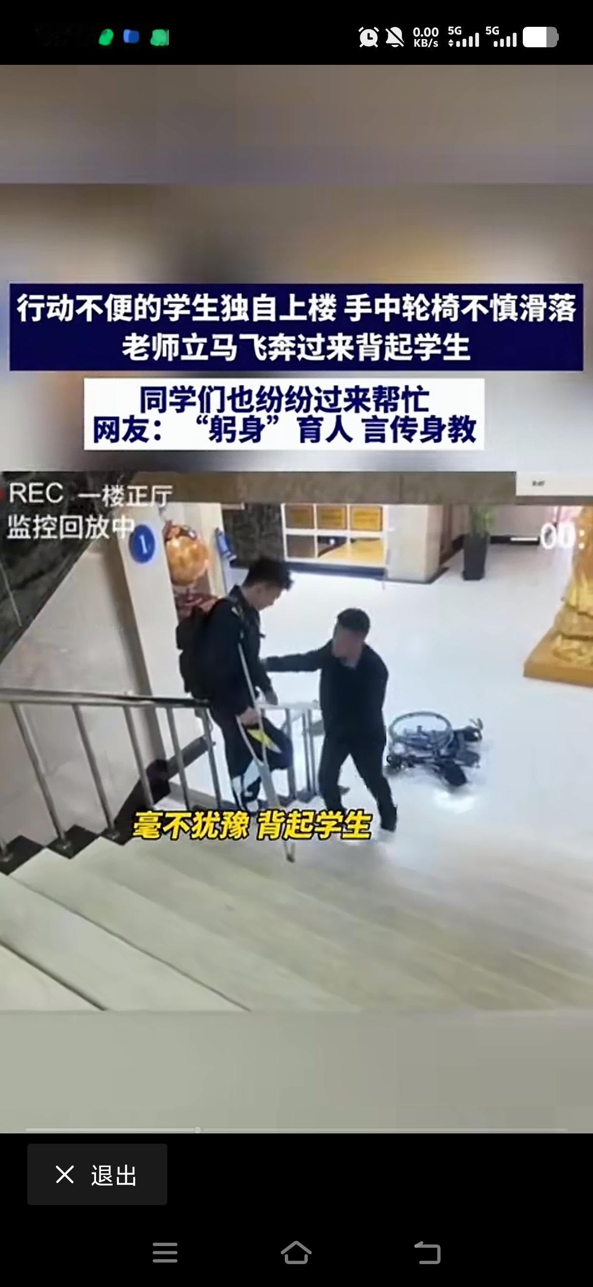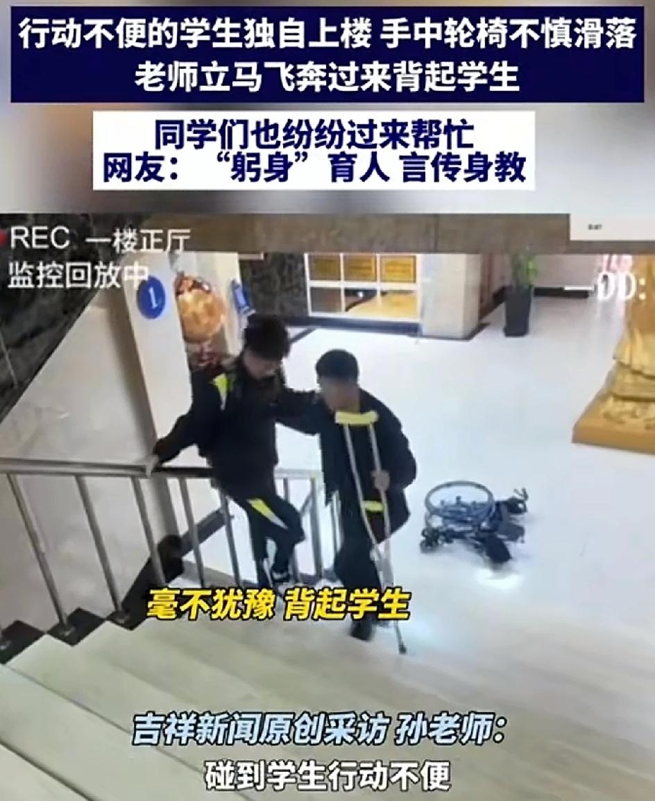 行动不便的学生独自上楼。坐着的轮椅突然滑落。老师立马飞奔过来 这学生上了,同学们也纷纷过来帮忙。这就是真正的躬身育人,言传身教。 莫以恶小而为之,莫以善小而不为。无论在什么时候,遇到了困难的人,能帮一把是一把。中华传统美德不可弃,中华传统美德一直都在。只要人人都奉献一点爱,世界将变成美好的人间。