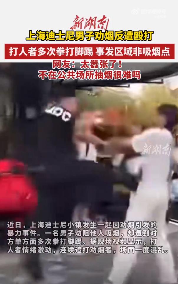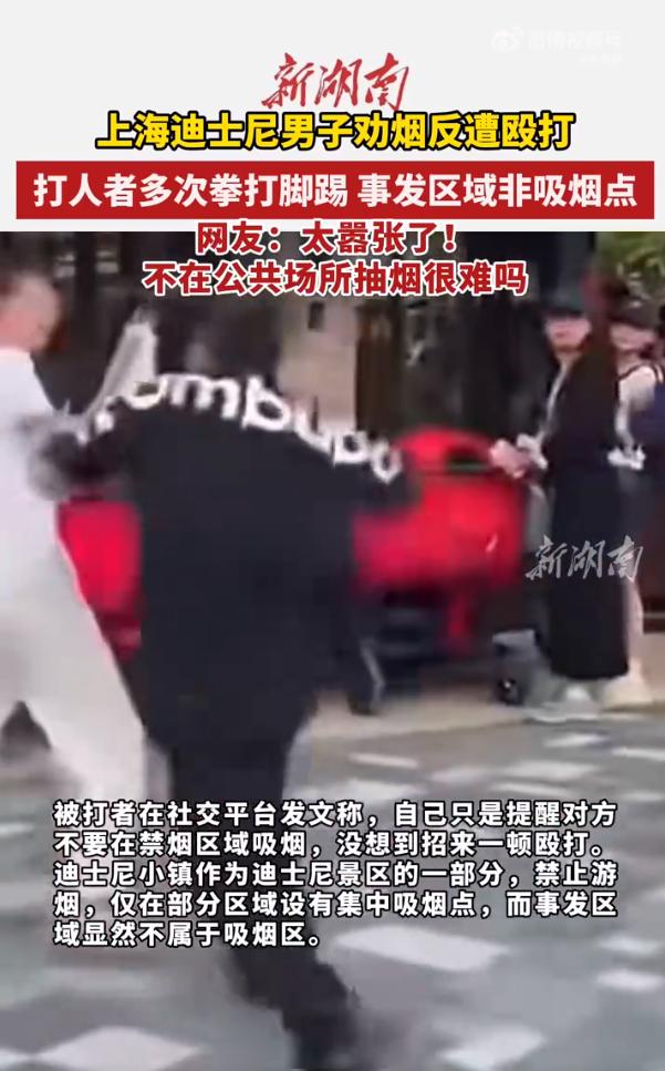 公共场所吸烟还打人别太离谱! 上海迪士尼小镇,有人在非吸烟区抽烟,旁边就是婴儿车和排队的老人小孩,路人好心提醒,结果被追着打。 视频里看得清清楚楚,打人者情绪失控,连续扇巴掌、拳打脚踢,劝烟的人全程没还手,特别克制。 迪士尼小镇明明到处都是禁烟标识,官方规定只有指定区域能抽烟,事发地离吸烟区还很远。现在在公共场合善意劝阻都要冒着被打的风险,也太寒心了。 上海迪士尼公共场合吸烟男子在迪士尼抽烟闹事 迪士尼回应