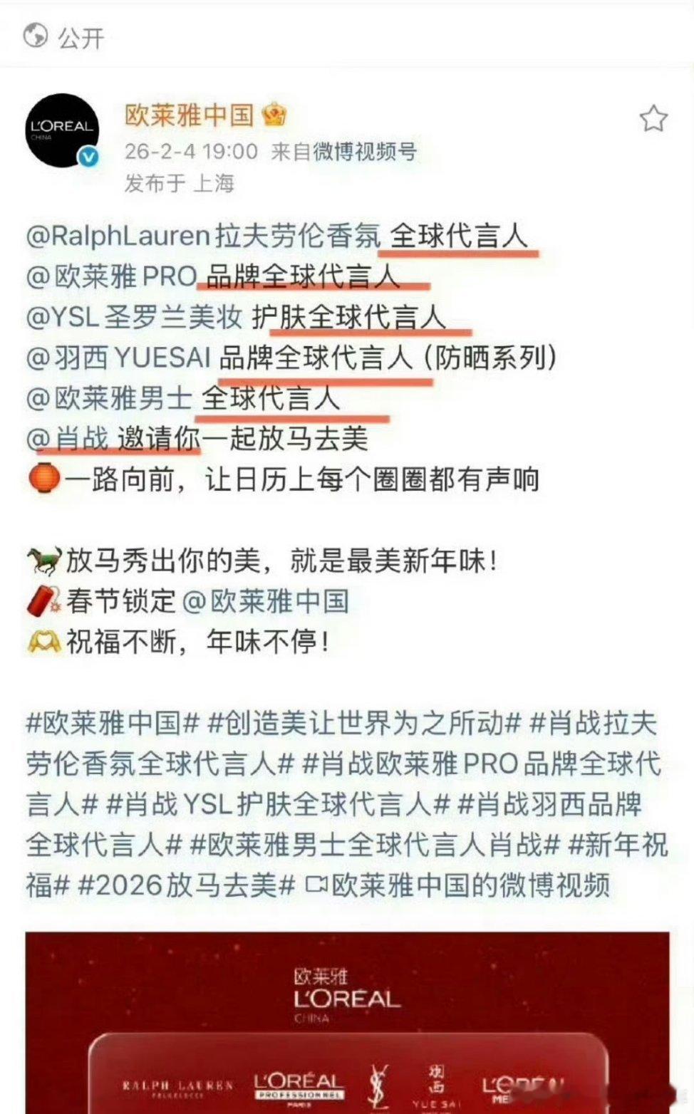 肖战欧莱雅pro品牌全球代言人欧莱雅年度战略大会发布:“2026第一季度领跑市场”!欧莱雅「超级代言人」体系成型:中国市场32个品牌,近六分之一由肖战代言,全球最大化妆品集团,正把肖战放进前所未有的核心位置 😎欧莱雅如此信任肖战,是流量、形象、口碑和专业等多方面因素共同作用的结果。巨星肖战,就是了不起肖战欧莱雅pro品牌全球代言人