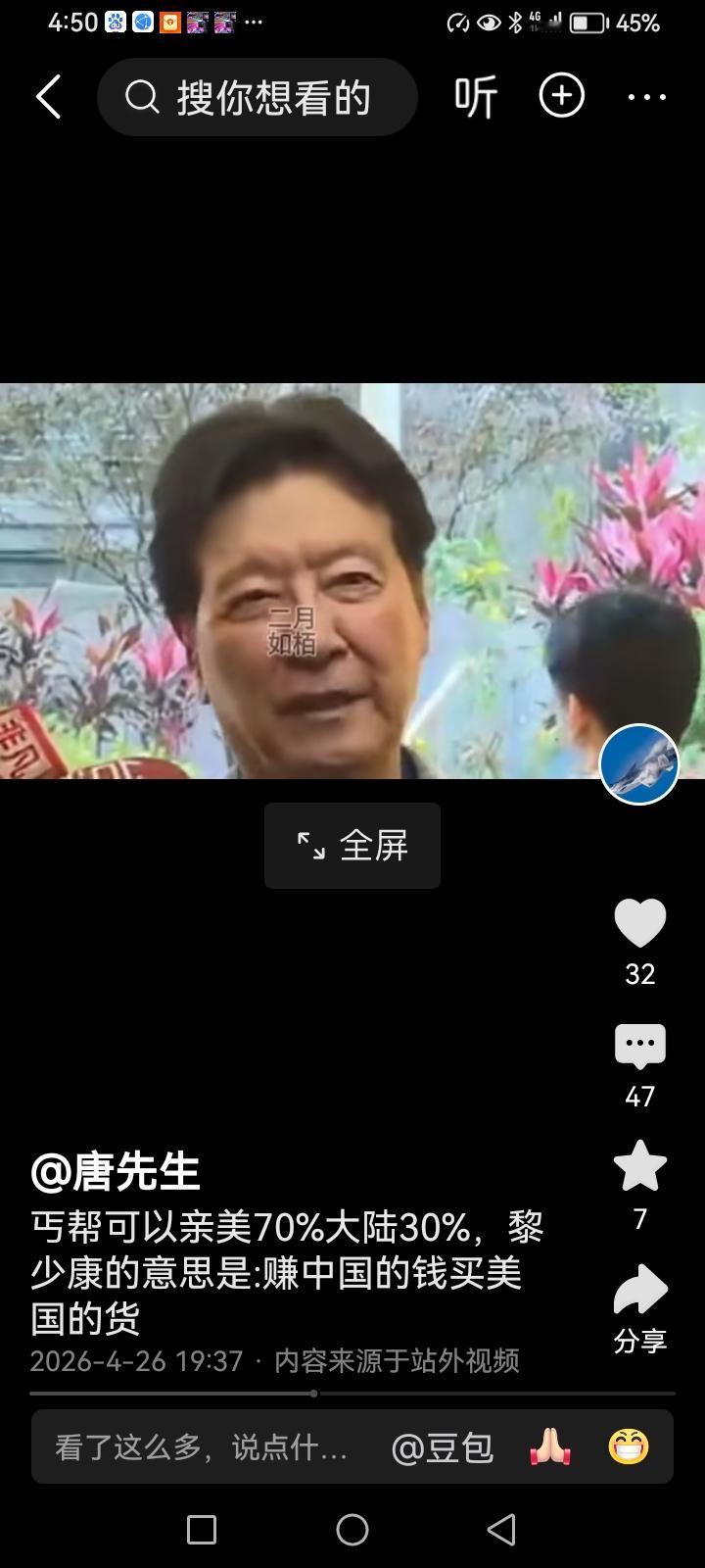 赵少康说:“蓝营的高层都是在在美国读书的,获得的美国的博士或者是硕士学位,拿着美国的奖学金,所以,蓝营都是亲美的,蓝营和美国有七八十年的交情,所以蓝营没有人反美。但是也不能像民进党一样,对美国100分,对中国0分。台湾离中国那么近,市场那么大,我们为什么跟大陆整的那么紧张呢?至少要对等,对美国50分,对大陆50分。最少对美国六七十分,对大陆30分。” 听听赵少康的话,想美国大陆两边通吃,两边捞好处?有那么好的事吗?” 国民党里的一些人,见到美国就跪,见到大陆就要对等尊严,既想挣大陆的钱,又想拿捏大陆,想的美。欢迎评论区留言