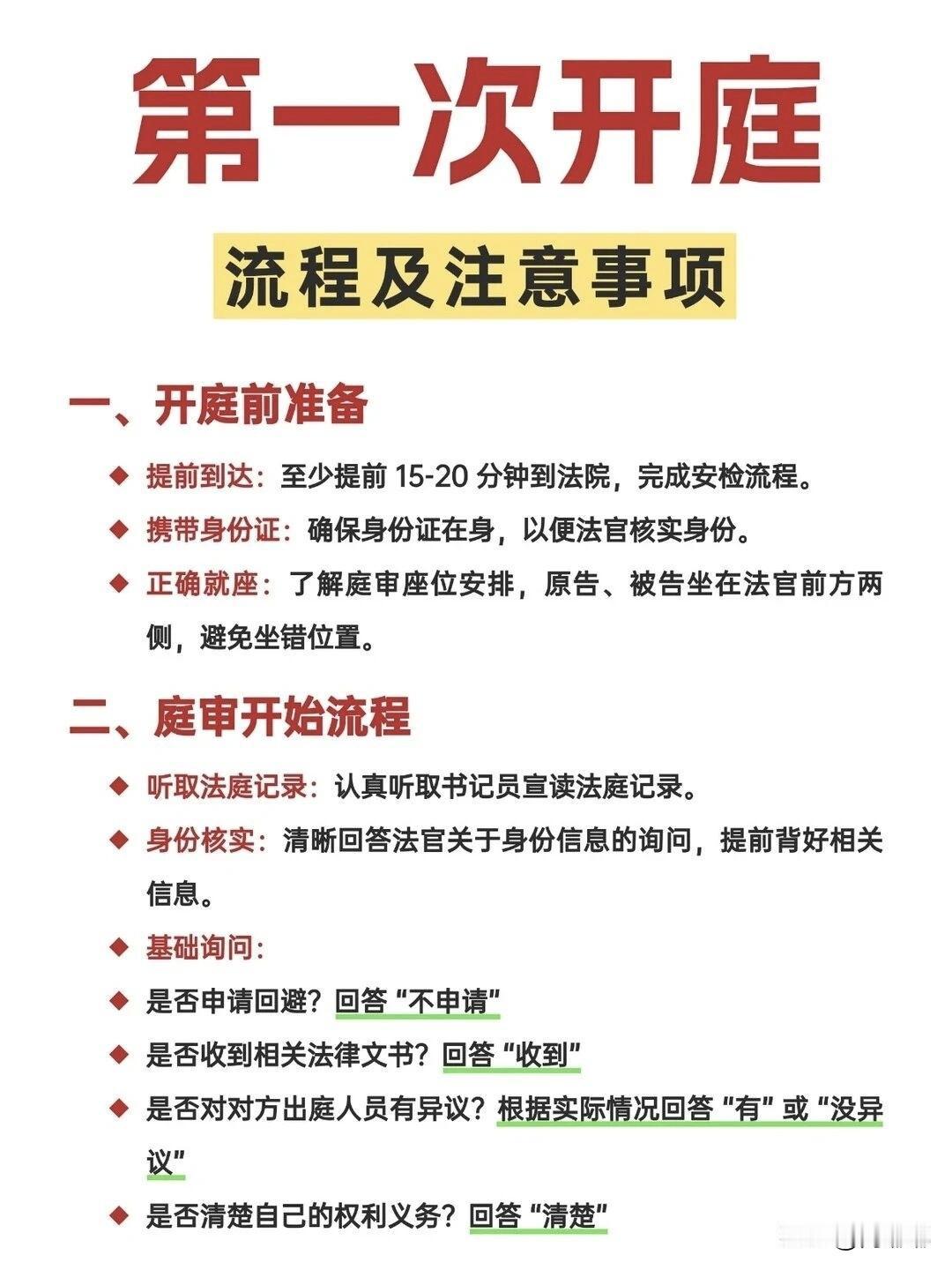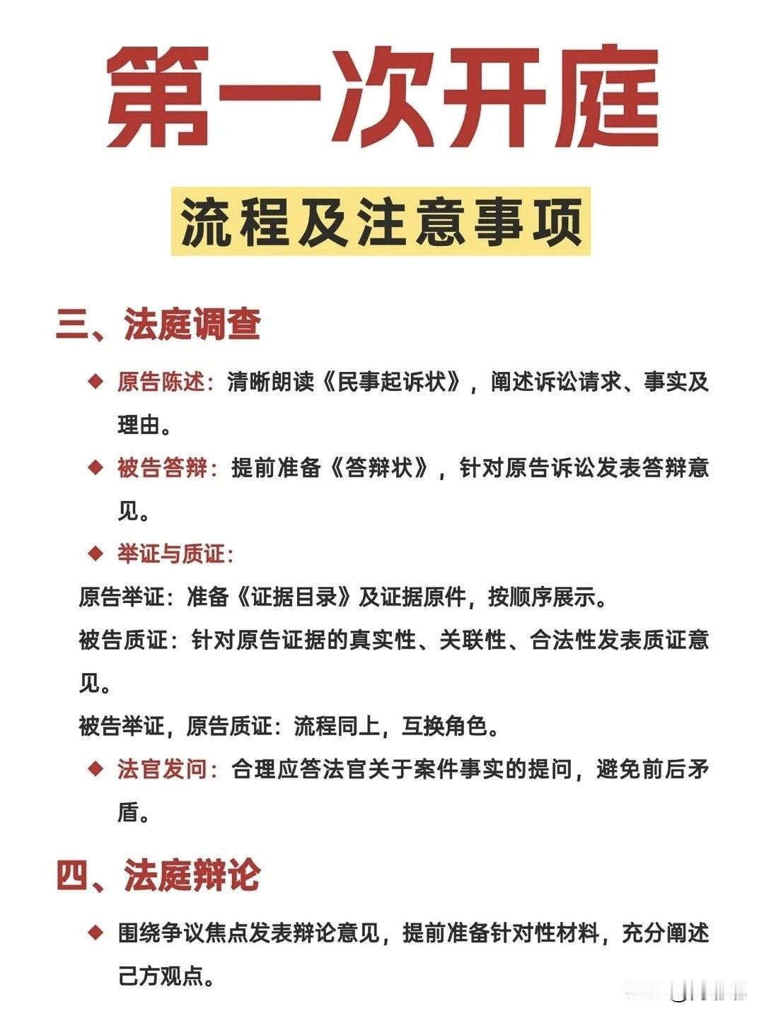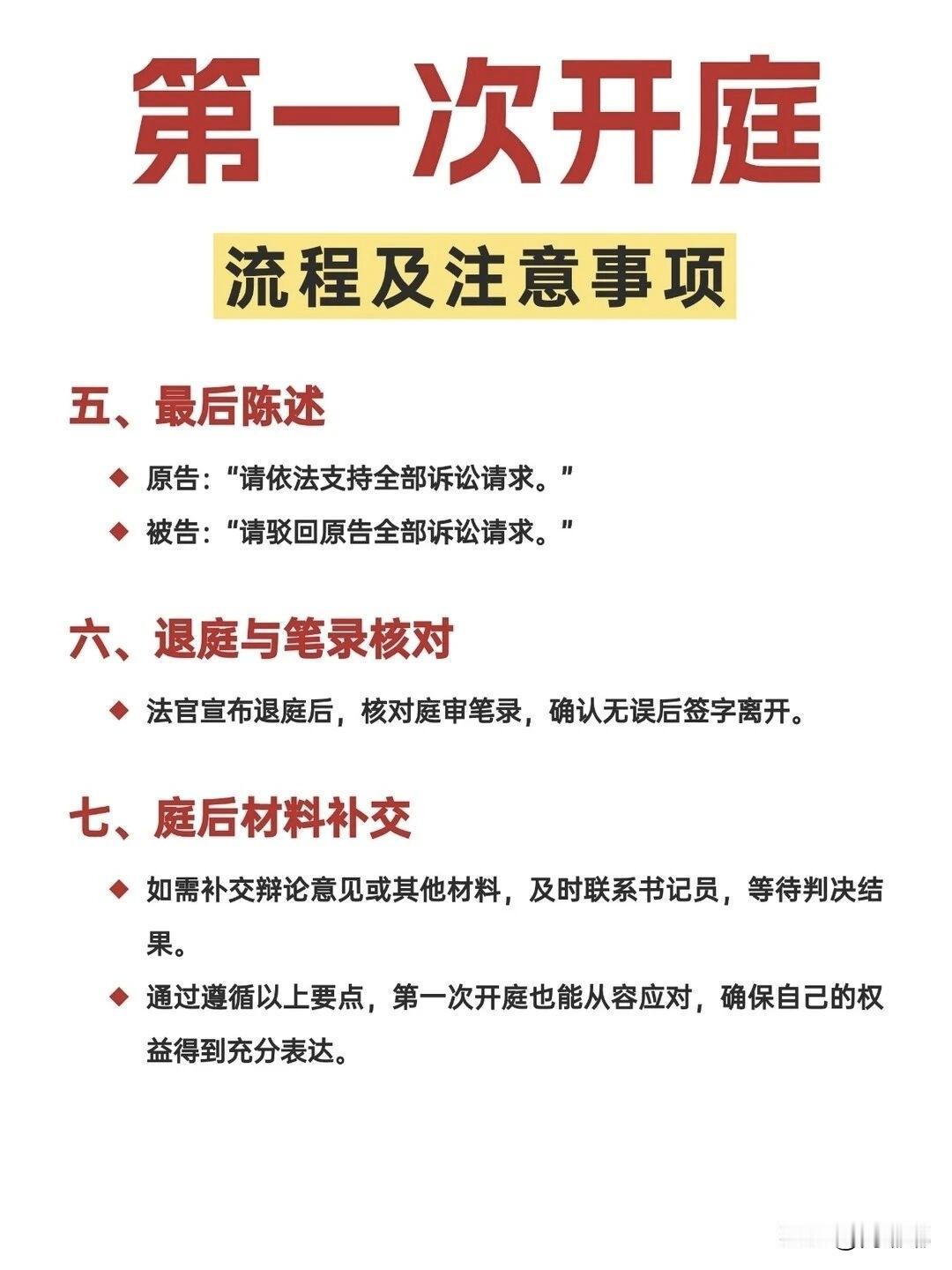第一次开庭流程及注意事项。[祈祷]相信很多人只是在影视里看到过开庭的情况,现实生活中,谁第一次上法庭,心里都没底?那第一次开庭要注意哪些呢? 先说流程吧,大概分几步:↓ 一定要提前到法院,找到法庭。一般书记员会先来,核对你和对方都没到,查看身份证。 法官进来坐下,敲一下法槌,正式宣布开庭。 法庭调查,这是核心环节。先由原告说你要求什么,理由是什么,再由被告答辩。法官归纳争议焦点,双方轮流出示证据,一定要听明白再说,别抢话。 法庭辩论,法官会问双方有没有新的意见。注意别跟对方吵,法官不让。 最后陈述,每人说一句总结性的话,比如“请求法院支持我的诉求”,或者“请求驳回对方”等等。 休庭或宣判,绝大部分案子不会当庭出结果,法官会说择期宣判,然后核对笔录签字,就可以走了。 说几点要注意的事:↓ 带齐东西,身份证,传票,所有证据原件和复印件。 别迟到,你晚到一会,法官可能直接按撤诉或者缺席审理,到时候哭都没用。 着装干净整洁,不用穿太正式,但是也不能太随便。 说话有规矩,法官问谁谁说话,对方说的时候不要插嘴,想发言先举手。说的每句话书记员都会记录下来,签字时要看清楚再签。 不要情绪失控,在法庭上拍桌子骂人,法警真的会把你请出去。 调解可以同意,也可以拒绝。 第一次开庭谁都会紧张,法官不会因为你说错一句话就判你输,关键是证据和道理站在你这边。 实在不行,开庭前把自己想说的要点写下来,到时候照着念也可以。 希望能帮到大家。 对此,评论区各位朋友怎么看?法庭诉讼流程 开庭发问技巧 法官审案流程 开庭后感悟 庭审常识