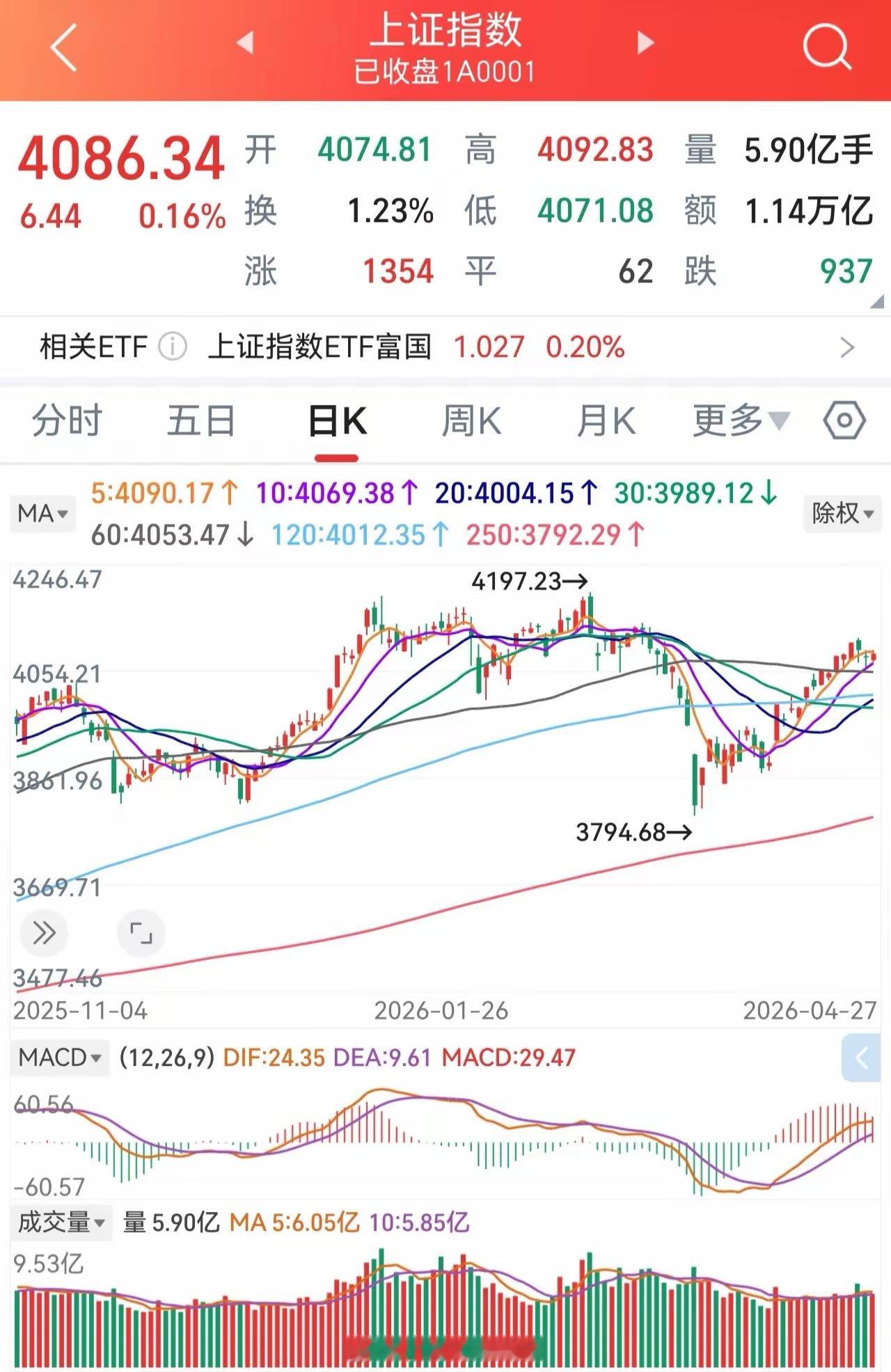 是不业绩不太好的公司都刻意拖到月底披露,想尽量冲淡负面影响?今天大盘整体“红肥绿瘦”,上涨个股3284家,涨停84家,但跌停也有52家,这个数字可不小。市场缩量528亿,成交总额2.61万亿,热度还在,只是情绪略显微妙。我手里那只宝贝股,震荡一整天,最后涨了不到一个点,聊胜于无。它28日才披露业绩报。说实话,越晚披露的,心里越没底,总感觉是业绩不太好,才刻意拖到月底,想尽量冲淡负面影响。这么一想,估计月底这几天都不会太好看。算了,过完五一再说吧。节前不折腾,节后看情况再动。