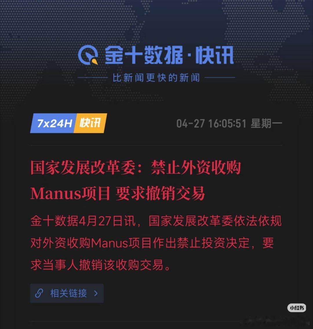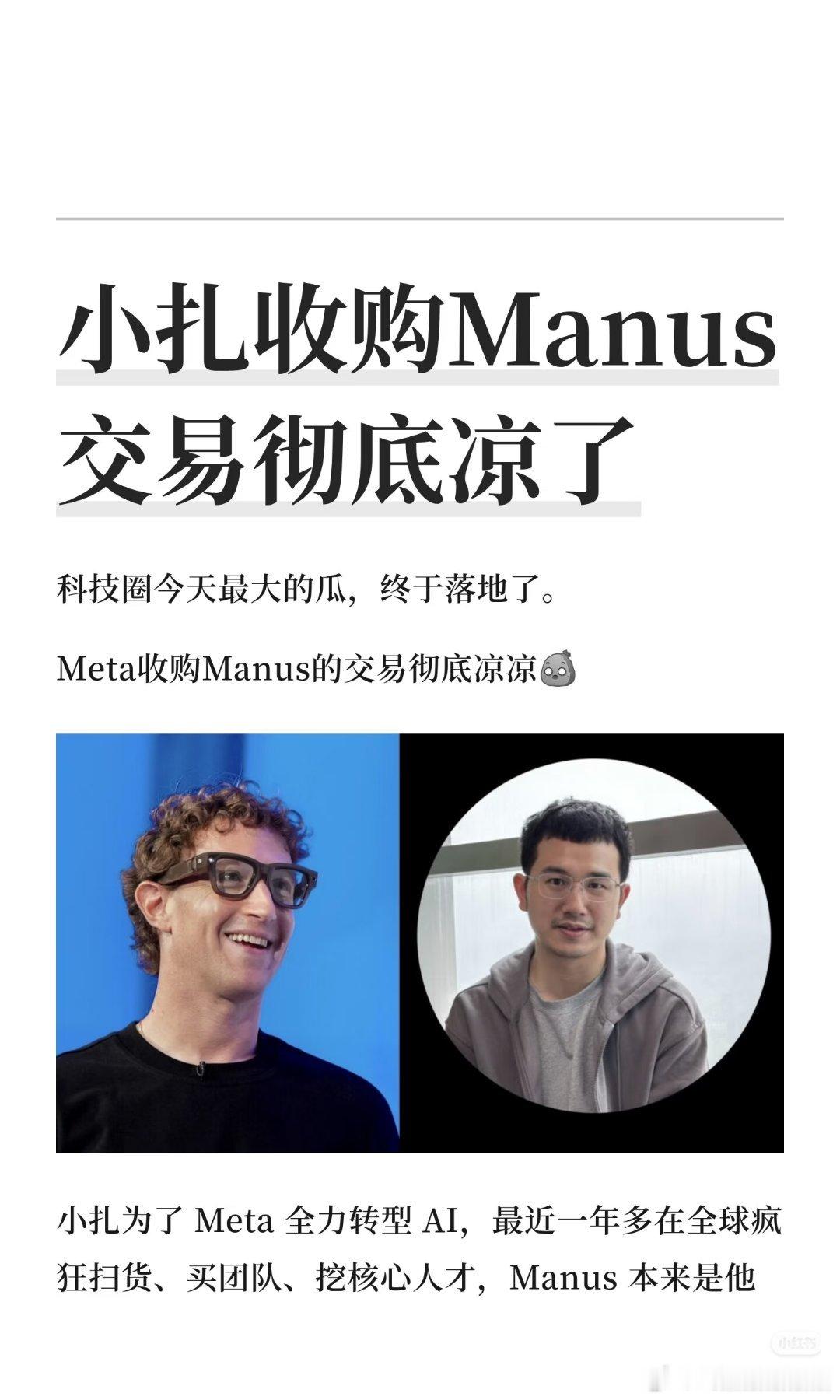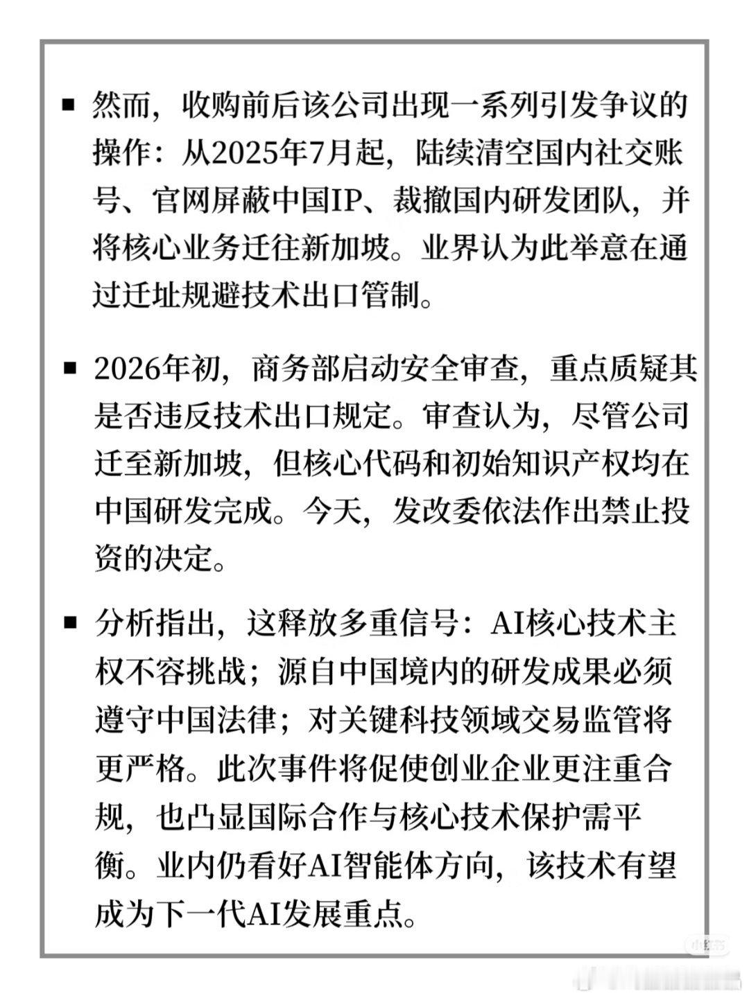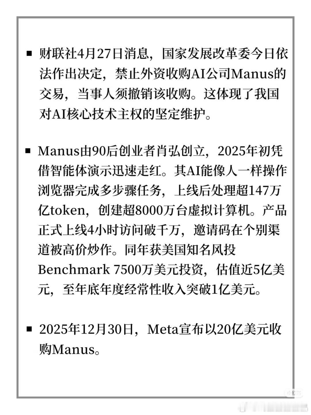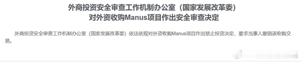 Manus被禁止外资收购。虽然创始人跑到新加坡也没用,因为Manus是利用国内数据训练的大模型。