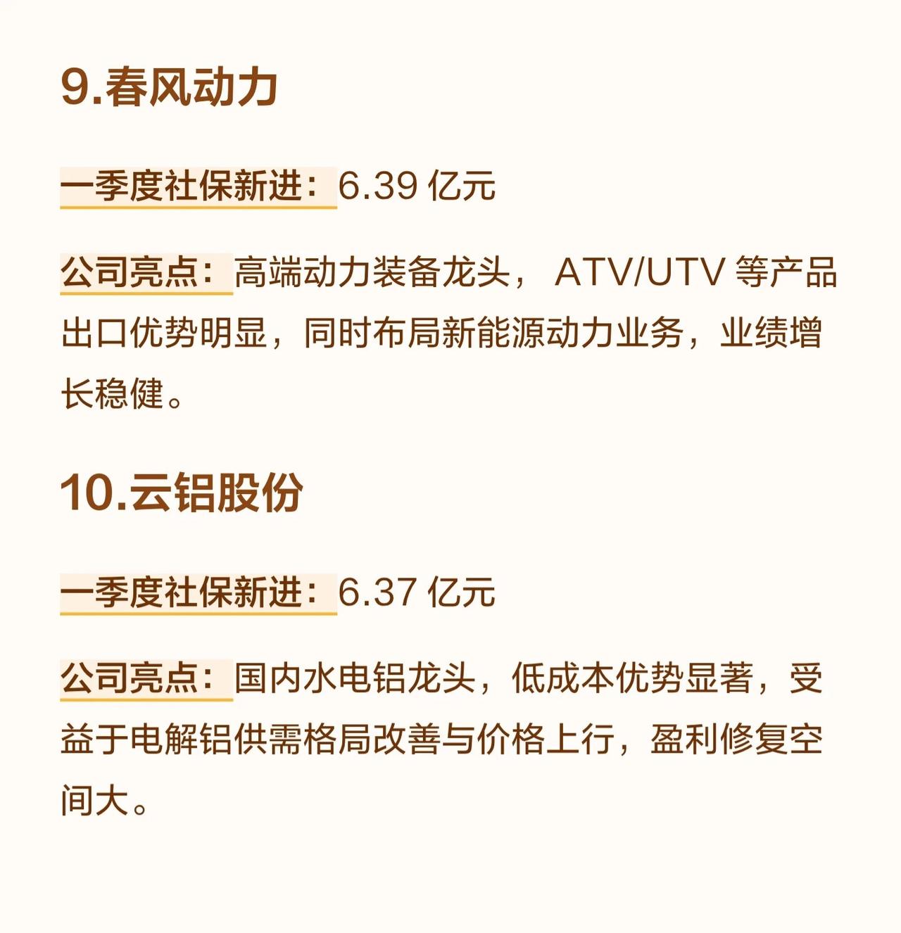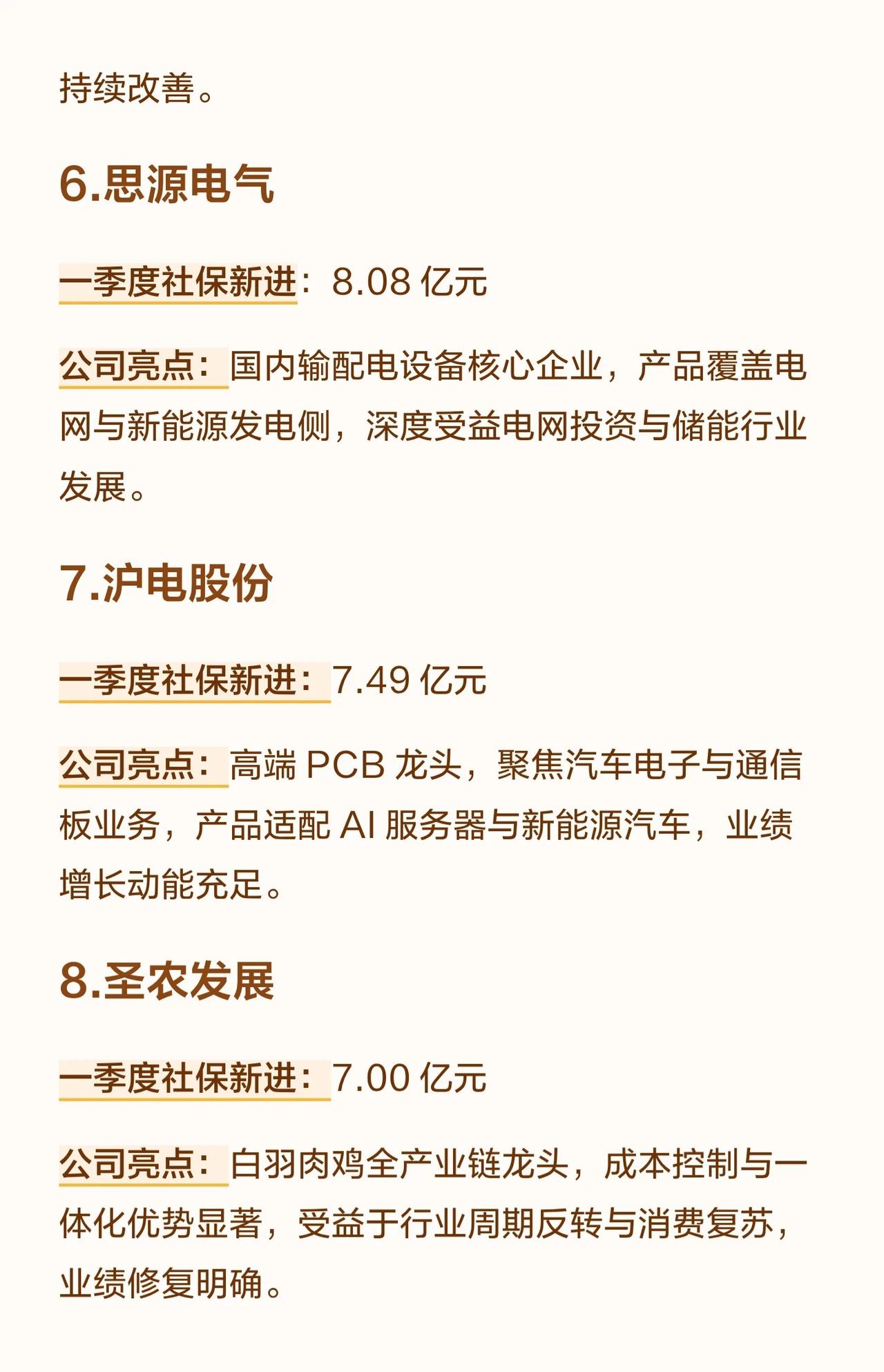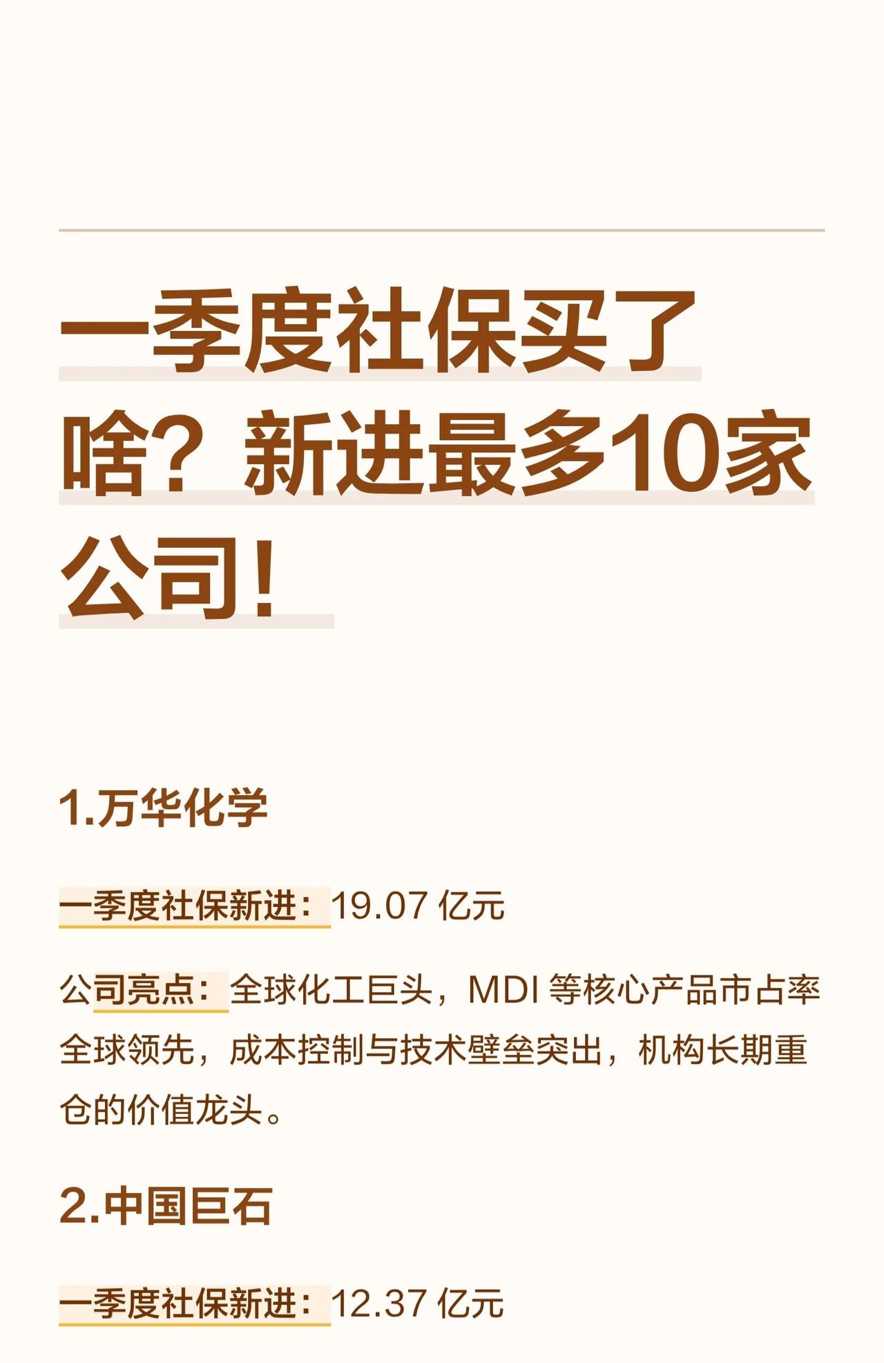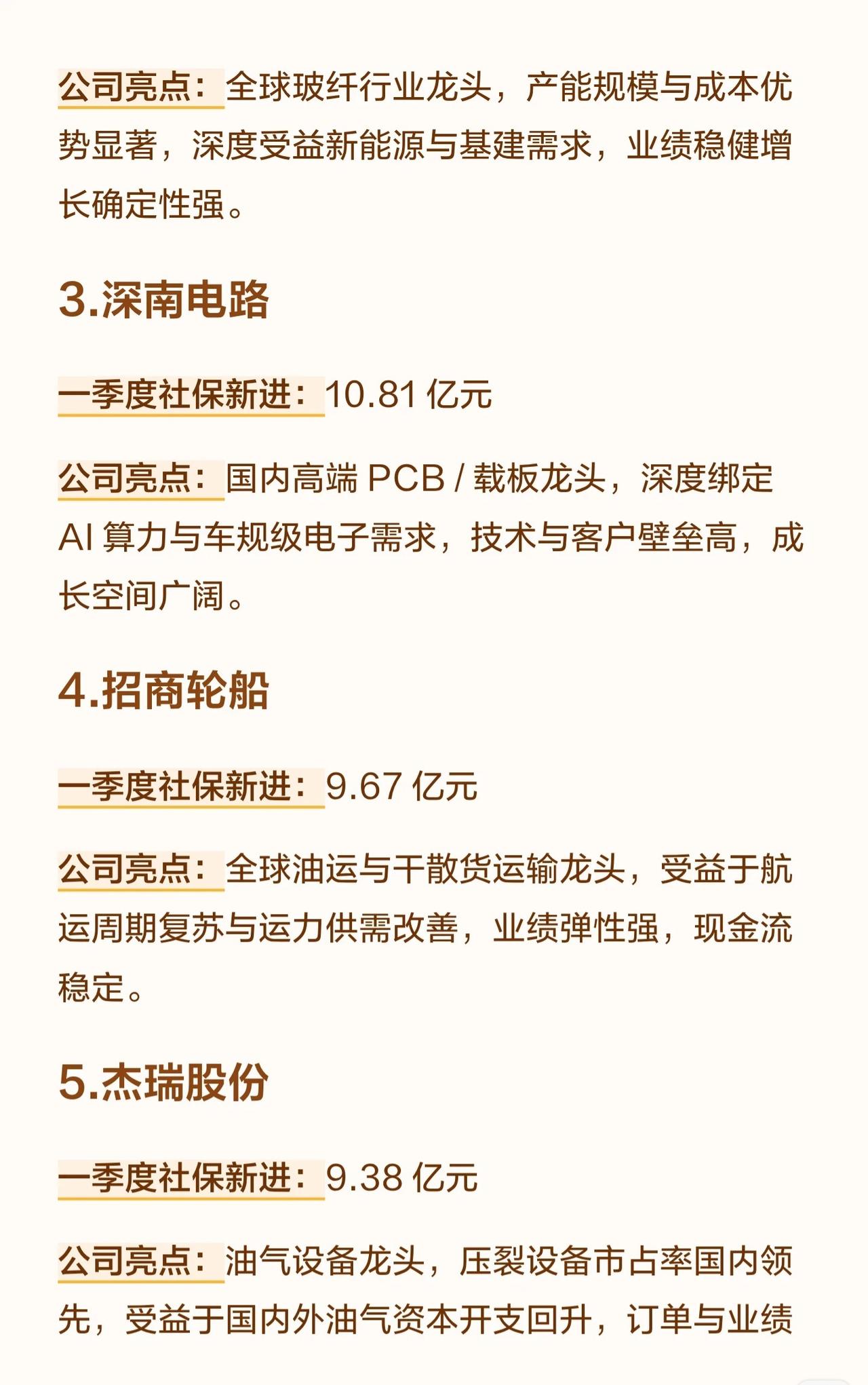 一季度社保基金新进了哪些标的?数据显示,共有10家公司获得了社保基金的大举增持,成为一季度布局的重点方向。 位列榜首的是万华化学,社保基金一季度新进金额达19.07亿元。作为全球化工巨头,公司在MDI等核心产品上拥有全球领先的市占率,成本控制与技术壁垒突出,是机构长期重仓的价值龙头。 紧随其后的是中国巨石,新进金额12.37亿元。公司是全球玻纤行业龙头,产能规模与成本优势显著,深度受益于新能源与基建需求,业绩稳健增长的确定性强。 深南电路以10.81亿元的新进资金位列第三。作为国内高端PCB与载板龙头,公司深度绑定AI算力与车规级电子需求,技术与客户壁垒高,成长空间广阔。 第四名是招商轮船,社保新进9.67亿元。公司是全球油运与干散货运输龙头,受益于航运周期复苏与运力供需改善,业绩弹性强,现金流稳定。 第五位杰瑞股份获新进9.38亿元。作为油气设备龙头,其压裂设备市占率国内领先,受益于国内外油气资本开支回升,订单与业绩持续改善。 第六名思源电气新进8.08亿元。公司是国内输配电设备核心企业,产品覆盖电网与新能源发电侧,深度受益电网投资与储能行业发展。 第七名沪电股份获新进7.49亿元。作为高端PCB龙头,公司聚焦汽车电子与通信板业务,产品适配AI服务器与新能源汽车,业绩增长动能充足。 第八名圣农发展新进7.00亿元。公司是白羽肉鸡全产业链龙头,成本控制与一体化优势显著,受益于行业周期反转与消费复苏,业绩修复明确。 第九名春风动力获新进6.39亿元。作为高端动力装备龙头,其ATV/UTV等产品出口优势明显,同时布局新能源动力业务,业绩增长稳健。 第十名云铝股份新进6.37亿元。公司是国内水电铝龙头,低成本优势显著,受益于电解铝供需格局改善与价格上行,盈利修复空间大。 整体来看,社保基金一季度重点布局了具备全球竞争力的高端制造龙头、受益周期复苏的传统行业以及契合AI与新能源趋势的成长赛道,体现出对基本面扎实、具备长期价值企业的偏好。