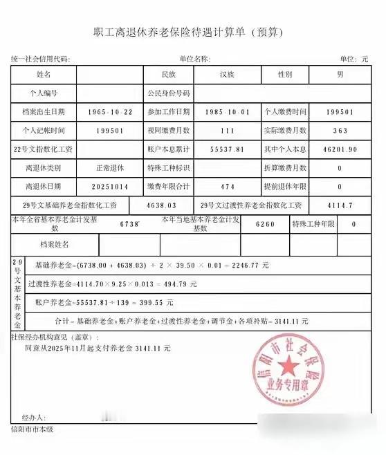 这份养老保险待遇计算单(预发)是哪里的?当然是河南的,因为表格中“本年全省养老计发基数6738”,正是河南省的数据,这基数都比江西还低,河南的职工退休养老待遇怎么样呢? 他1965年10月出生,1985年10月参加工作,刚好20岁。2025年10月年满60岁正常退休,缴费年限合计474个月,其中视同缴费年月111,实际缴费年月363,个人账户养老金累计储存额5553 7.81元。 再看他的一些关键数据:基础养老金指数化工资4638.03,过渡性养老金指数化工资4114.7,本年全省基本养老金计发基数6738,本年当地基本养老金计发基数6260。 他的基本养老由基础养老金、过渡性养老金、个人账户养老金三部分组成,计算方法跟其他省份的计算方法差不多,计算过程在计算单里有具体呈现,清清楚楚明明白白,他的基本养老金合计3141.11元。 作为工龄将近40年的退休人员来说,这点养老金确实不算高,原因在于他的视同缴费年限不高,只有9.25年,还有就是他的个人账户累计储存额60,000都不到,确实是缴费太低了,多交多得、少交少得,也没有什么可埋怨的了。 拥有一份养老金,不管是多还是少,对于退休老人来说,都是一份很好的养老保障。养老金已经连涨20多年了,今年也已定调,即将迎来基本养老金22年连涨,加上预发养老金的二次核算,这位河南朋友的正式养老金在今年2026年会超过¥3200。养老金的逐年增长就像芝麻开花节节高,真好!