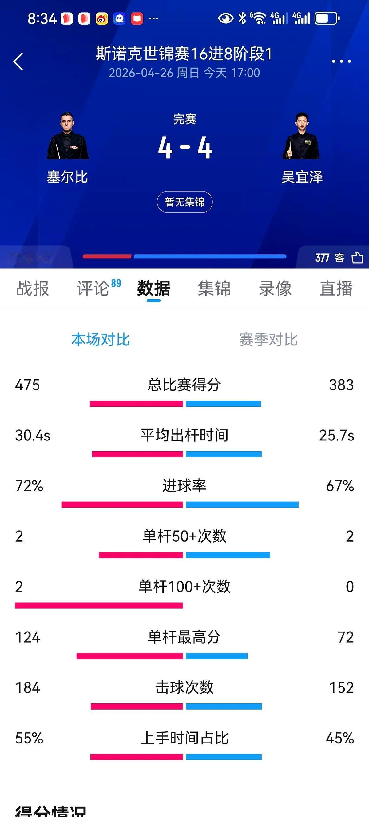 做到任何一点 太可惜了!5比3的好局,硬生生打成了4比4平…… 这说的就是吴宜泽对阵塞尔比的世锦赛。第一阶段第八局,小吴本来形势大好,连147的提示都出来了!结果打到24分,一颗红球因为静电干扰,偏了。 这还没完。 后面防守,他薄一颗远台红球失误,给了对手机会。最要命的是,塞尔比失误把红球送到袋口,小吴打进红球后,自己的母球竟然摔袋了!直接送上自由球! 真的,这三个失误,但凡避免一个,比分就改写了。 要知道对手可是四届世锦赛冠军的“塞大师”啊,开局就轰了两杆破百。吴宜泽能打成这样,已经相当牛了。 第二阶段比赛凌晨两点开打,这下悬念拉满了。你觉得最后谁能进八强?