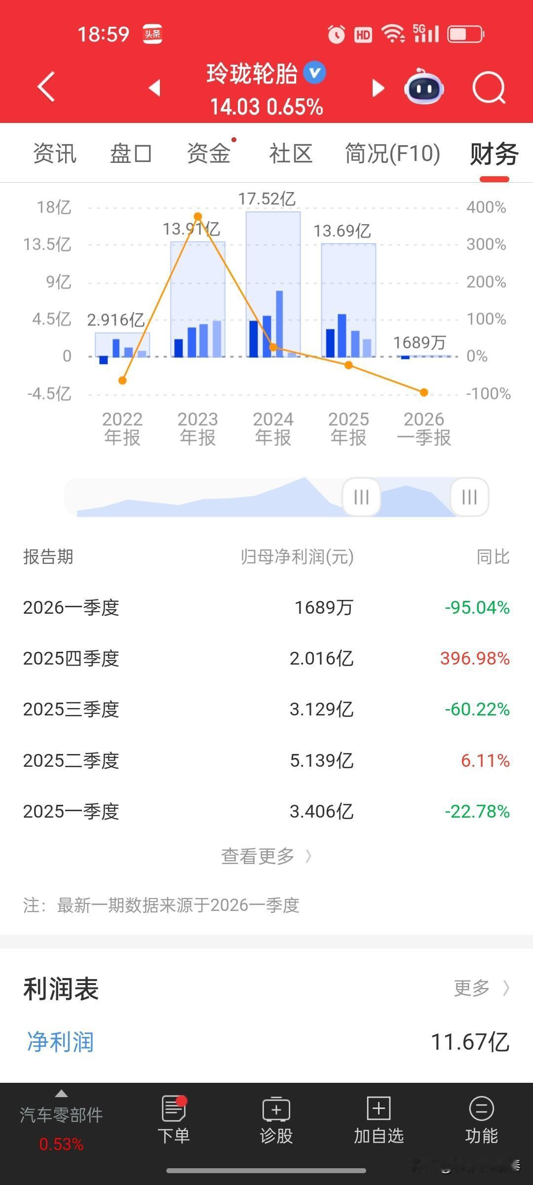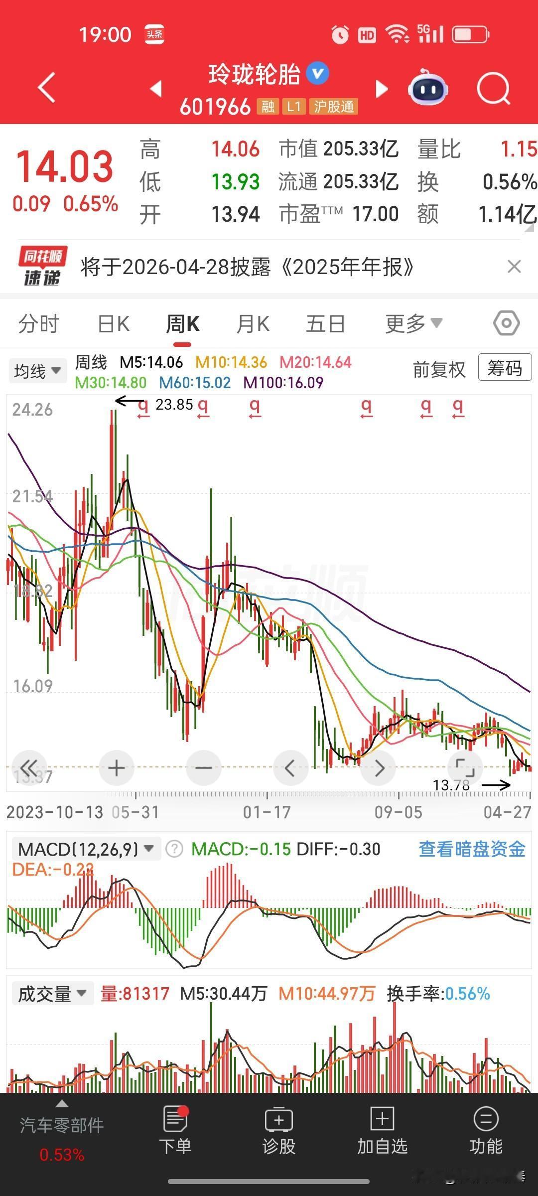 玲珑轮胎(601966)深度点评:业绩断崖式下滑,股价趋势性走弱 一、基本面:业绩从巅峰坠落,行业寒冬下的阵痛 1. 年报数据:利润连续下滑,行业周期拐点显现 - 2023年归母净利润13.91亿、2024年17.52亿,一度创下公司利润高峰; - 2025年归母净利润13.69亿,同比下滑21.86%,利润增速由正转负,行业景气度回落的压力开始显现。 - 分季度看2025年利润结构: - 一季度:3.406亿(同比-22.78%) - 二季度:5.139亿(同比+6.11%) - 三季度:3.129亿(同比-60.22%) - 四季度:2.016亿(同比+396.98%) - 可以看到,2025年利润呈现前高后低的态势,尤其是三季度利润同比暴跌60%,说明行业竞争加剧、成本压力上升,利润空间被持续挤压。 2. 一季报数据:断崖式下滑,行业寒冬直接暴露 2026年一季报数据: - 归母净利润仅1689万元,同比暴跌95.04%,创下近年单季利润新低; - 利润大幅下滑的核心原因: 1. 行业竞争加剧,轮胎价格战打响:国内轮胎产能过剩,海外需求放缓,行业价格战导致产品毛利率大幅下滑; 2. 成本压力反弹:天然橡胶、原油等原材料价格上涨,挤压利润空间; 3. 出口受阻:海外反倾销、贸易壁垒加剧,海外市场订单下滑,作为出口占比超40%的龙头,受影响明显。 3. 估值水平:看似不高,但缺乏业绩支撑 - 当前股价14.03元,对应市值205.33亿,市盈率TTM约17倍,在轮胎行业中处于中等水平; - 但这个估值是基于“行业复苏、利润回暖”的预期,而一季报的断崖式下滑,直接打破了市场预期,估值缺乏足够的业绩支撑,存在向下修正的风险。 二、技术面:周线空头排列,下降趋势尚未结束 1. 股价走势:从高点腰斩,进入趋势性下跌通道 - 股价从23.85元的历史高点持续回落,最低下探13.78元,当前报14.03元,累计回调超40%; - 周线图上,股价已经跌破5周、10周、20周、30周、60周、100周所有均线,形成典型的空头排列,上方每一条均线都是强压力位,短期反弹阻力重重。 2. 量能与资金面:缩量阴跌,资金关注度持续下降 - 近期日均成交额仅1.14亿,换手率不足1%,说明市场资金关注度持续下降,缺乏增量资金推动股价企稳; - MACD指标处于零轴下方,DIFF线在DEA线下方运行,绿柱持续缩短,属于下跌过程中的弱势反弹,尚未形成明确的反转信号,整体趋势仍向下。 三、核心逻辑与风险点 1. 行业逻辑:轮胎行业进入存量博弈期 - 国内产能过剩:国内轮胎产能持续扩张,需求端增速放缓,行业从增量竞争进入存量博弈,价格战难以避免; - 海外需求疲软:欧美经济放缓,海外轮胎需求下滑,叠加贸易壁垒,出口压力持续加大; - 原材料价格波动:天然橡胶、原油价格波动,对公司成本控制能力提出挑战,利润稳定性较差。 2. 公司风险点:业绩下滑+海外业务承压 - 业绩下滑超预期:2026年一季报利润暴跌95%,说明公司盈利能力大幅下滑,后续若行业竞争加剧,利润可能继续承压; - 海外业务风险:公司海外工厂、出口业务占比高,地缘政治、贸易摩擦、汇率波动都会对业绩产生直接影响; - 行业龙头竞争加剧:国内轮胎龙头企业扩产、降价抢市场,玲珑轮胎的市场份额和毛利率面临双重挤压。 四、操作建议(风险厌恶型投资者参考) 1. 短期:观望为主,不急于抄底 当前股价处于明确的下降通道,均线压力重重,业绩层面也未出现企稳信号,抄底的风险远大于收益,建议以观望为主。 2. 中期:重点跟踪二季度业绩,验证行业复苏逻辑 2026年二季度是轮胎行业的传统旺季,二季度业绩能否止跌回升,是判断公司经营是否改善的关键: - 若二季度利润环比大幅改善,说明行业景气度有所回升,股价才有机会突破均线压力; - 若二季度利润继续下滑,全年业绩大概率不及预期,股价可能进一步下探。 3. 长期:行业龙头仍有韧性,但需耐心等待周期反转 作为国内轮胎行业龙头,公司在产能布局、海外市场、技术研发上仍有优势,长期受益于轮胎替换需求增长;但当前行业处于下行周期,短期难以出现趋势性行情,需耐心等待行业周期反转。 一句话总结 玲珑轮胎2025年利润增速放缓,2026年一季报利润断崖式下滑,行业寒冬压力直接暴露,股价处于明确的下降通道,短期缺乏企稳信号,中期需跟踪二季度业绩验证行业复苏逻辑,长期需等待行业周期反转,当前不具备配置价值。 以上内容均为个人观点与解读,仅供参考,不代表平台立场,也不构成任何投资或决策建议。 (信息来源:上海证券交易所、同花顺财经,