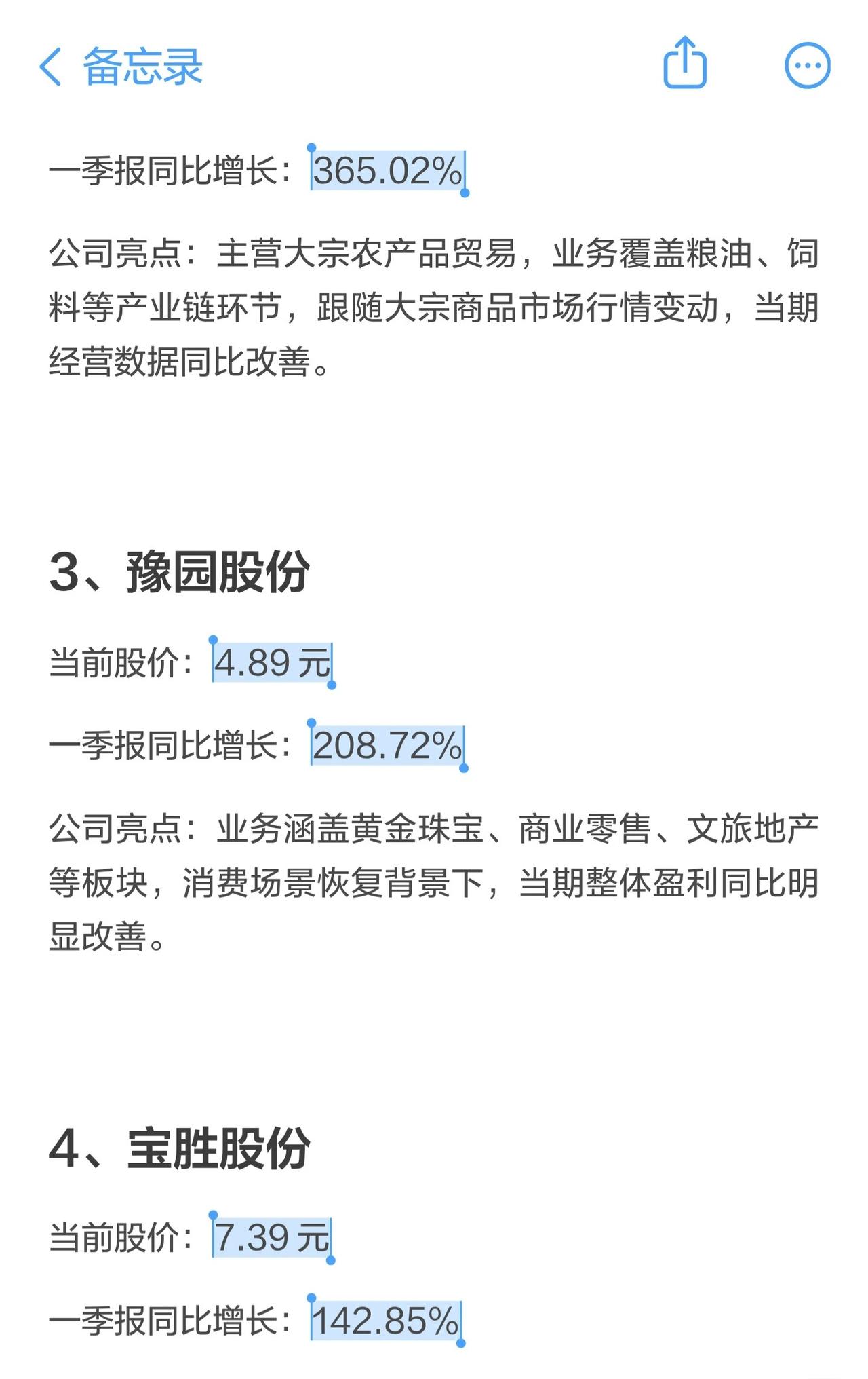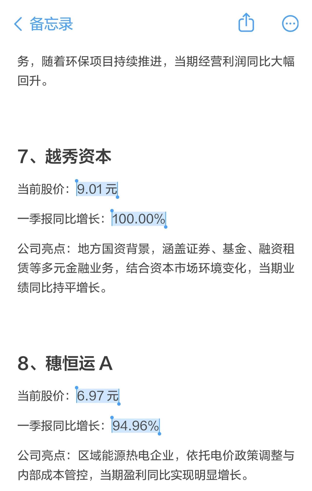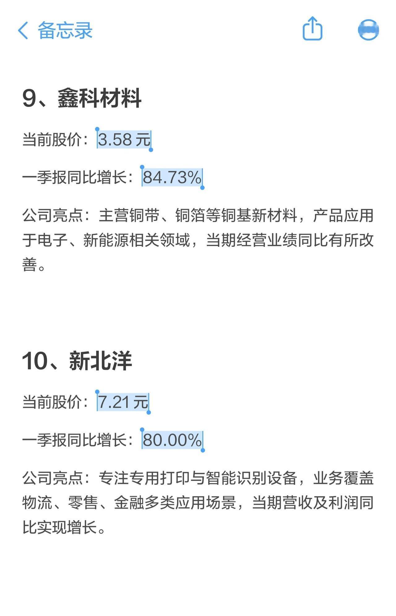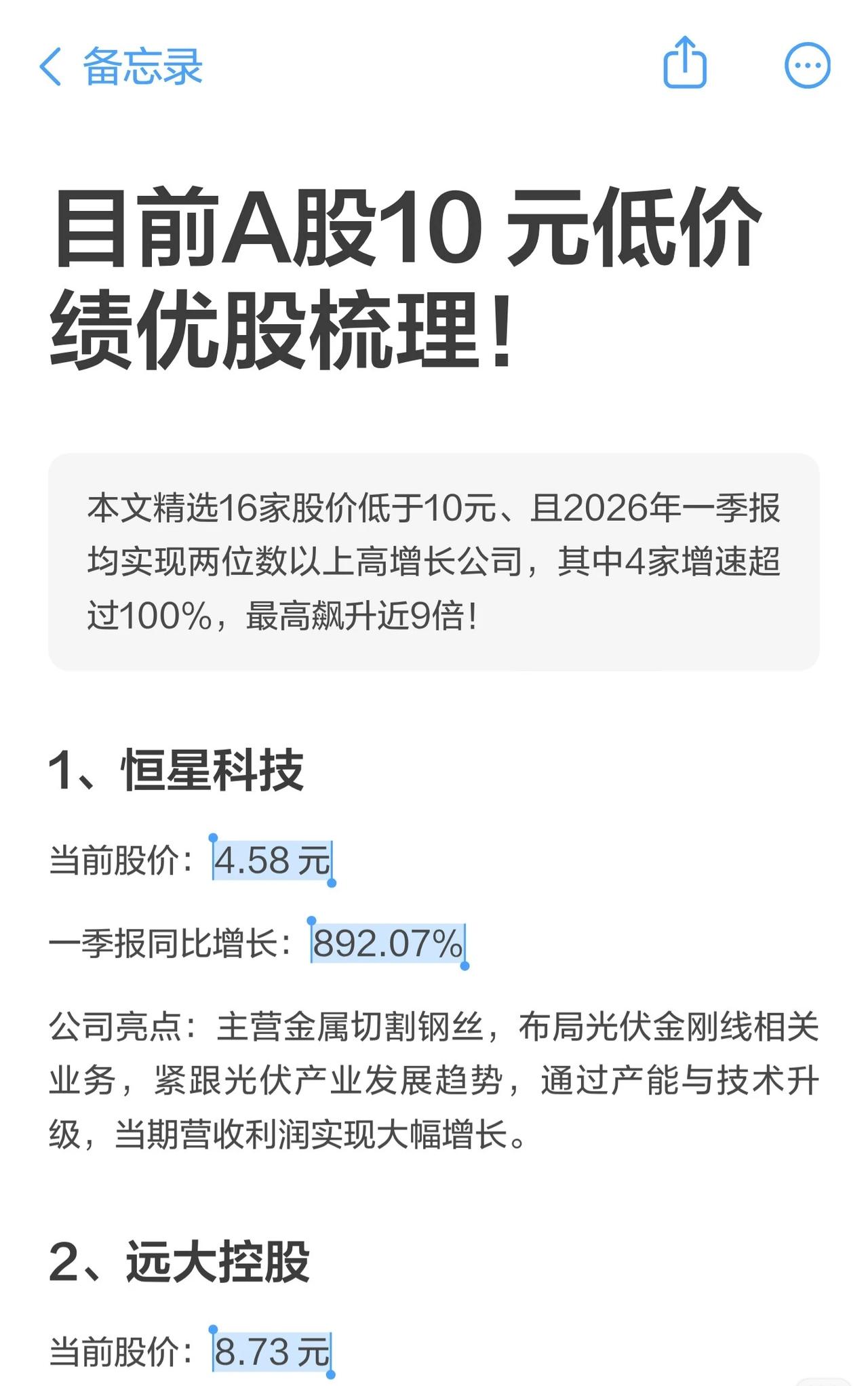 本文从A股市场精选出16家股价低于10元且业绩表现亮眼的公司,这些企业2026年一季报均实现两位数以上高增长,其中4家增速突破100%,更有企业业绩飙升至近9倍! 一、【爆发式增长梯队】业绩增速超100% 1. 恒星科技(002132) * 当前股价:4.58元 * 一季报同比增长:892.07% * 投资亮点:作为金属切割钢丝专业供应商,公司前瞻性布局光伏金刚线业务,深度契合新能源产业发展趋势。通过产能扩张与技术升级双轮驱动,当期营收与利润实现跨越式增长,成为本轮低估值高成长标的中的佼佼者。 2. 远大控股(000626) * 当前股价:8.73元 * 一季报同比增长:365.02% * 投资亮点:聚焦大宗农产品贸易领域,业务贯穿粮油、饲料等全产业链环节。凭借对大宗商品市场行情的敏锐把握与灵活操作,当期经营数据同比大幅改善,盈利能力显著提升。 3. 豫园股份(600655) * 当前股价:4.89元 * 一季报同比增长:208.72% * 投资亮点:多元化消费产业集团,业务版图涵盖黄金珠宝、商业零售、文旅地产等核心板块。随着线下消费场景持续恢复,公司整体盈利水平同比明显改善,消费复苏主线标的。 4. 宝胜股份(600973) * 当前股价:7.39元 * 一季报同比增长:142.85% * 投资亮点:国内电线电缆行业重要企业,产品广泛应用于新能源、高端装备制造等领域。受益于新能源项目建设需求的持续释放,当期业绩实现同比大幅上行。 5. 齐峰新材(002521) * 当前股价:8.59元 * 一季报同比增长:123.60% * 投资亮点:专注于装饰原纸研发与生产,下游紧密关联家居及建筑装饰行业。在原材料价格波动背景下,公司展现出优异的成本传导能力与盈利韧性,当期盈利实现同比显著增长。 6. 维尔利(300190) * 当前股价:4.00元 * 一季报同比增长:109.14% * 投资亮点:深耕环保综合治理与垃圾渗滤液处理领域,随着环保项目持续推进及验收集中确认,当期经营利润实现同比大幅回升,环保赛道基本面改善代表。 7. 越秀资本(000987) * 当前股价:9.01元 * 一季报同比增长:100.00% * 投资亮点:拥有地方国资背景的综合性金融平台,业务涵盖证券、基金、融资租赁等多元金融领域。结合资本市场环境变化,当期业绩实现翻倍增长,金融资产重估价值凸显。 二、【稳健高增梯队】业绩增速50%-100% 8. 穗恒运A(000531) * 当前股价:6.97元 * 一季报同比增长:94.96% * 投资亮点:区域性能源热电企业,依托电价政策调整红利与内部精细化成本管控,当期盈利同比实现明显增长,公用事业板块中难得的业绩弹性标的。 9. 鑫科材料(600255) * 当前股价:3.58元 * 一季报同比增长:84.73% * 投资亮点:主营铜带、铜箔等铜基新材料,产品广泛应用于电子及新能源相关领域。受益于下游行业需求回暖,当期经营业绩同比有所改善,新材料国产替代逻辑清晰。 10. 新北洋(002376) * 当前股价:7.21元 * 一季报同比增长:80.00% * 投资亮点:专注专用打印与智能识别设备研发制造,业务广泛覆盖物流、零售、金融等多类应用场景。当期营收及利润同比实现稳健增长,物联网终端需求持续向好。 11. 农产品(000061) * 当前股价:7.40元 * 一季报同比增长:74.16% * 投资亮点:国内农产品批发市场运营龙头,配套生鲜流通相关服务。随着线下消费场景逐步恢复,农产品流通效率提升,带动当期业绩同比上行。 12. 苏常柴A(000570) * 当前股价:6.66元 * 一季报同比增长:71.55% * 投资亮点:主营内燃机及相关配套产品,下游对接农机、工程机械领域。受国内外市场需求边际变化影响,当期业绩同比实现稳步提升。 三、【优质成长梯队】业绩增速50%以下但仍具亮点 13. 远东传动(002406) * 当前股价:8.35元 * 一季报同比增长:61.99% * 投资亮点:汽车传动轴零部件专业制造商,主要配套商用车领域,同时积极拓展新能源汽车配套业务。当期经营数据同比改善,新能源转型预期逐步兑现。 14. 孩子王(301078) * 当前股价:8.67元 * 一季报同比增长:60.00% * 投资亮点:母婴零售行业龙头,采用线上线下深度融合的新零售模式,依托会员深度运营与消费环境修复,当期整体业绩实现同比增长,大消费复苏受益标的。 15. 鲁北化工(600727) * 当前股价:7.98元 * 一季报同比增长:57.29%