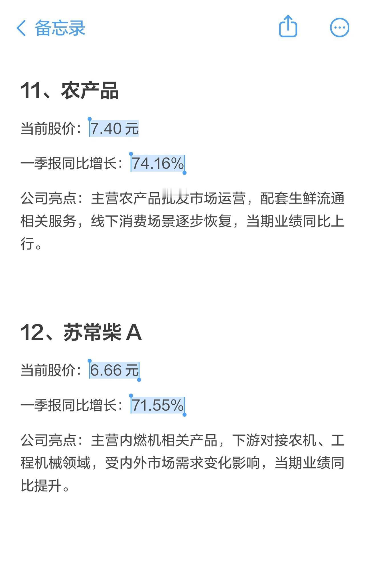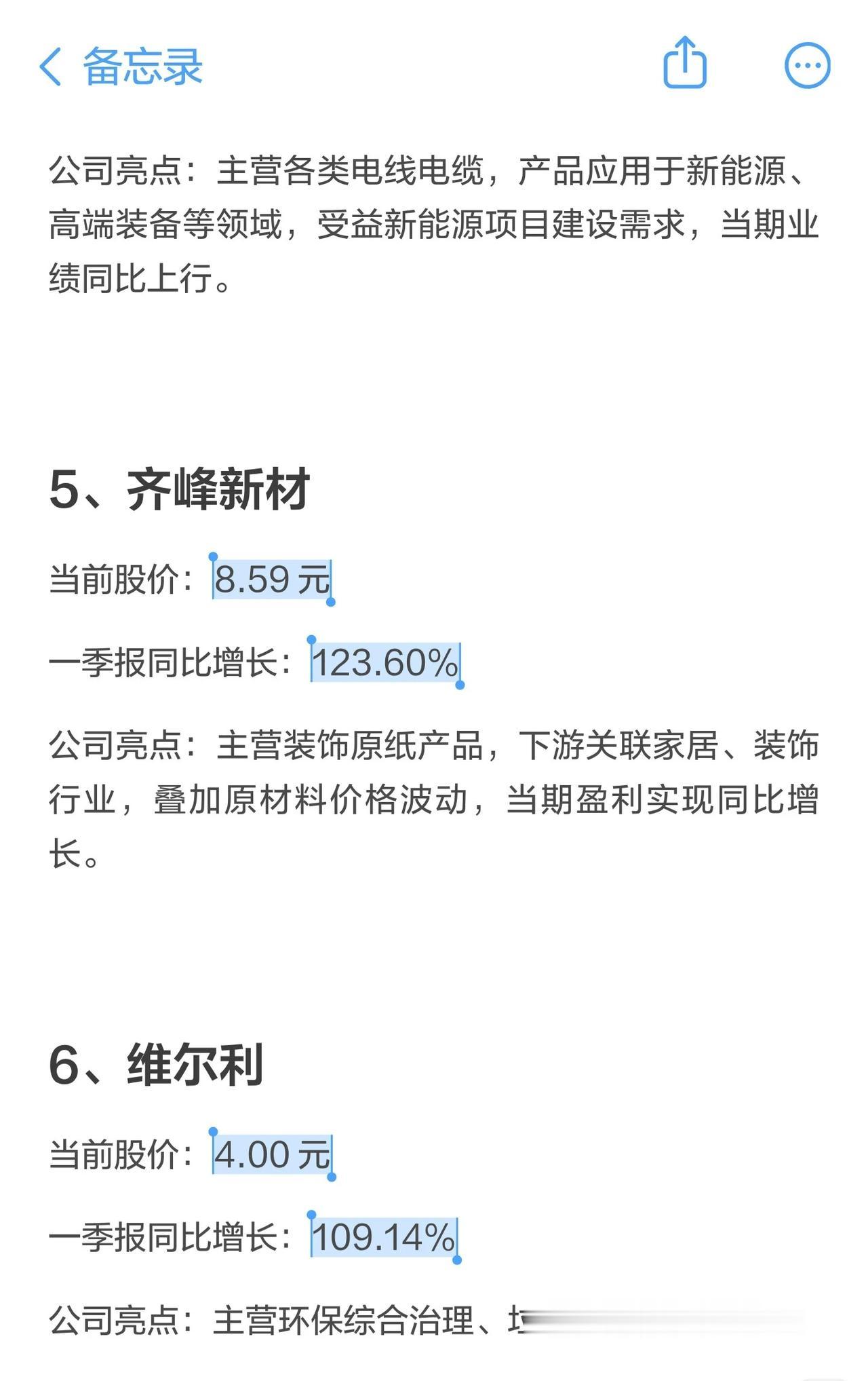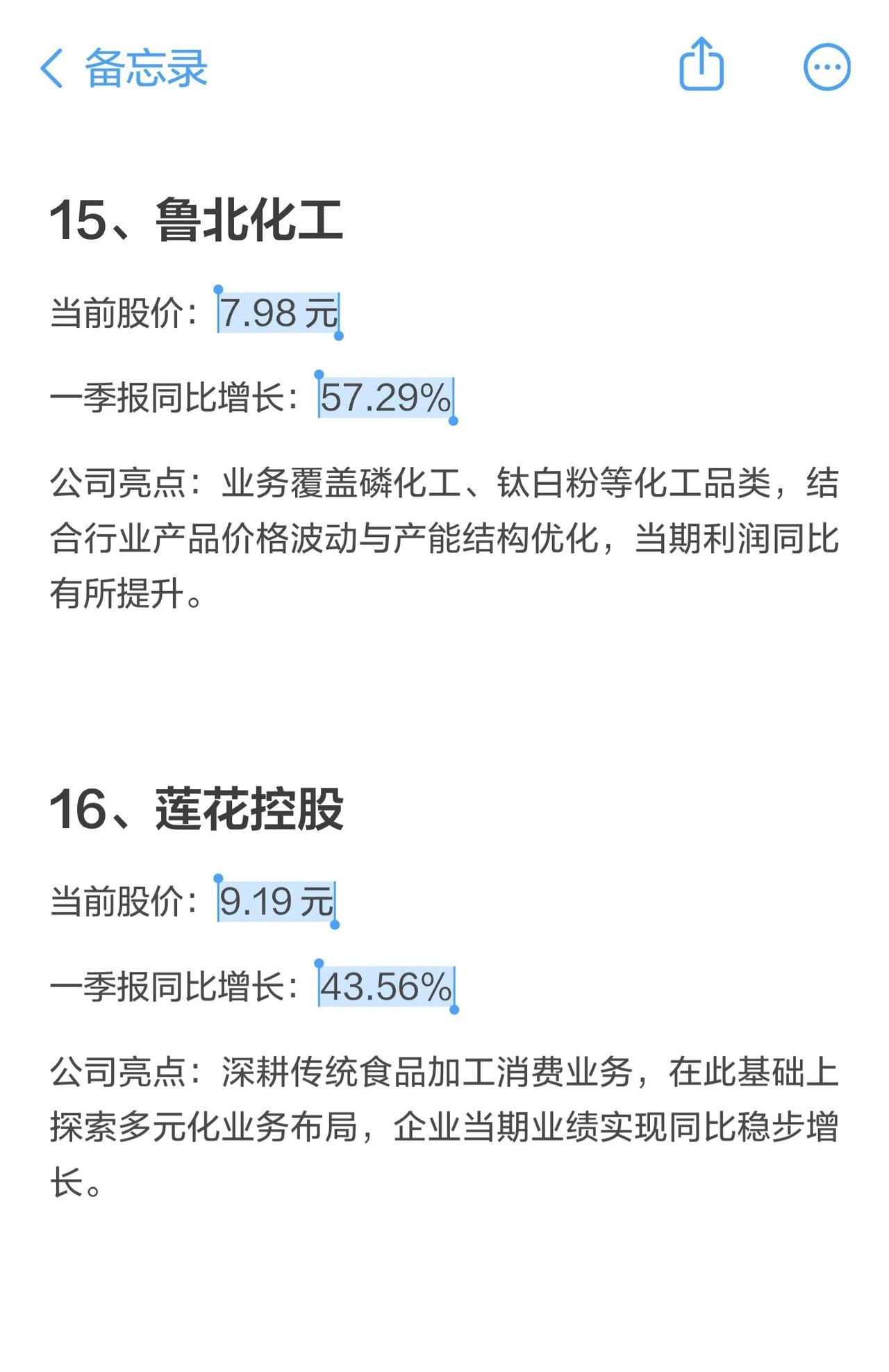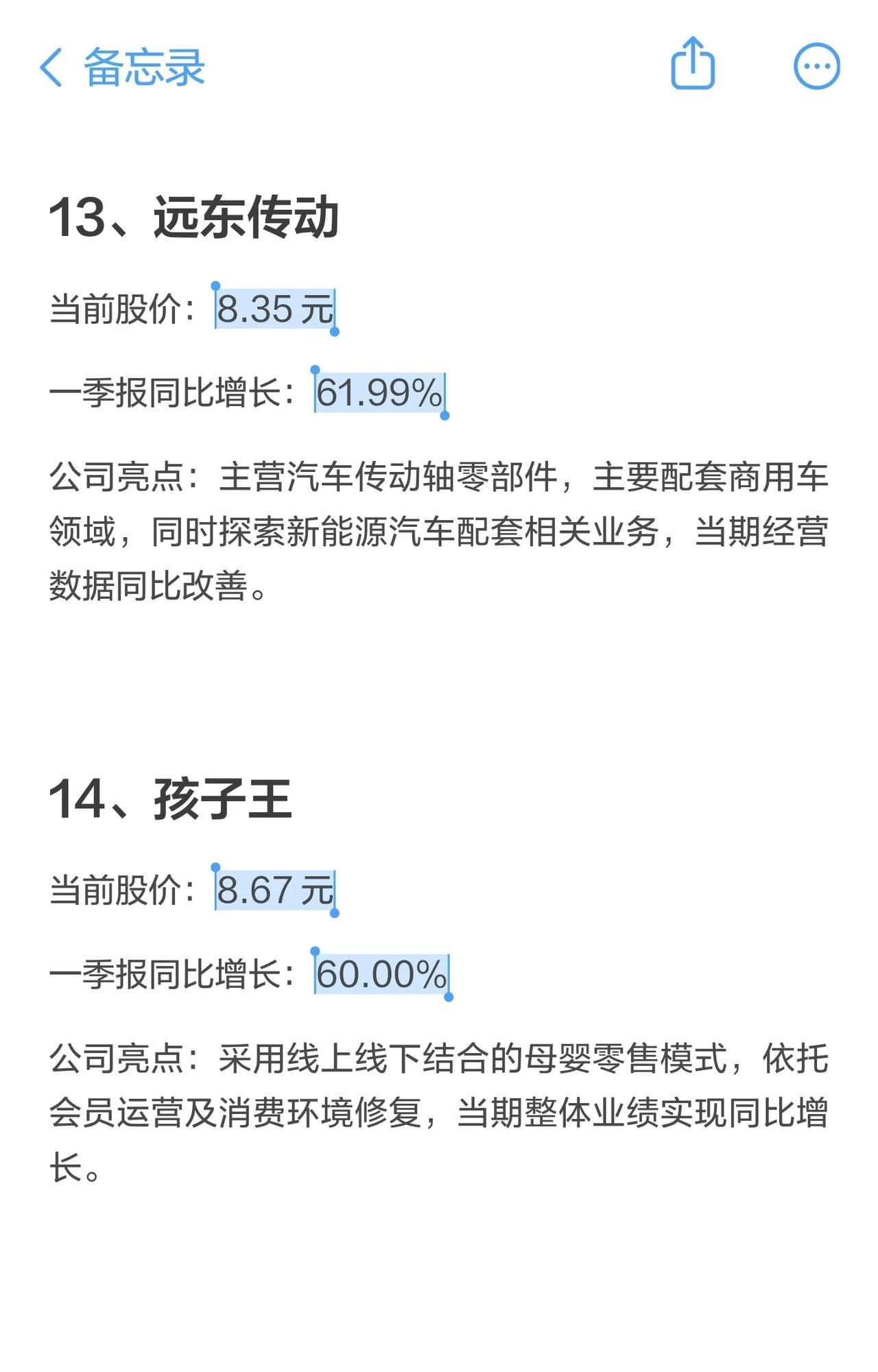 本文从A股市场精选出16家股价低于10元且业绩表现亮眼的公司,这些企业2026年一季报均实现两位数以上高增长,其中4家增速突破100%,更有企业业绩飙升至近9倍! 一、【爆发式增长梯队】业绩增速超100% 1. 恒星科技(002132) * 当前股价:4.58元 * 一季报同比增长:892.07% * 投资亮点:作为金属切割钢丝专业供应商,公司前瞻性布局光伏金刚线业务,深度契合新能源产业发展趋势。通过产能扩张与技术升级双轮驱动,当期营收与利润实现跨越式增长,成为本轮低估值高成长标的中的佼佼者。 2. 远大控股(000626) * 当前股价:8.73元 * 一季报同比增长:365.02% * 投资亮点:聚焦大宗农产品贸易领域,业务贯穿粮油、饲料等全产业链环节。凭借对大宗商品市场行情的敏锐把握与灵活操作,当期经营数据同比大幅改善,盈利能力显著提升。 3. 豫园股份(600655) * 当前股价:4.89元 * 一季报同比增长:208.72% * 投资亮点:多元化消费产业集团,业务版图涵盖黄金珠宝、商业零售、文旅地产等核心板块。随着线下消费场景持续恢复,公司整体盈利水平同比明显改善,消费复苏主线标的。 4. 宝胜股份(600973) * 当前股价:7.39元 * 一季报同比增长:142.85% * 投资亮点:国内电线电缆行业重要企业,产品广泛应用于新能源、高端装备制造等领域。受益于新能源项目建设需求的持续释放,当期业绩实现同比大幅上行。 5. 齐峰新材(002521) * 当前股价:8.59元 * 一季报同比增长:123.60% * 投资亮点:专注于装饰原纸研发与生产,下游紧密关联家居及建筑装饰行业。在原材料价格波动背景下,公司展现出优异的成本传导能力与盈利韧性,当期盈利实现同比显著增长。 6. 维尔利(300190) * 当前股价:4.00元 * 一季报同比增长:109.14% * 投资亮点:深耕环保综合治理与垃圾渗滤液处理领域,随着环保项目持续推进及验收集中确认,当期经营利润实现同比大幅回升,环保赛道基本面改善代表。 7. 越秀资本(000987) * 当前股价:9.01元 * 一季报同比增长:100.00% * 投资亮点:拥有地方国资背景的综合性金融平台,业务涵盖证券、基金、融资租赁等多元金融领域。结合资本市场环境变化,当期业绩实现翻倍增长,金融资产重估价值凸显。 二、【稳健高增梯队】业绩增速50%-100% 8. 穗恒运A(000531) * 当前股价:6.97元 * 一季报同比增长:94.96% * 投资亮点:区域性能源热电企业,依托电价政策调整红利与内部精细化成本管控,当期盈利同比实现明显增长,公用事业板块中难得的业绩弹性标的。 9. 鑫科材料(600255) * 当前股价:3.58元 * 一季报同比增长:84.73% * 投资亮点:主营铜带、铜箔等铜基新材料,产品广泛应用于电子及新能源相关领域。受益于下游行业需求回暖,当期经营业绩同比有所改善,新材料国产替代逻辑清晰。 10. 新北洋(002376) * 当前股价:7.21元 * 一季报同比增长:80.00% * 投资亮点:专注专用打印与智能识别设备研发制造,业务广泛覆盖物流、零售、金融等多类应用场景。当期营收及利润同比实现稳健增长,物联网终端需求持续向好。 11. 农产品(000061) * 当前股价:7.40元 * 一季报同比增长:74.16% * 投资亮点:国内农产品批发市场运营龙头,配套生鲜流通相关服务。随着线下消费场景逐步恢复,农产品流通效率提升,带动当期业绩同比上行。 12. 苏常柴A(000570) * 当前股价:6.66元 * 一季报同比增长:71.55% * 投资亮点:主营内燃机及相关配套产品,下游对接农机、工程机械领域。受国内外市场需求边际变化影响,当期业绩同比实现稳步提升。 三、【优质成长梯队】业绩增速50%以下但仍具亮点 13. 远东传动(002406) * 当前股价:8.35元 * 一季报同比增长:61.99% * 投资亮点:汽车传动轴零部件专业制造商,主要配套商用车领域,同时积极拓展新能源汽车配套业务。当期经营数据同比改善,新能源转型预期逐步兑现。 14. 孩子王(301078) * 当前股价:8.67元 * 一季报同比增长:60.00% * 投资亮点:母婴零售行业龙头,采用线上线下深度融合的新零售模式,依托会员深度运营与消费环境修复,当期整体业绩实现同比增长,大消费复苏受益标的。 15. 鲁北化工(600727) * 当前股价:7.98元 * 一季报同比增长:57.29%