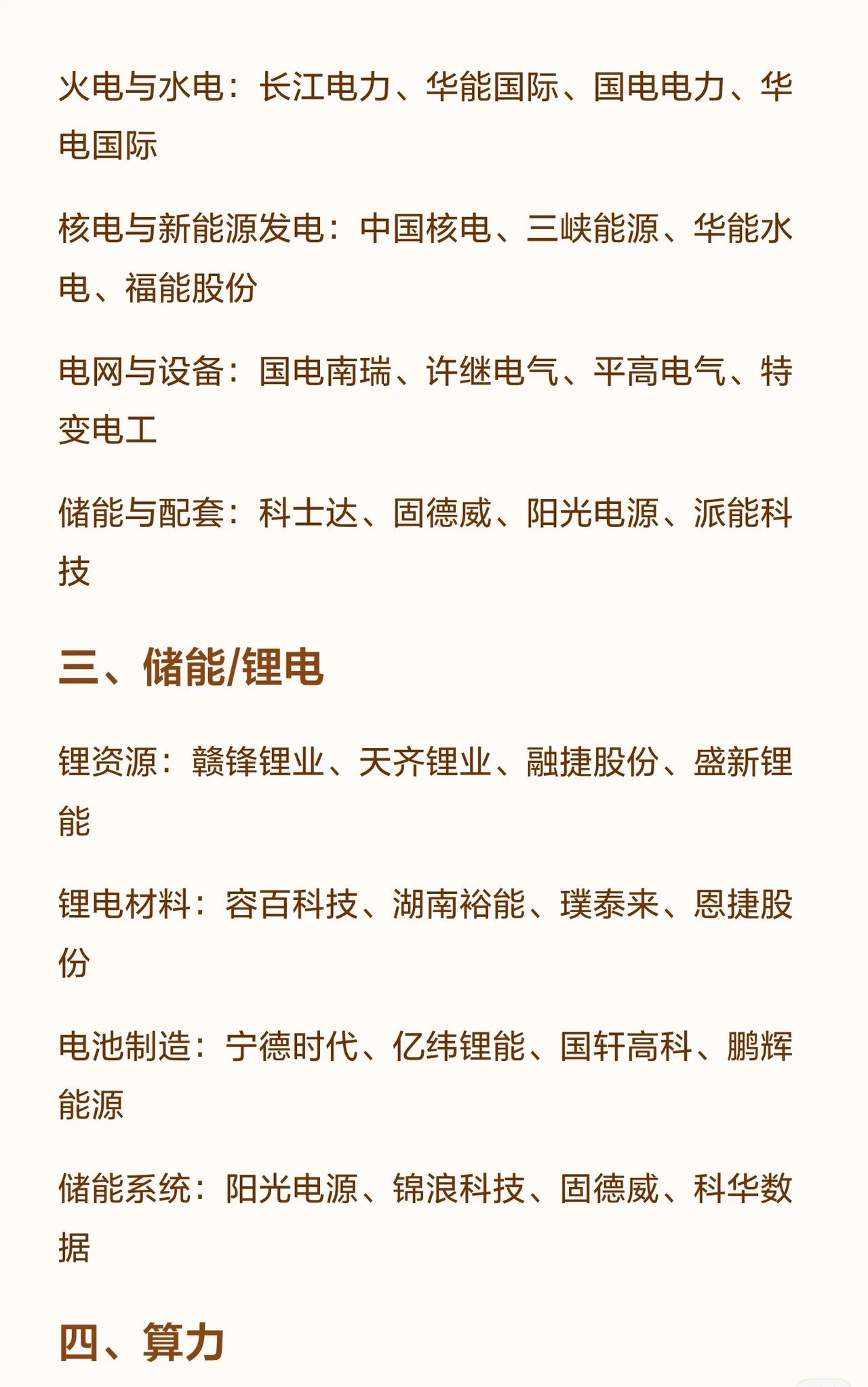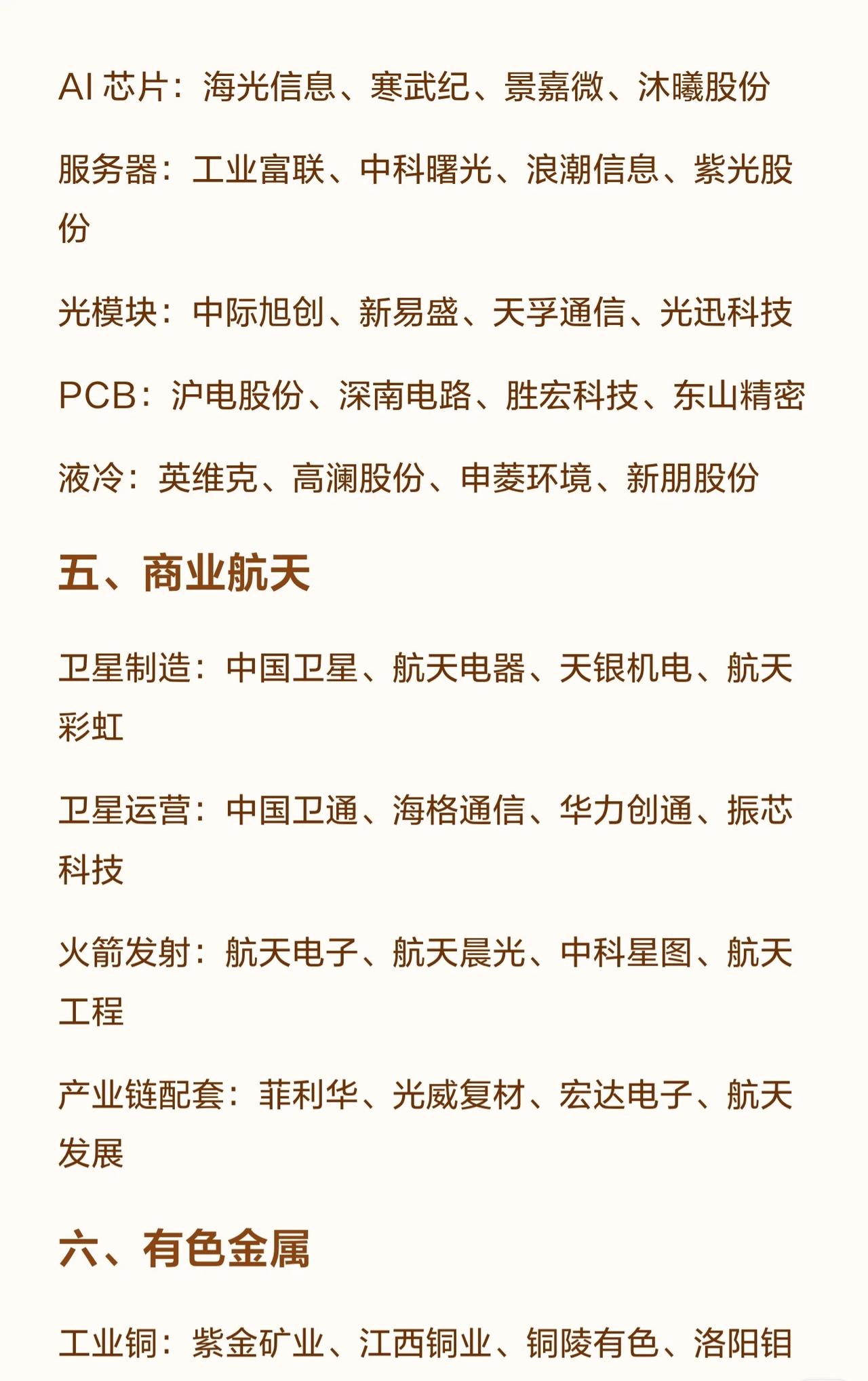 五一假期临近,以下六大投资方向值得投资者重点关注与布局: 一、半导体产业链 半导体作为科技产业的基石,涵盖多个细分领域。在芯片设计环节,可关注海光信息、寒武纪、景嘉微、兆易创新等龙头企业;芯片制造方面,中芯国际、华虹半导体、芯联集成、长电科技构成核心阵营;设备材料领域,北方华创、中微公司、沪硅产业、安集科技掌握关键技术;存储芯片板块则包括长江存储、长鑫存储、江波龙、澜起科技等核心标的。 二、电力板块 电力行业呈现多元化发展趋势。火电与水电源头企业包括长江电力、华能国际、国电电力、华电国际;核电与新能源发电领域,中国核电、三峡能源、华能水电、福能股份占据重要地位;电网与设备方面,国电南瑞、许继电气、平高电气、特变电工提供关键基础设施;储能与配套环节,科士达、固德威、阳光电源、派能科技形成完整解决方案。 三、储能与锂电产业 新能源产业链的核心环节。锂资源领域,赣锋锂业、天齐锂业、融捷股份、盛新锂业拥有优质矿产资源;锂电材料方面,容百科技、湖南裕能、璞泰来、恩捷股份提供正极、负极及隔膜等关键材料;电池制造环节,宁德时代、亿纬锂能、国轩高科、鹏辉能源是行业领军者;储能系统集成领域,阳光电源、锦浪科技、固德威、科华数据具备领先优势。 四、算力基础设施 数字经济时代的核心底座。AI芯片领域,海光信息、寒武纪、景嘉微、沐曦股份专注人工智能处理器研发;服务器方面,工业富联、中科曙光、浪潮信息、紫光股份提供算力支撑;PCB印制电路板环节,沪电股份、深南电路、胜宏科技、东山精密保障高速信号传输;液冷散热技术方面,英维克、高澜股份、申菱环境、新朋股份解决高功耗散热难题。 五、商业航天产业 战略性新兴产业的重要组成。卫星制造领域,中国卫星、航天电器、天银机电、航天彩虹承担航天器研制任务;卫星运营服务由中囯卫通、海格通信、华力创通、振芯科技主导;火箭发射环节,航天电子、航天晨光、中科星图、航天工程实现运载能力突破;产业链配套方面,菲利华、光威复材、宏达电子、航天发展提供关键元器件与材料支持。 六、有色金属板块 基础原材料与新能源金属并重。工业铜领域,紫金矿业、江西铜业、铜陵有色、洛阳钼业掌控优质铜矿资源;轻量铝方面,中国铝业、云铝股份、神火股份、天山铝业专注电解铝生产;贵金属板块包括山东黄金、中金黄金、赤峰黄金、银泰黄金;小金属领域,北方稀土、厦门钨业、金钼股份、安泰科技供应战略稀有金属;新能源金属方面,华友钴业、盛屯矿业、格林美、青岛中程聚焦钴、镍、锂等电池金属材料。