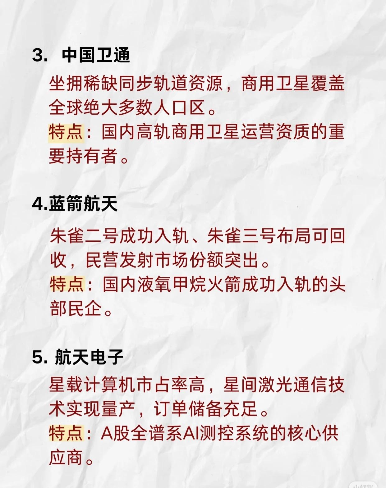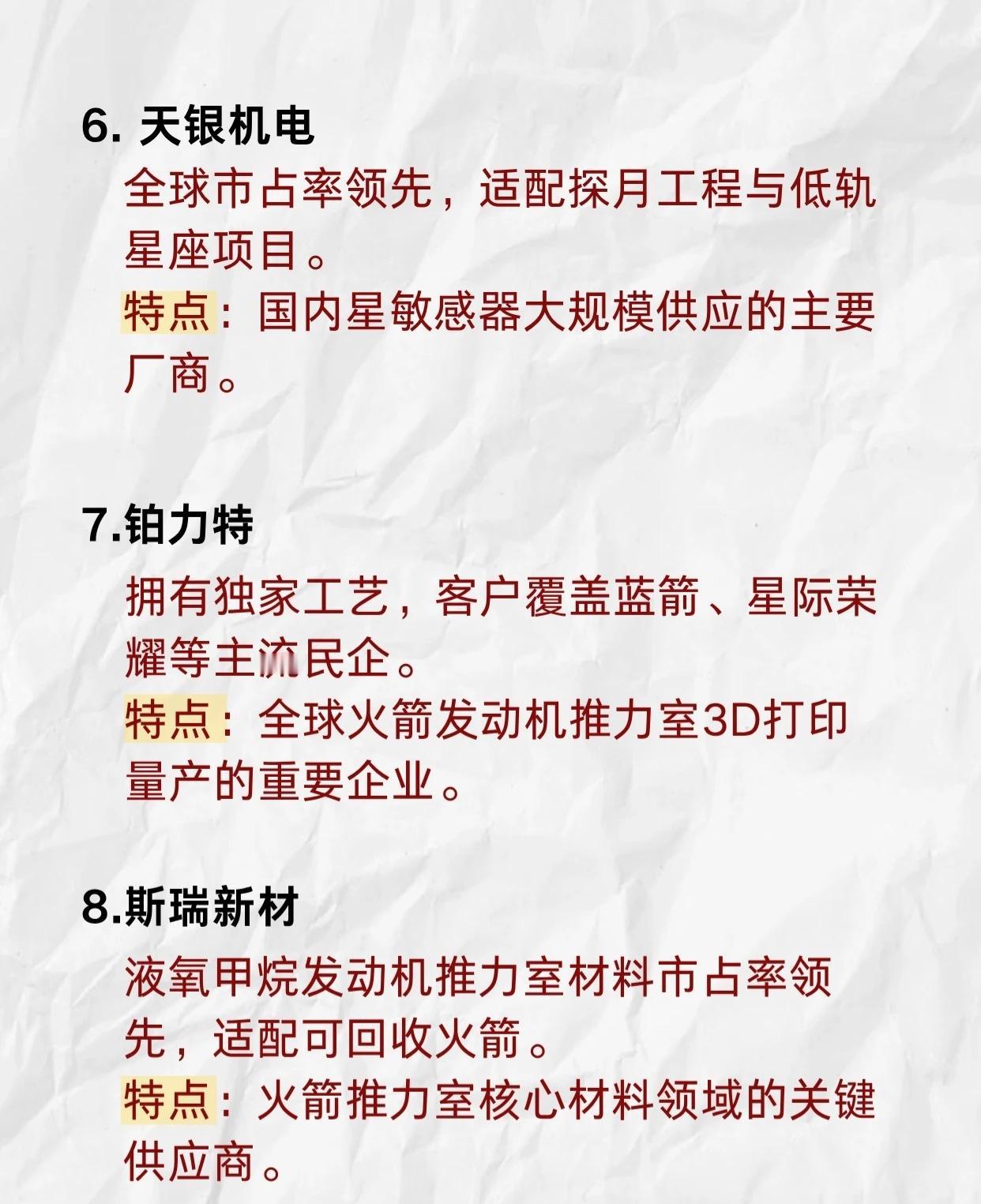 在商业航天蓬勃发展的浪潮中,以下十家企业在各自细分赛道展现出独特的战略价值与不可替代的竞争优势: 中国卫星作为A股整星总体制造领域的龙头企业,在国内民用卫星制造领域占据领先的市场份额。公司深度承接星网及G60千帆星座的订单,海南基地的规模化产能建设为其在卫星批量化生产方面提供了坚实保障。 铖昌科技是国内实现星载相控阵T/R芯片量产的核心厂商,在低轨卫星芯片领域市占率领先。其凭借稳定的产能规模,成为星网项目的重要配套供应商,在卫星通信射频前端领域构筑了深厚的技术壁垒。 中国卫通坐拥稀缺的同步轨道资源,是全球商用卫星覆盖人口最广的运营商之一,也是国内高轨商用卫星运营资质的重要持有者,在卫星通信运营领域具有独特的战略地位。 蓝箭航天作为国内液氧甲烷火箭成功入轨的头部民营企业,不仅实现了朱雀二号的成功入轨,更在前沿的可回收技术方面积极布局朱雀三号,在民营发射市场占据突出份额。 航天电子是A股全谱系AI测控系统的核心供应商,星载计算机市场占有率位居前列。公司率先实现星间激光通信技术量产,并拥有充足的订单储备,在卫星智能化与深空测控领域优势明显。 天银机电在全球星敏感器市场占据领先地位,是适配探月工程与低轨星座项目的核心供应商,也是国内星敏感器大规模供应的主要厂商,为航天器姿态控制提供关键部件。 铂力特作为全球火箭发动机推力室3D打印量产的重要企业,拥有独家工艺技术,客户覆盖蓝箭航天、星际荣耀等主流民营航天企业,在火箭制造领域推动了增材制造的产业化应用。 斯瑞新材是火箭推力室核心材料领域的关键供应商,在液氧甲烷发动机推力室材料领域市占率领先,其高性能材料完美适配当前备受关注的可回收火箭技术需求。 上海瀚讯掌握100Gbps星间激光通信技术,并积极参与国际6G标准制定,是G60千帆星座通信载荷的主要供应商,在卫星通信载荷与下一代通信技术融合方面走在行业前列。 航宇微是A股打通卫星运营与太空算力全产业链的标杆企业,不仅运营着“珠海一号”高光谱星座,还自主研发了玉龙宇航级星上AI芯片,实现了从空间基础设施运营到在轨智能计算的完整产业闭环。 这十家企业分别从整星制造、核心芯片、轨道资源、火箭发射、卫星运营、关键材料及太空算力等维度,构建了中国商业航天产业的核心竞争力,在各自领域展现出显著的唯一性与不可替代性。