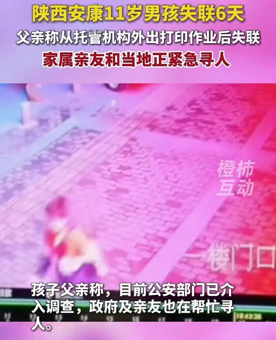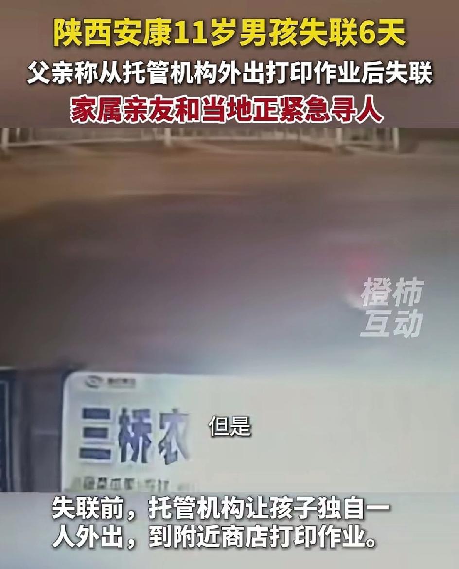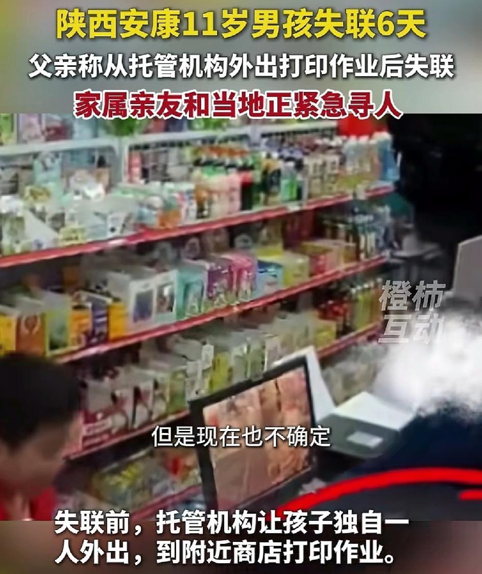 陕西安康11岁男孩失联六。他的父亲说孩子晚上在托管机构托管的时候外出打印作业后失联。家属亲友紧急寻人,从监控里看,4月20日晚上,他一个人在托管机构附近的商店里打印作业。最后的监控显示男孩在三桥附近,后来就不知所踪。