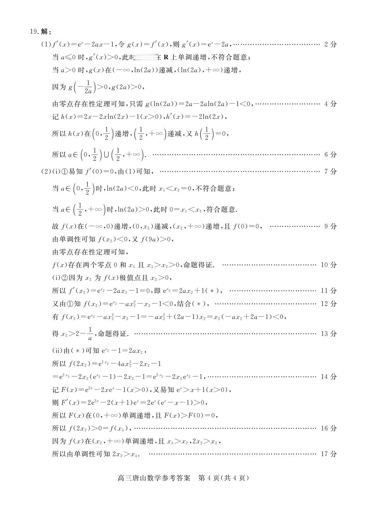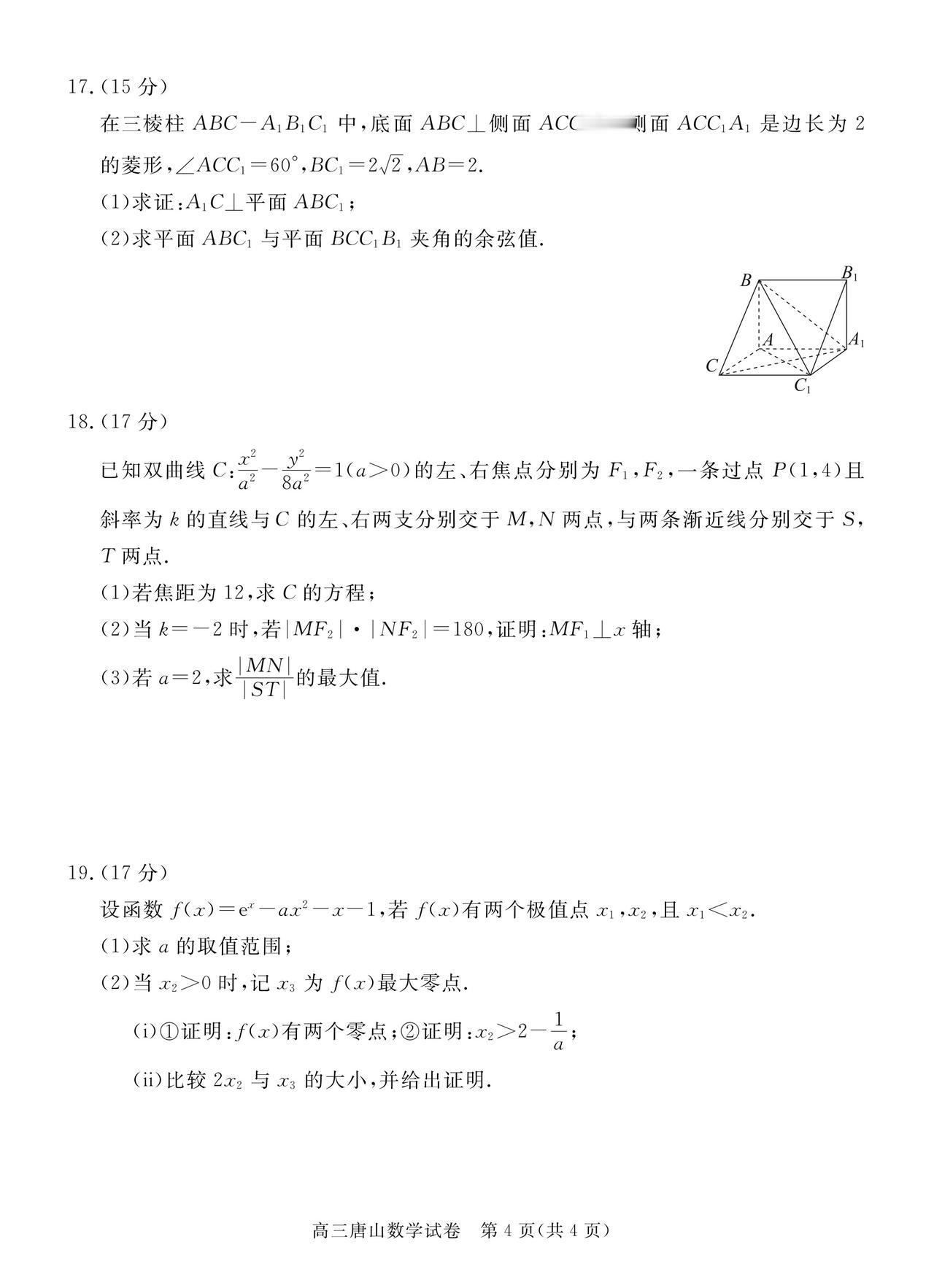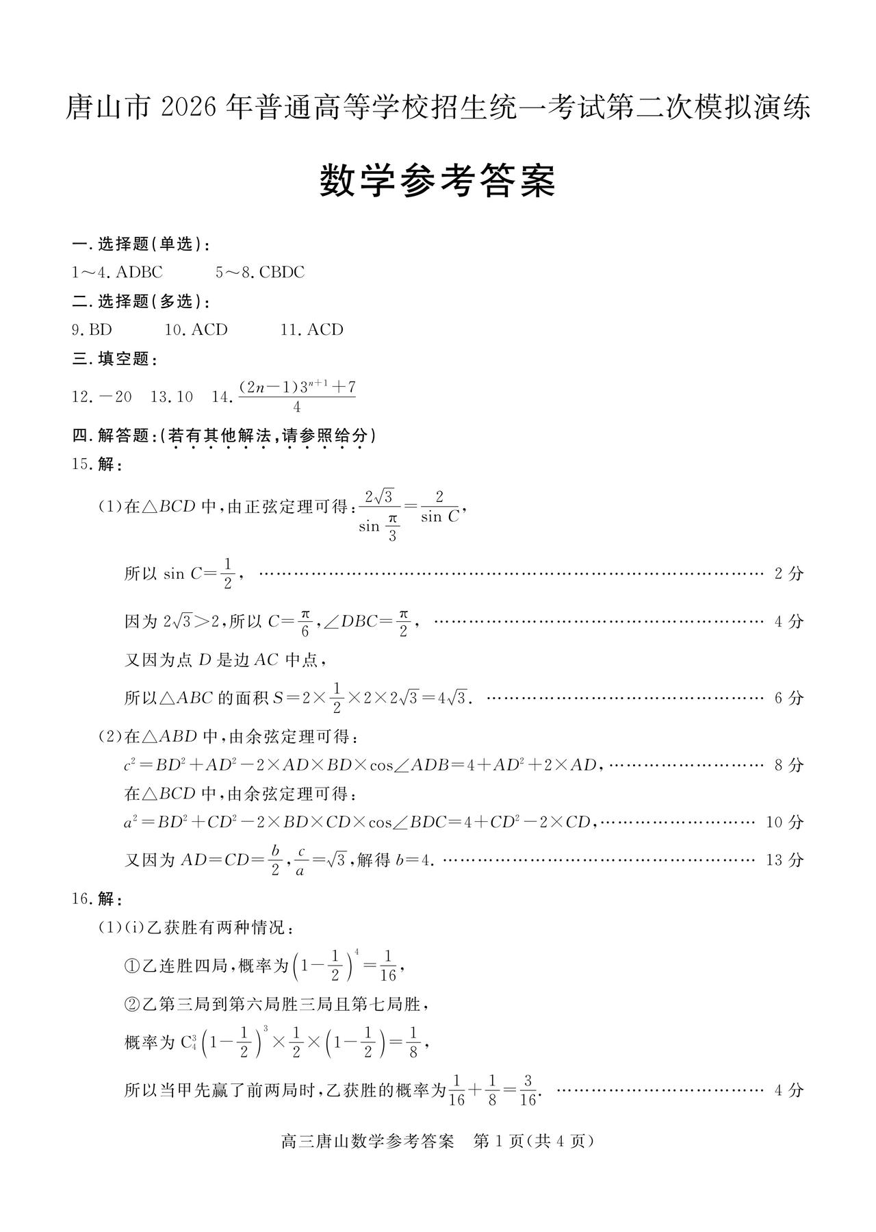 河北省唐山市2026届高三4月二模考试数学试题及答案