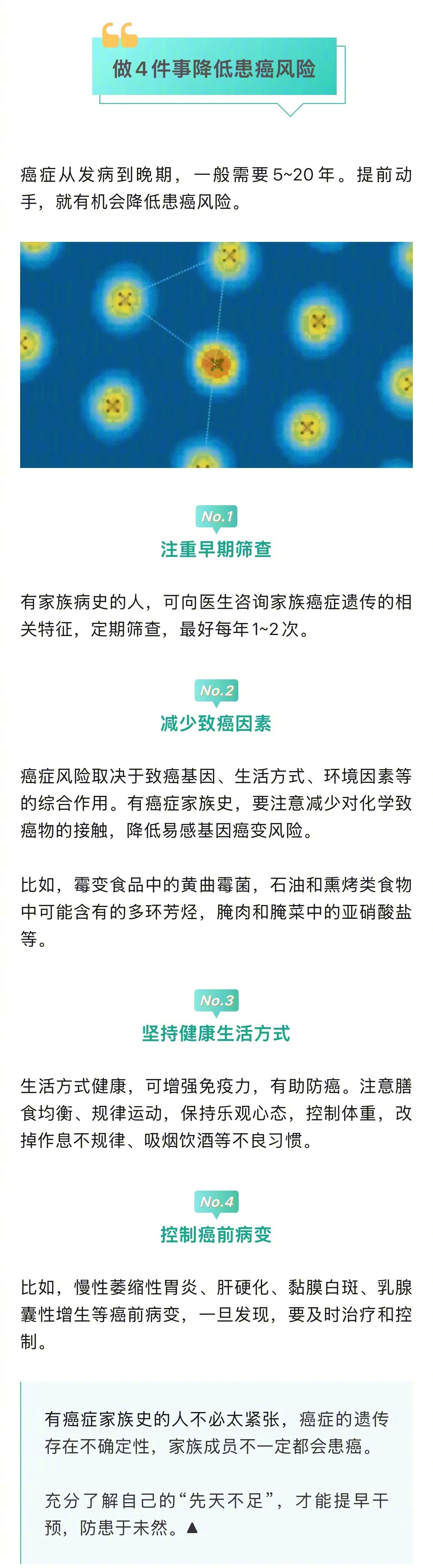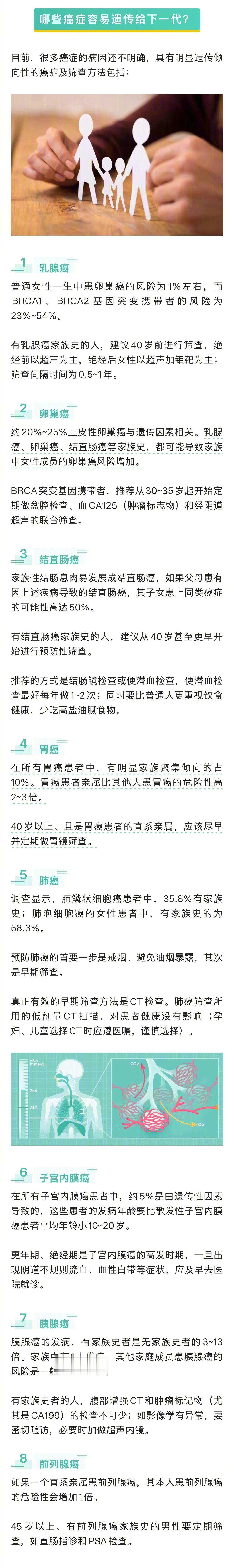【癌症会遗传给后代吗】癌症有一定的遗传倾向,但遗传的不是肿瘤本身,而是让细胞更容易癌变的“基因缺陷”。当家族亲属中出现以下情况,需警惕遗传性肿瘤↓↓
