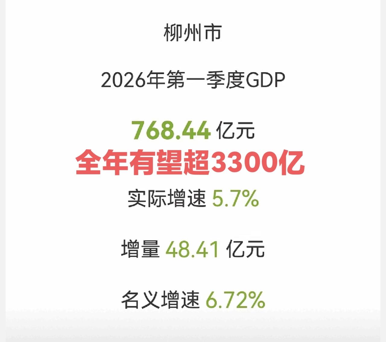 恭喜柳州进入经济高速增长快车道。大家都知道柳州很多年GDP一直在3000亿徘徊,去年开始终于发力了。 按照一季度GDP增长情况,柳州全年突破3300亿应该问题不大,然后后年破3500亿,2029年破4000亿。