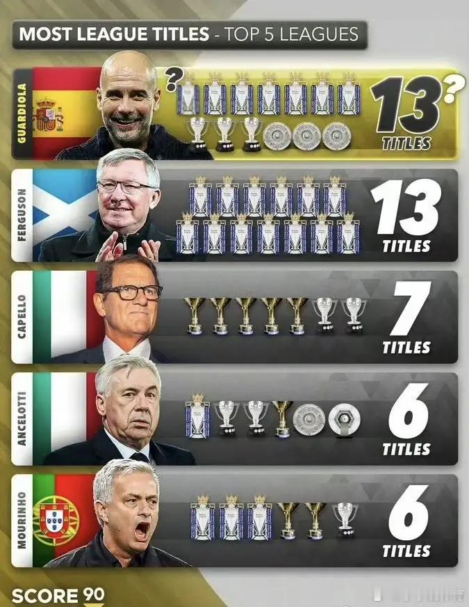 因为弗格森13个英超冠军,瓜迪奥拉加起来也会是13个,加上其他联赛荣誉,瓜帅历史地位很牛逼。