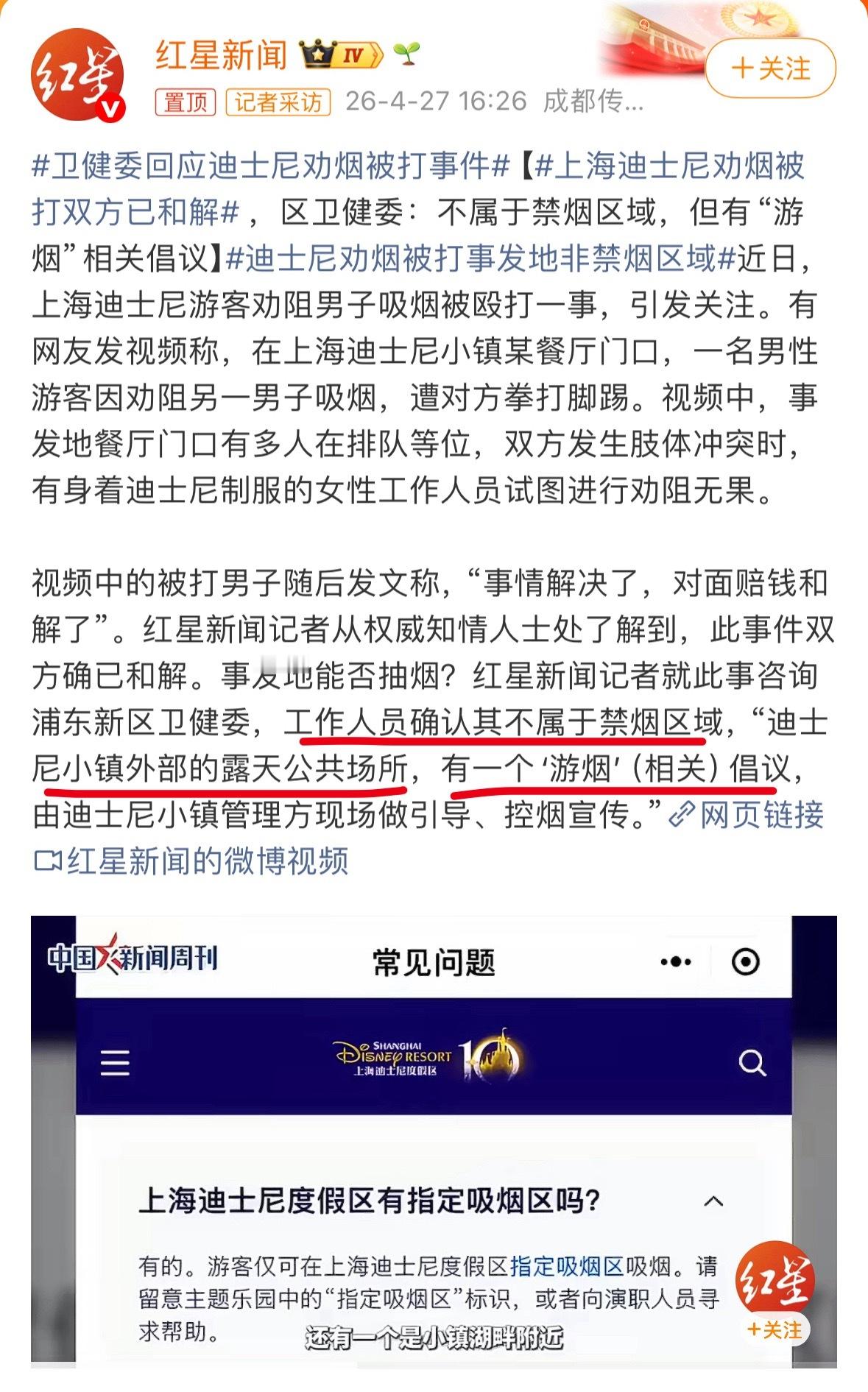 卫健委回应迪士尼劝烟被打事件搞了半天,是非禁烟区域,迪士尼小镇外部露天场所。。。