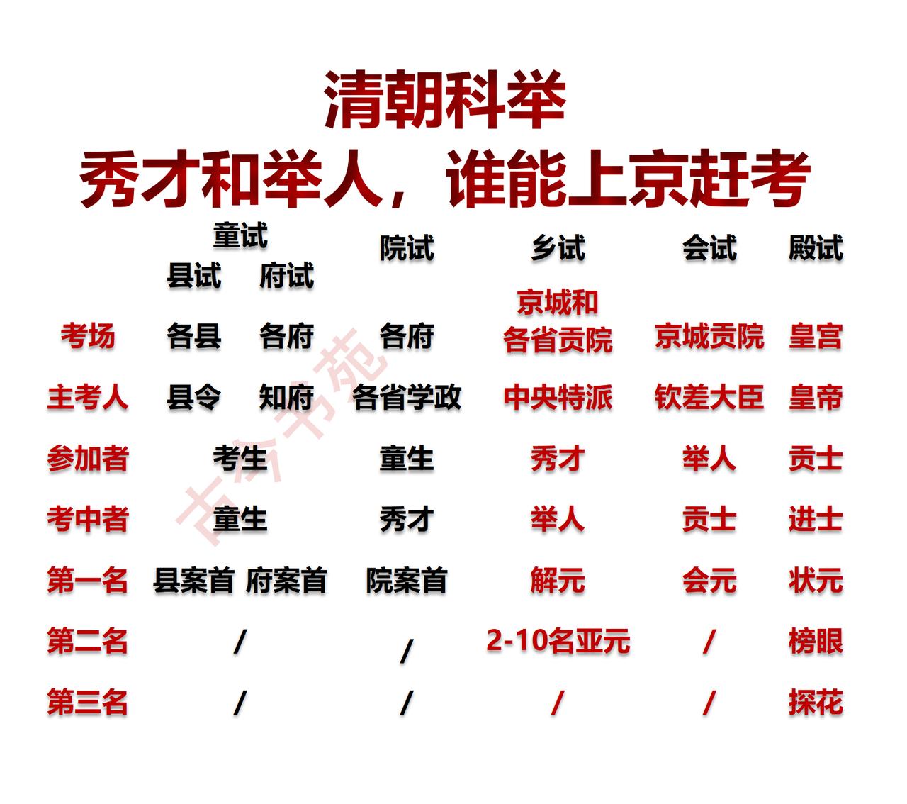 粉丝提问:秀才考举人,是在京城还是省城? 答案:既不是单一的京城,也不是单一的省城,而是两者都有。 先思考一个问题,京城和省城有什么区别? 想不懂,看现代的北京和石家庄就知道了。 北京是省级行政区,石家庄是河北省的省会。 接下来,以清朝为例,理顺科举制度,在此之前,还要了解清朝的行政区级别。 清朝的行政区级别分为三级:省——府——县。 参考清朝科举制度,没有功名者,我称之为考生,通过童试(县试和府试两场),成为童生。 何为县试? 考点在各县的县衙(或临时指定点),由知县主持。 何为府试? 考点在各府的府衙,由知府主持。 童生通往秀才的考试,叫院试。也是在各府举行,有专门的考棚,由各省的学政主持。 秀才考举人的考试叫乡试。考点设立在京城和各自的省城,考点不止一个,换句话说,还没到上京赶考的时候。主考由京城派人。 举人再参加考试,才是上京赶考,因为这场考试的考点设立在京城贡院,由皇帝指定的钦差大臣负责主考,通过者称号为“贡士”,每次考试大概录取300名左右。 成为贡士,一个月以后,参加由皇帝亲自主持的殿试,这场考试一般不会出现落榜情况,而是对300名贡士排次。 殿试前三名,为一甲。 一甲第一名:状元 一甲第二名:榜眼 一甲第三名:探花 二甲若干人,三甲若干人。 一般一甲被称为进士及第,二甲被称为进士出身,三甲被称为同进士出身。 这就是清朝的科举之举,秀才没有上京赶考的资格,举人才会上京赶考,你学到了吗?