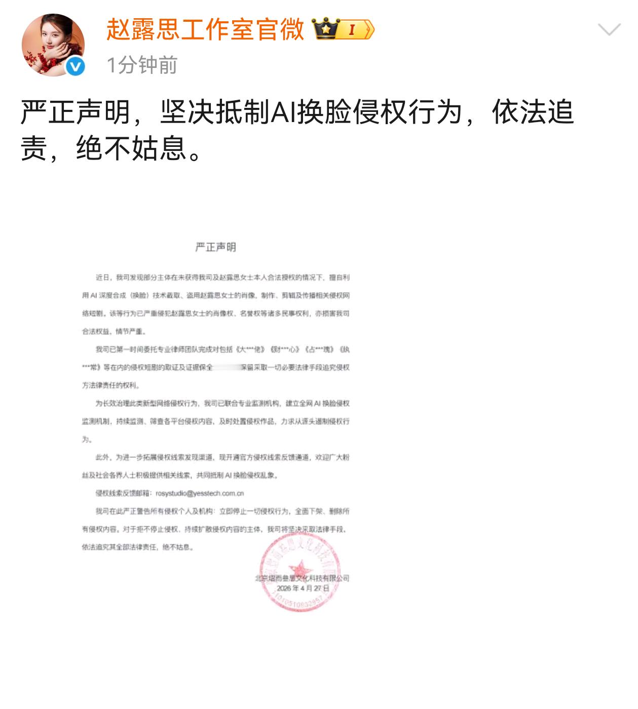 赵露思工作室发布严正声明坚决抵制AI换脸侵权行为,依法追责,绝不姑息。
