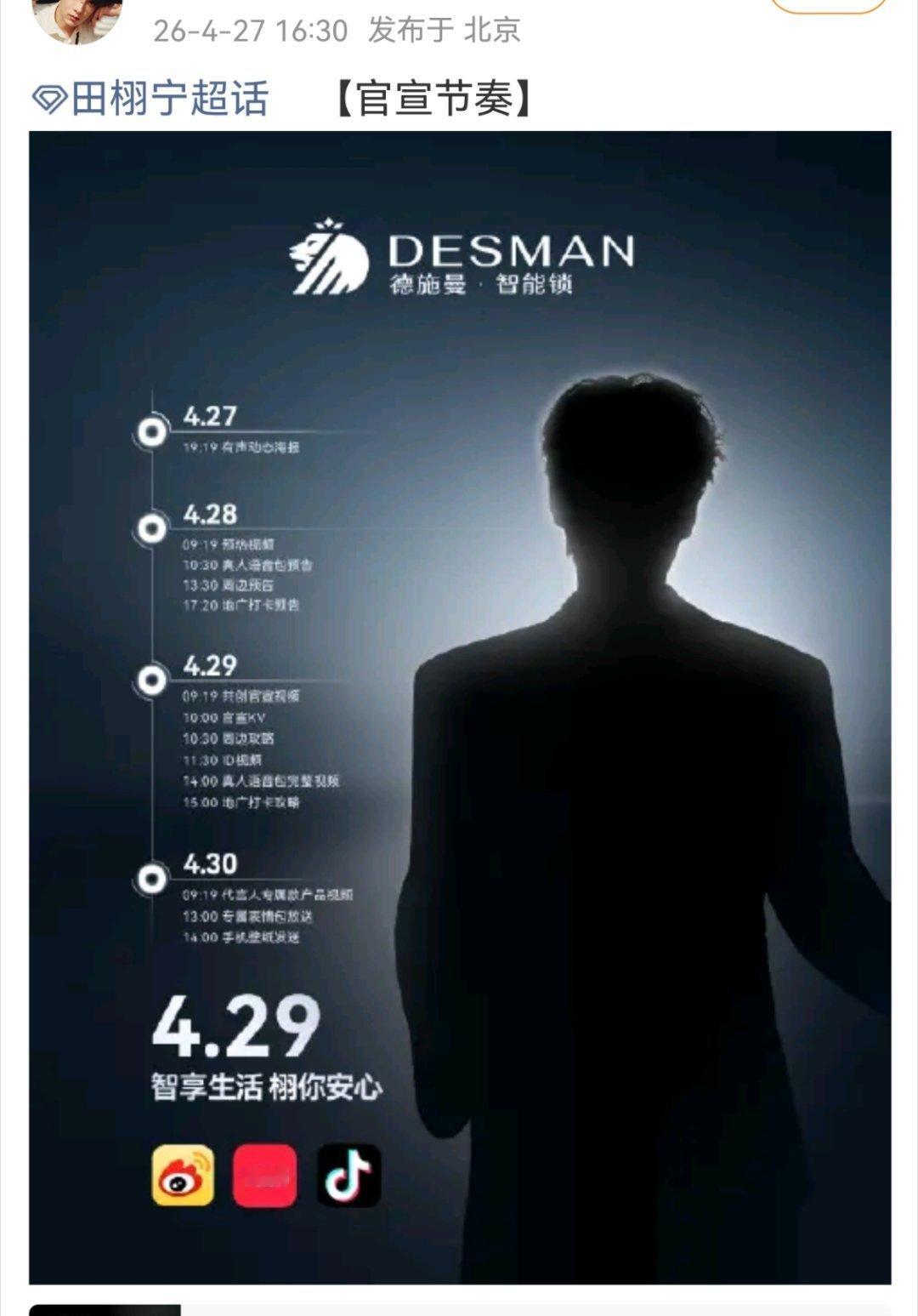 田栩宁新商务德施曼智能锁官宣节奏🈶