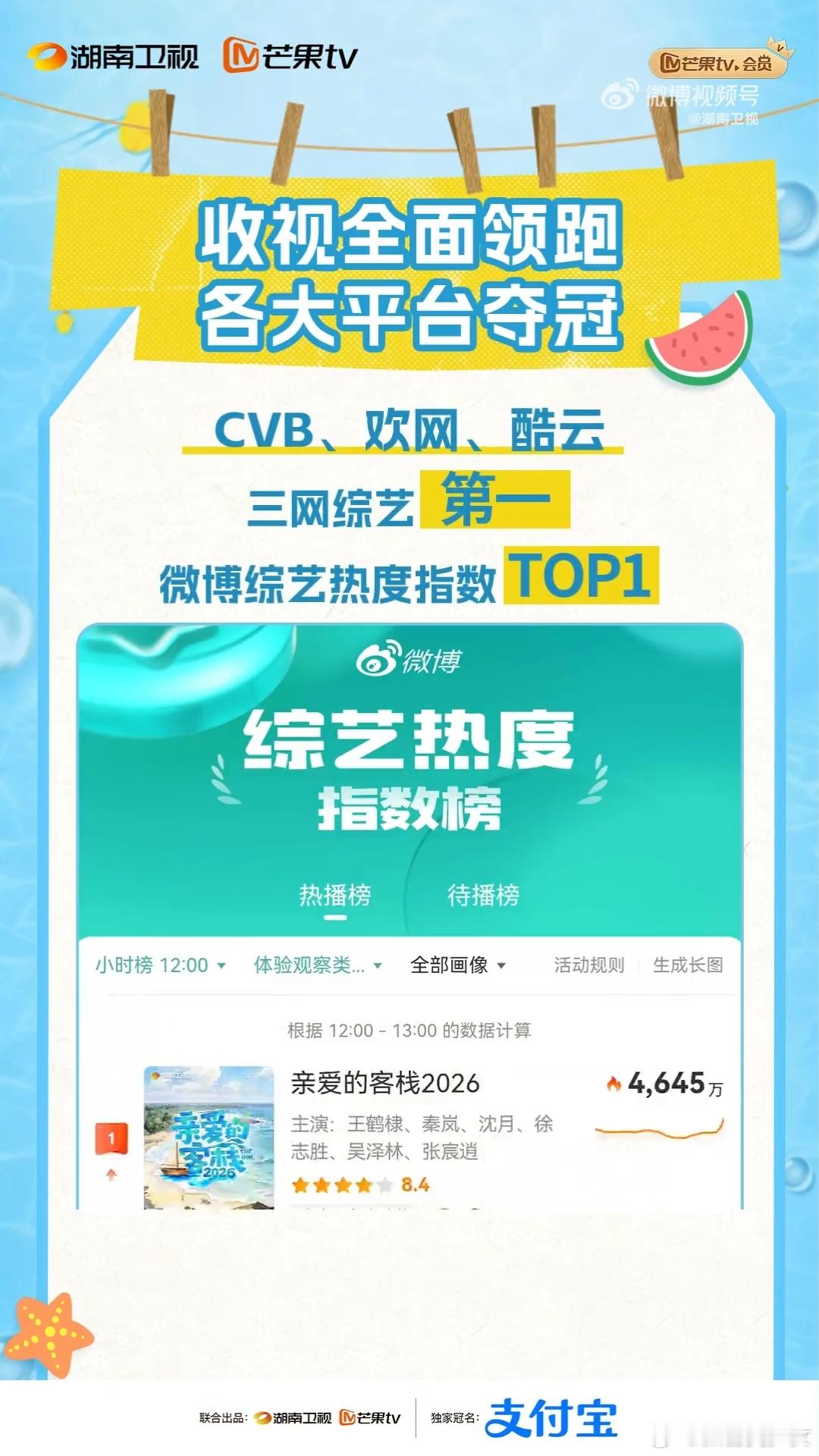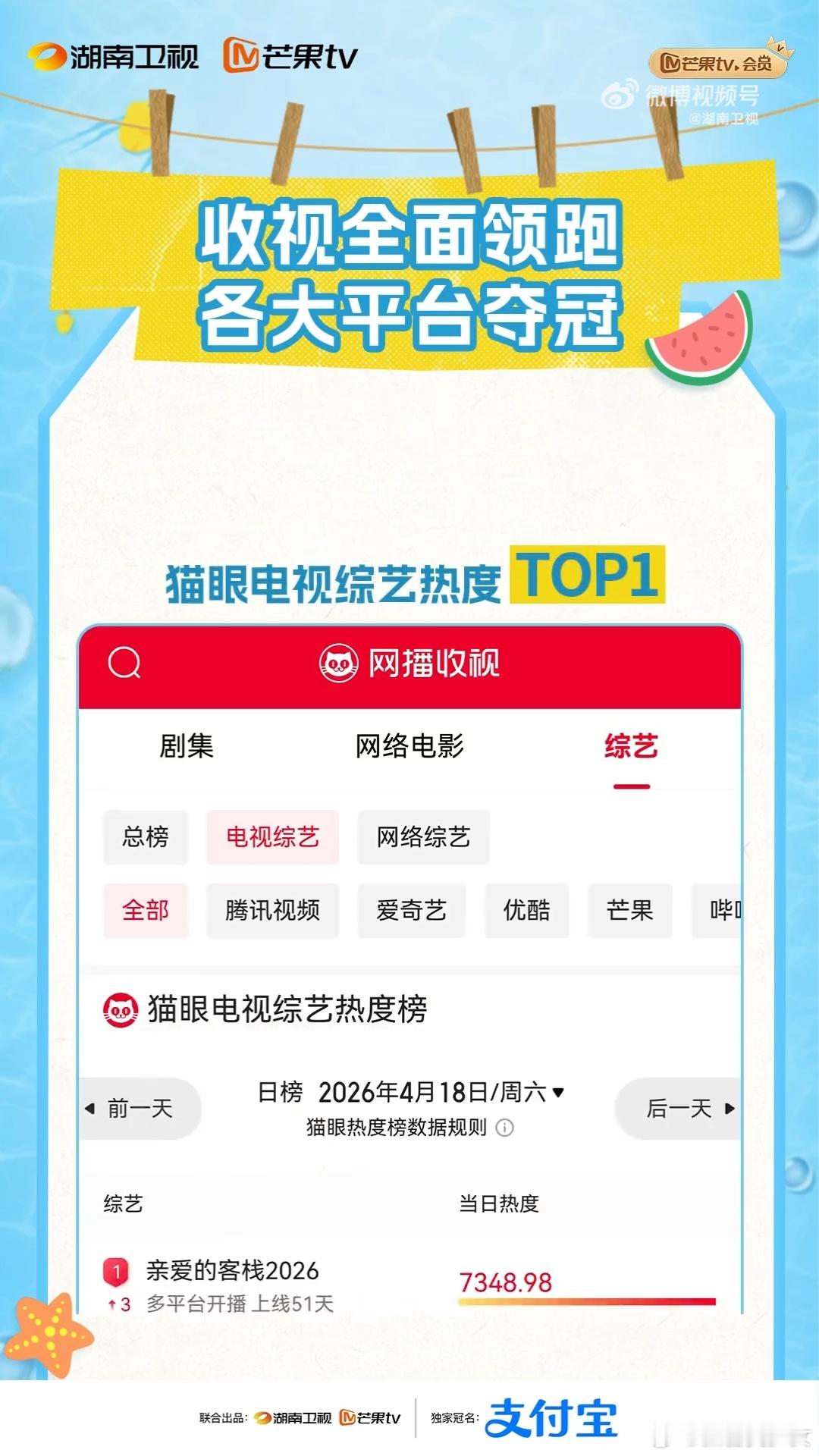 亲爱的客栈收视9连冠《亲爱的客栈2026》狂揽九连冠!CVB、欢网、酷云三网登顶,227+热搜刷屏,播放量与话题度双双爆表,东坡文化治愈叙事获官媒点赞,重塑慢综艺人文价值。亲爱的客栈