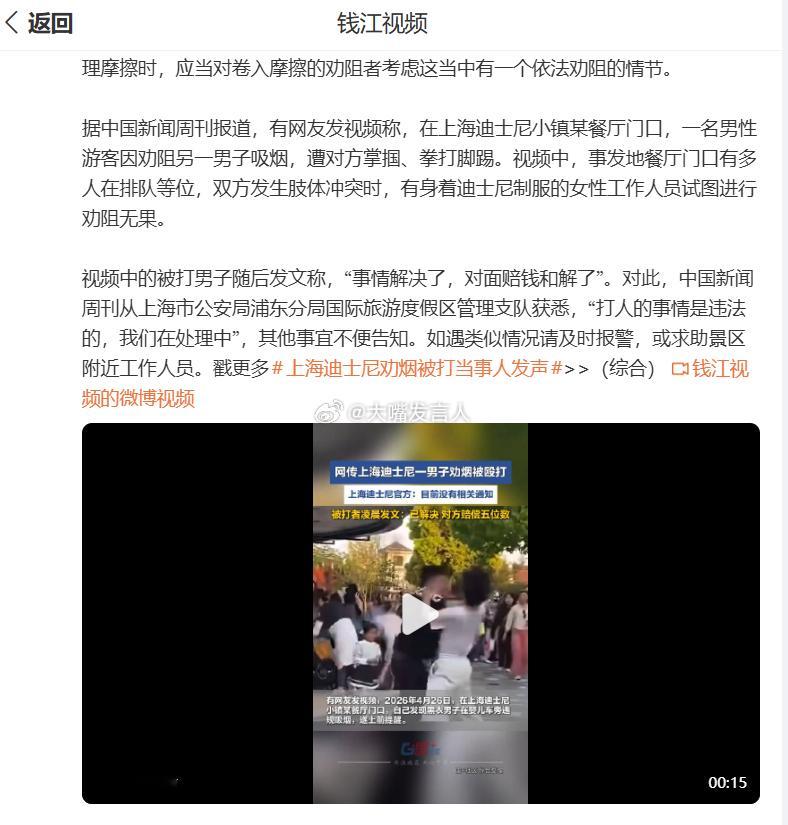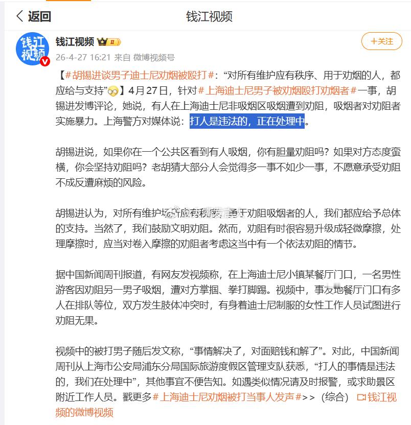胡锡进谈男子迪士尼劝烟被殴打劝烟时打人是违法的,劝烟时泼洒饮料也应该是违
