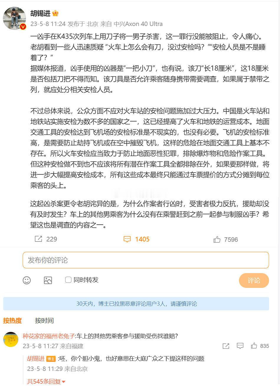 胡锡进谈男子迪士尼劝烟被殴打 劝烟时打人是违法的,劝烟时泼洒饮料也应该是违法的胡锡进说(图3),“我们鼓励文明劝阻”,还问道“如果你在一个公共区看到有人吸烟,你有胆量劝阻吗?”这让我想起胡锡进在2023年5月8日谈列车上歹徒行凶的一篇微博(图4),当时老胡反思到,“车上男乘客为什么没有在乘警赶到之前一起参与制服凶手”,结果评论区有人问老胡,“男乘客参与援助受伤找谁赔”,老胡机智地耍了一个流氓,回复到,“呸,你个胆小鬼,也好意思在大庭广众之下提这样的问题”你不得不服老编辑,在问答时耍流氓耍得如此丝滑上海迪士尼男子被劝烟殴打劝烟者,上海迪士尼男子劝烟反遭殴打 ,热点观点