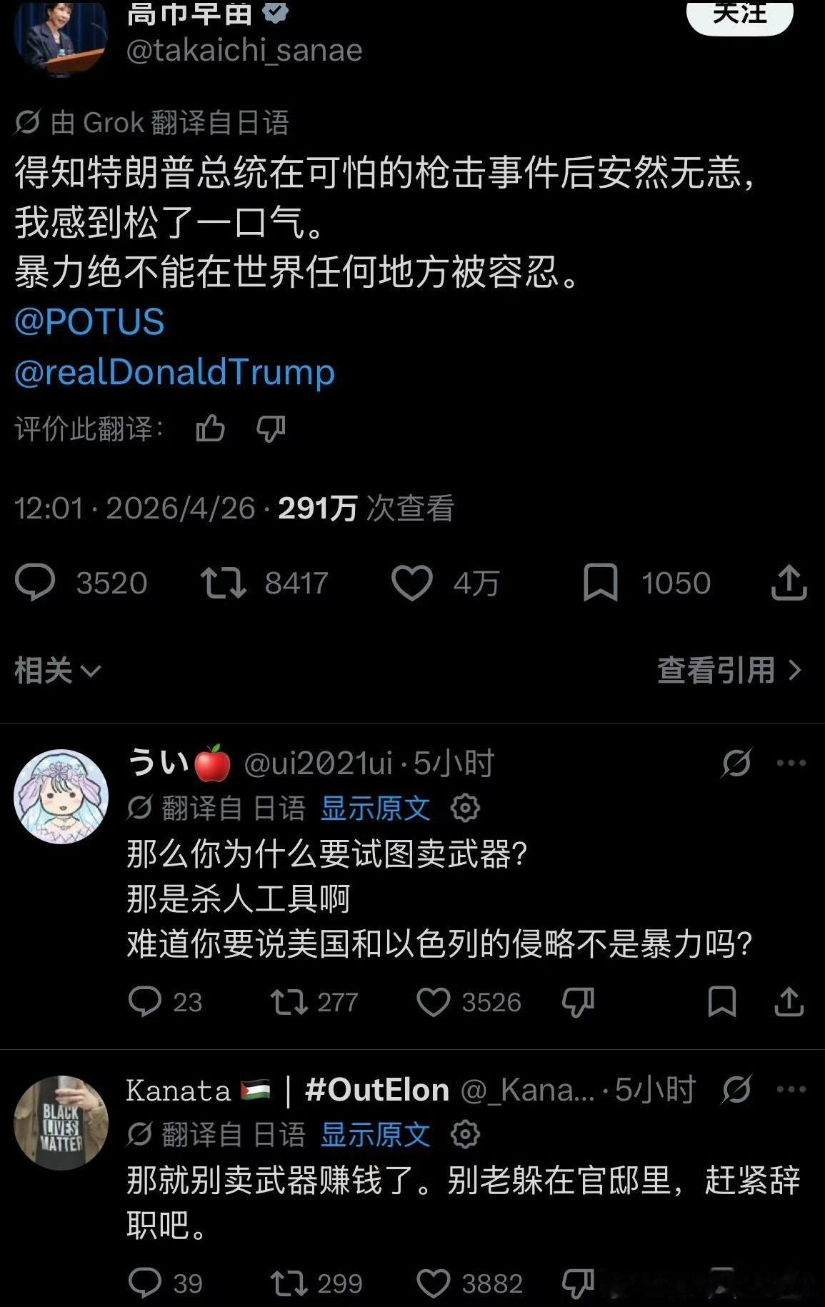 白宫晚宴枪击事件中,特朗普总统及夫人安然无恙,虽然目前无法判断枪击事件的原因,但向特朗普表忠心的可不少,但有些表忠心的话总是前后矛盾,就像是讽刺,比如高市早苗第一时间就发了帖文: 得知特朗普总统在可怕的枪击事件后安然无恙,我感到松了 口气。暴力绝不能在世界任何地方被容忍。 高市早苗最后那句话让日本网友自己破防了,在评论区质问高市早苗:那么你为什么要试图卖武器?那是杀人工具啊。 难道你要说美国和以色列的侵略不是暴力吗?那就别卖武器赚钱了。别老躲在官邸里,赶紧辞职吧。 高市早苗肯定是不会看评论区的,就算看了也会装瞎,说话前后矛盾,那是必备功能。