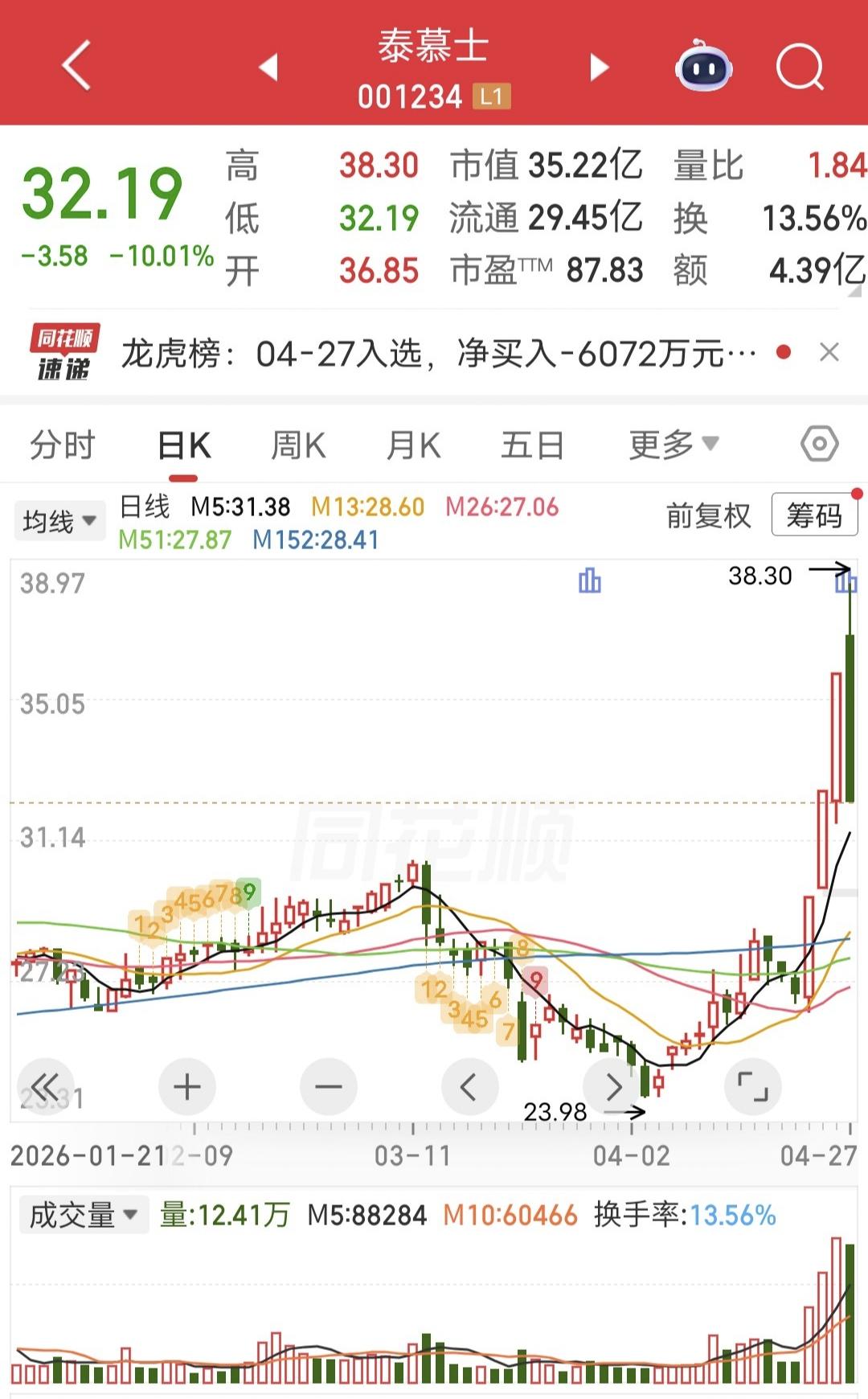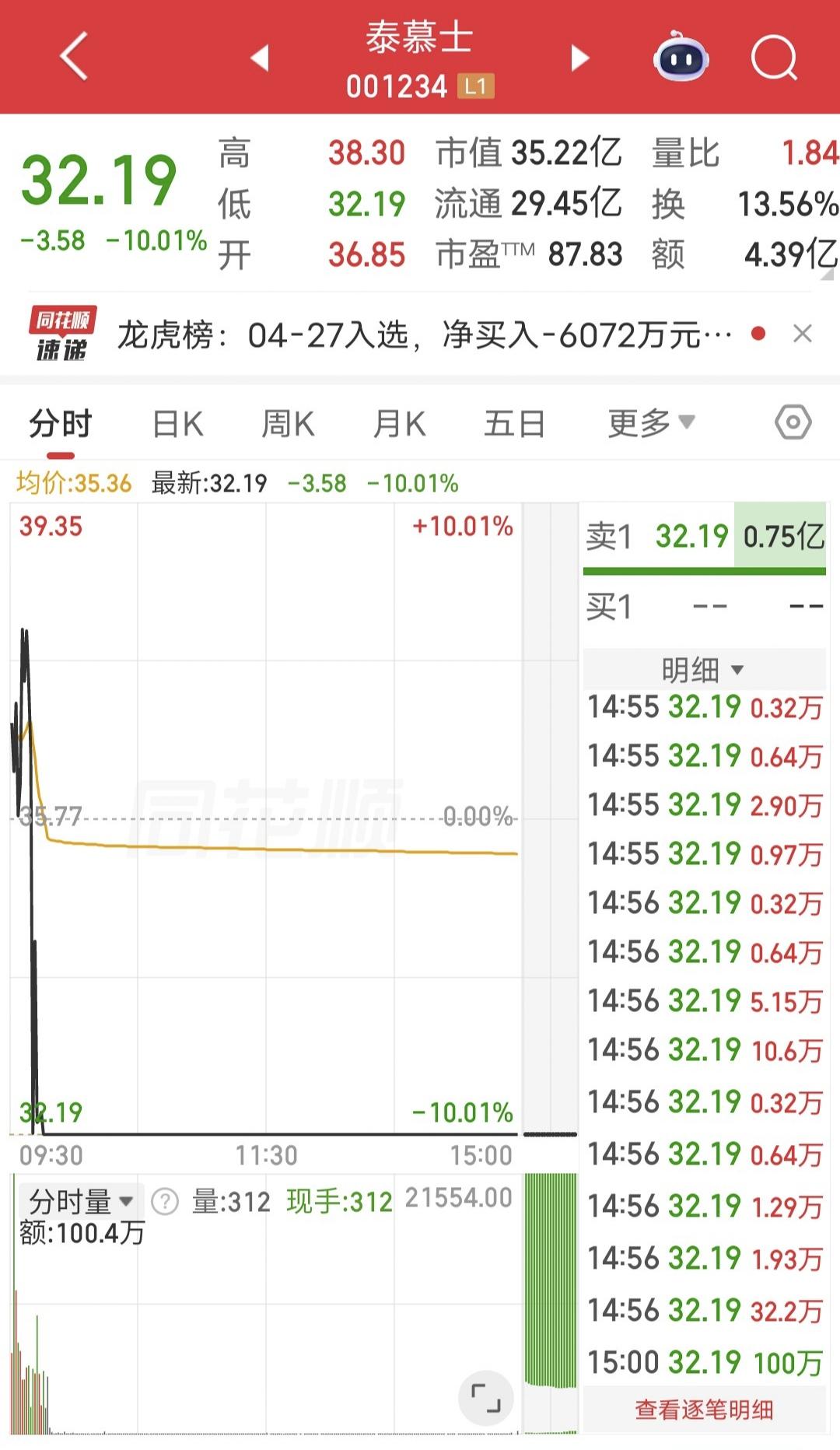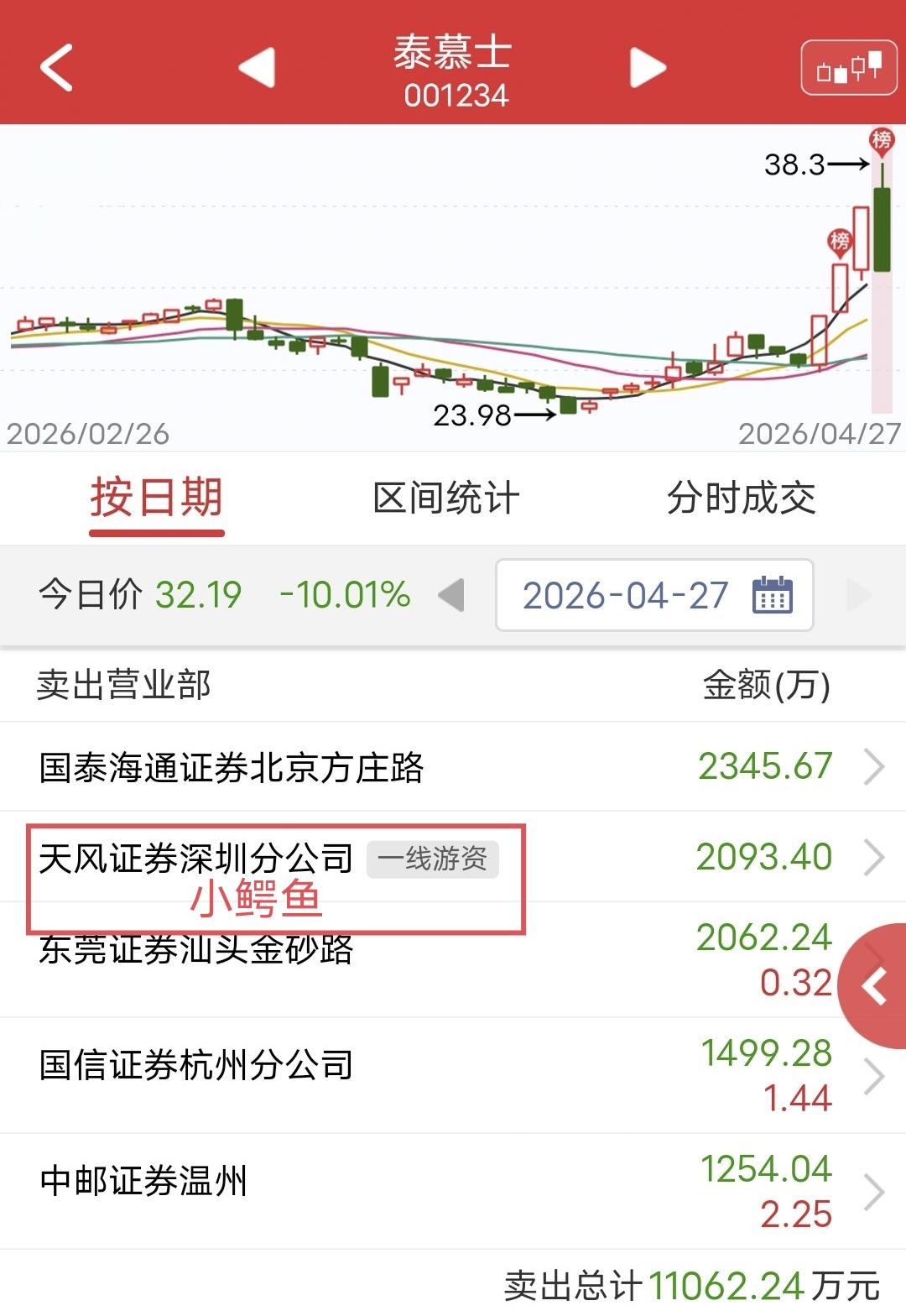 瀑布杀,小鳄鱼跌停割肉! 今天短线接力方面成为重灾区,比如3板泰慕士今天断板即跌停。 盘后龙虎榜显示,小鳄鱼卖出2000万,该股全天成交4.39亿,占比4.7%。 早盘冲板失败后瀑布下杀摸地板,太惨了。